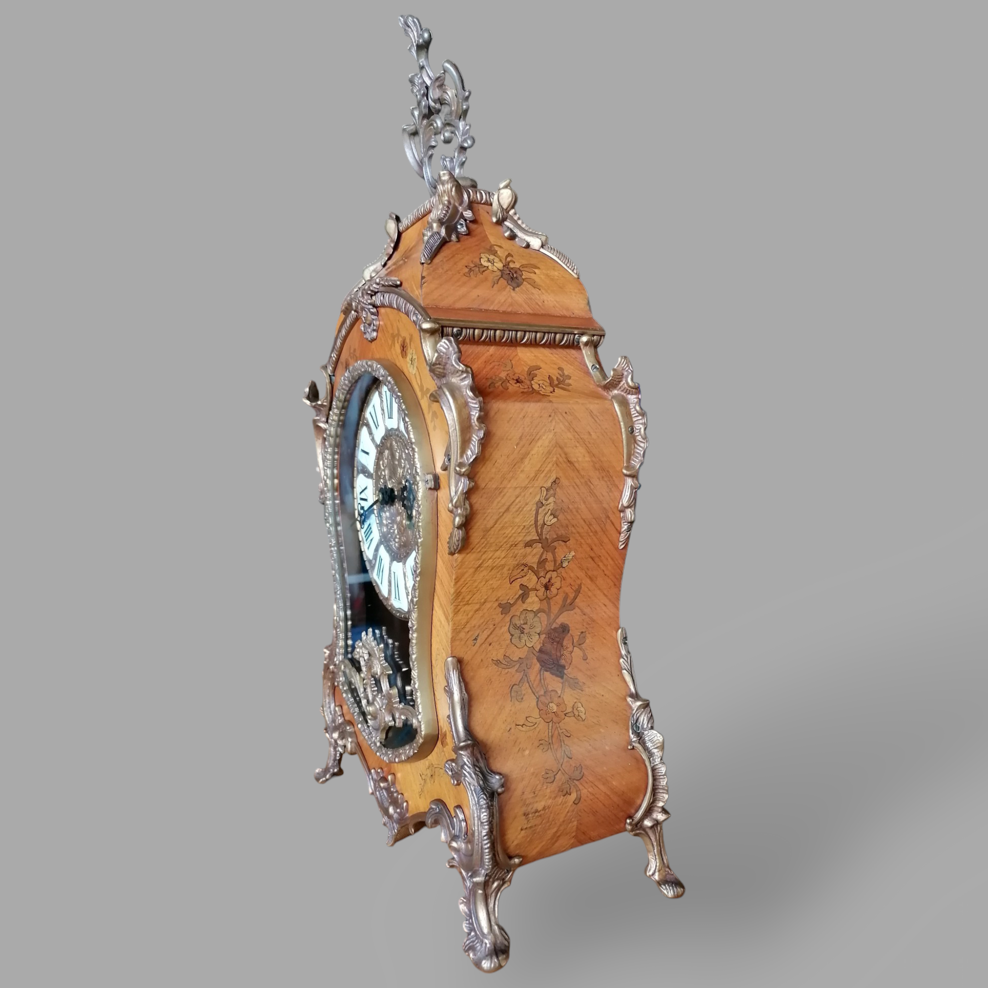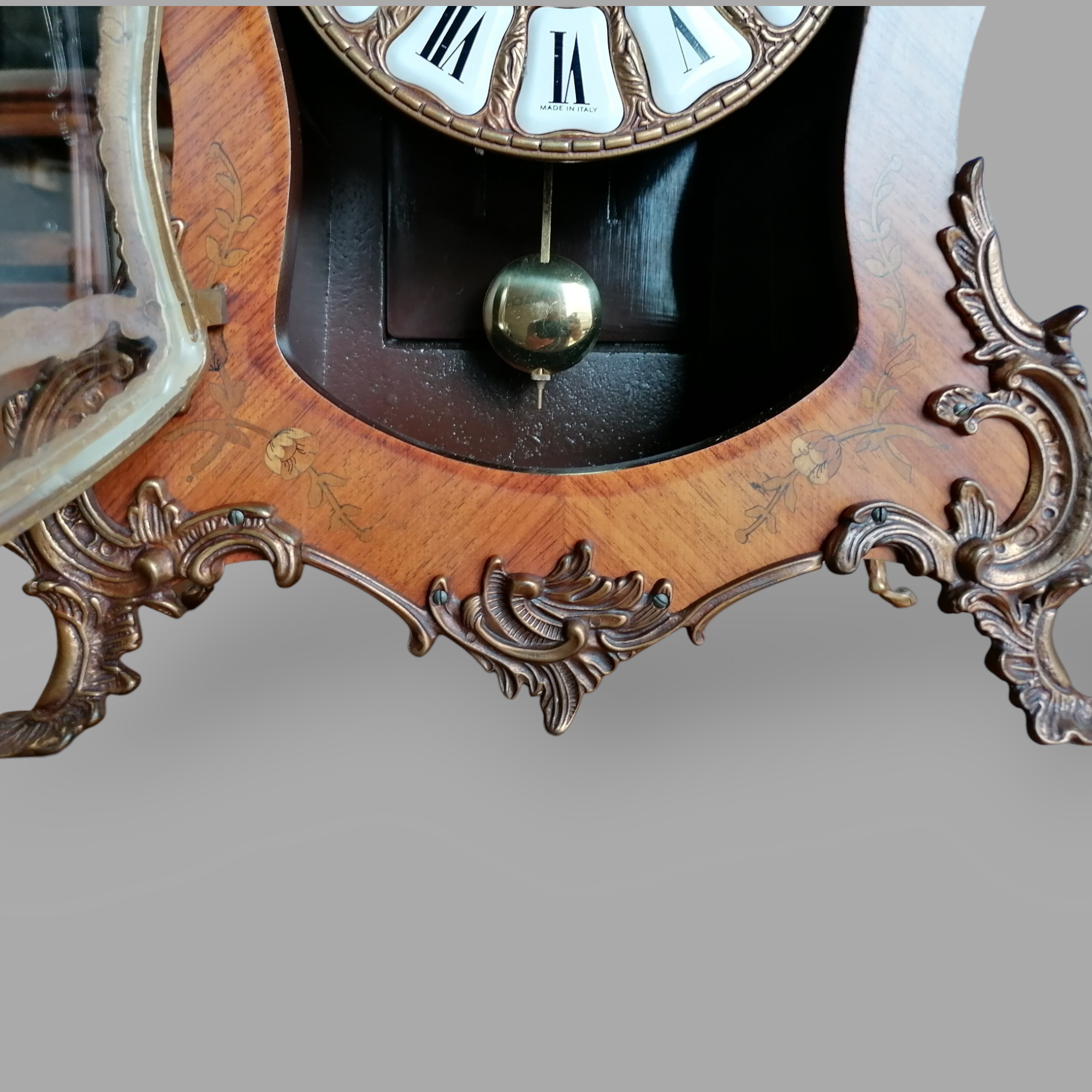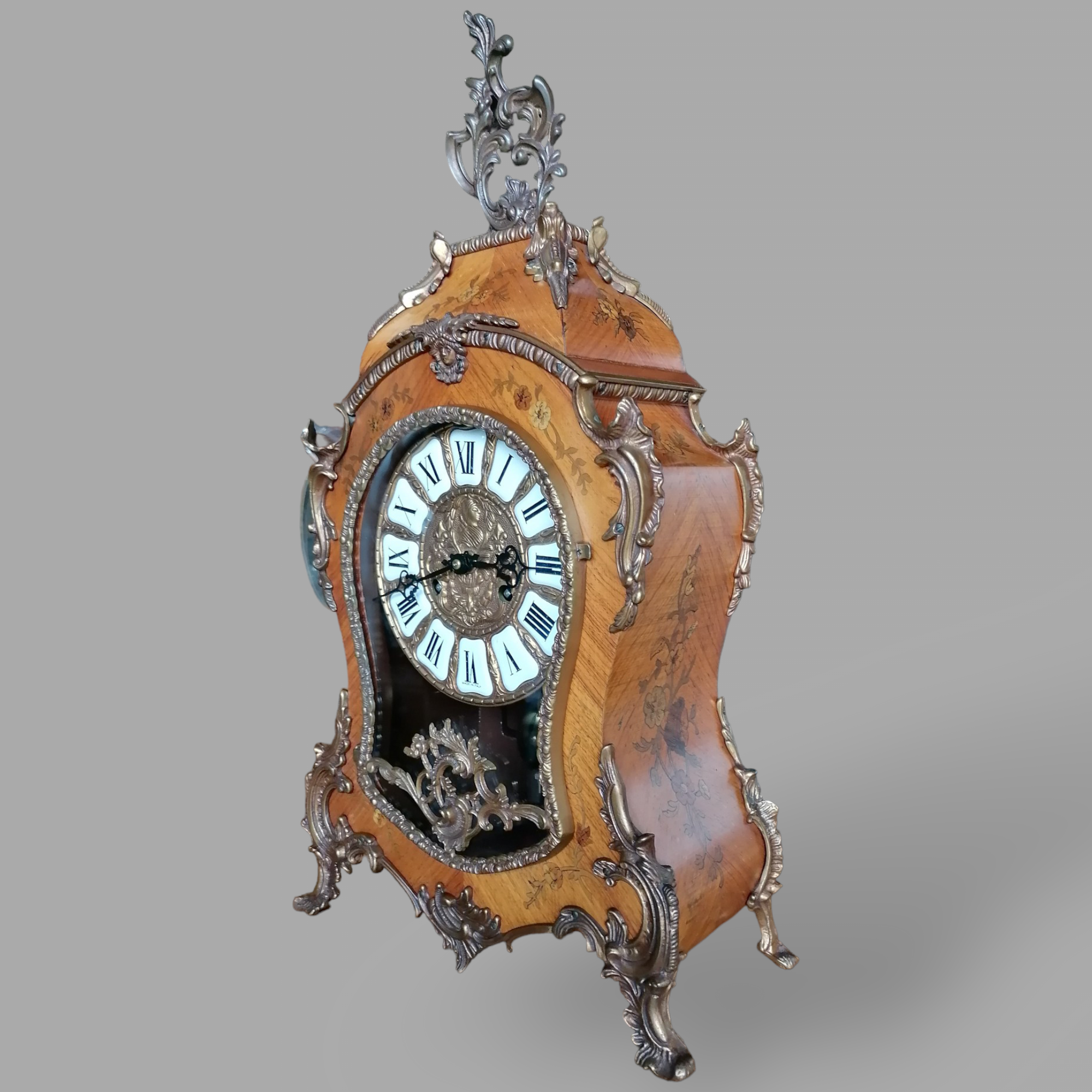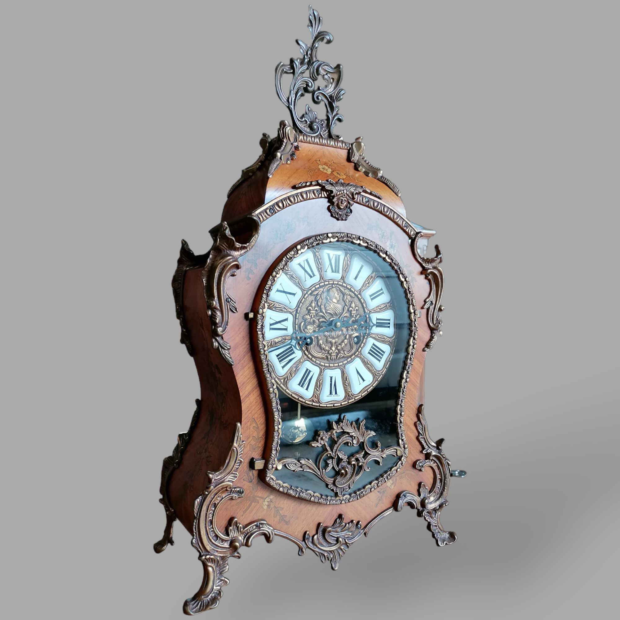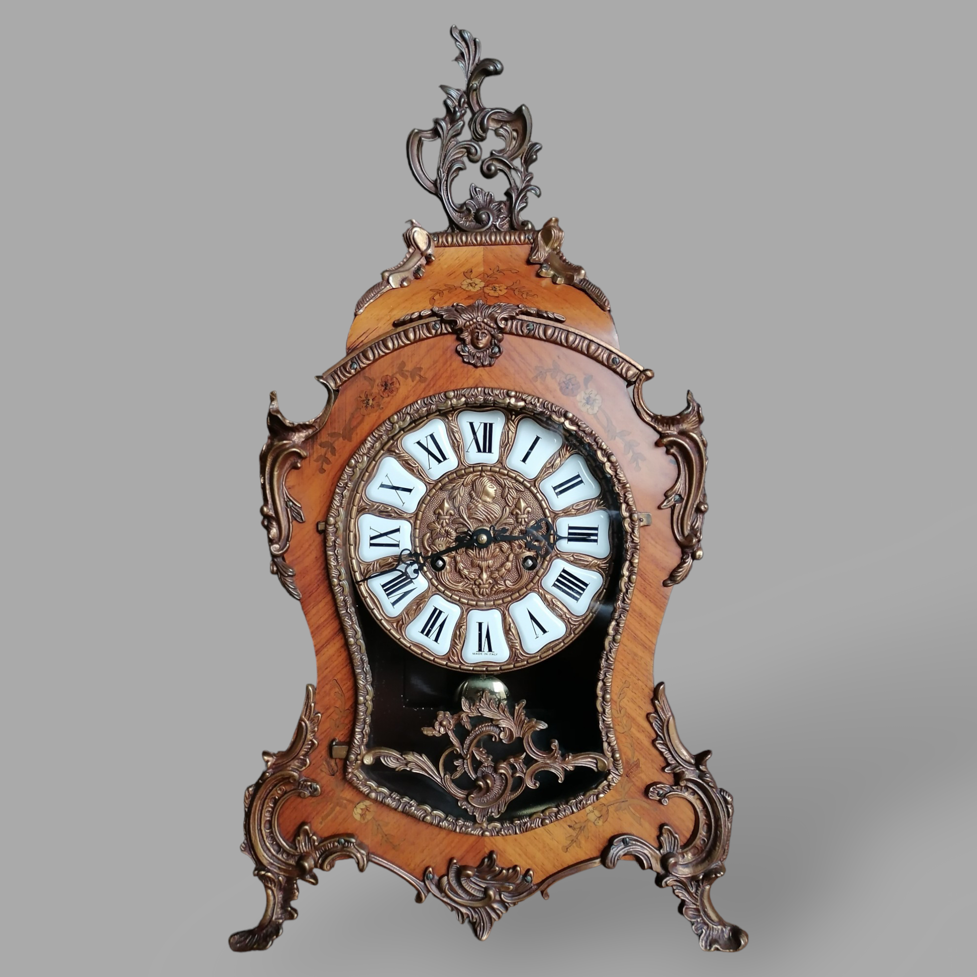 Boulle kandalló óra gyönyörű állapotban. Dió színben, díszes intarzia berakásokkal minden oldalról. Gazdagok díszített réz lábakon áll, körben réz veretekkel és csúcsdísszel. Különleges darab, a szoba éke lehet. Az óra leszervizelt állapotban kerül átadásra.