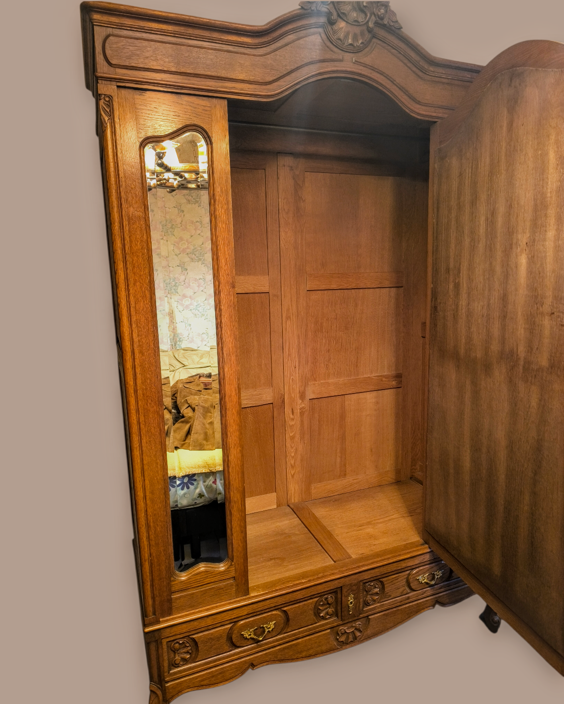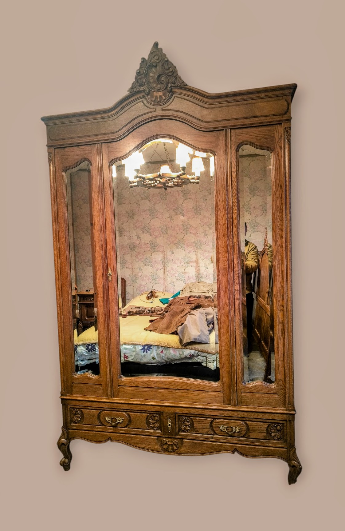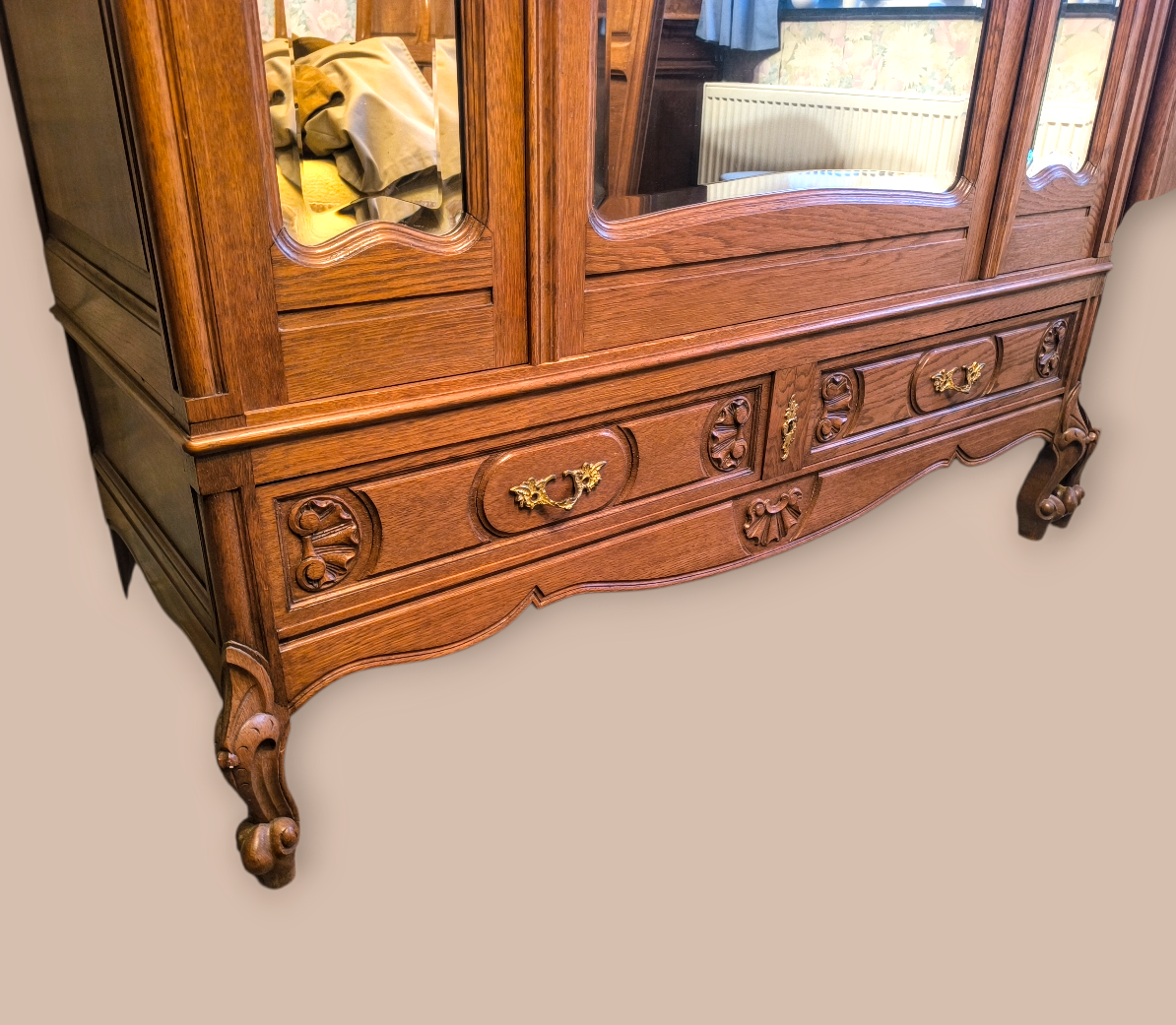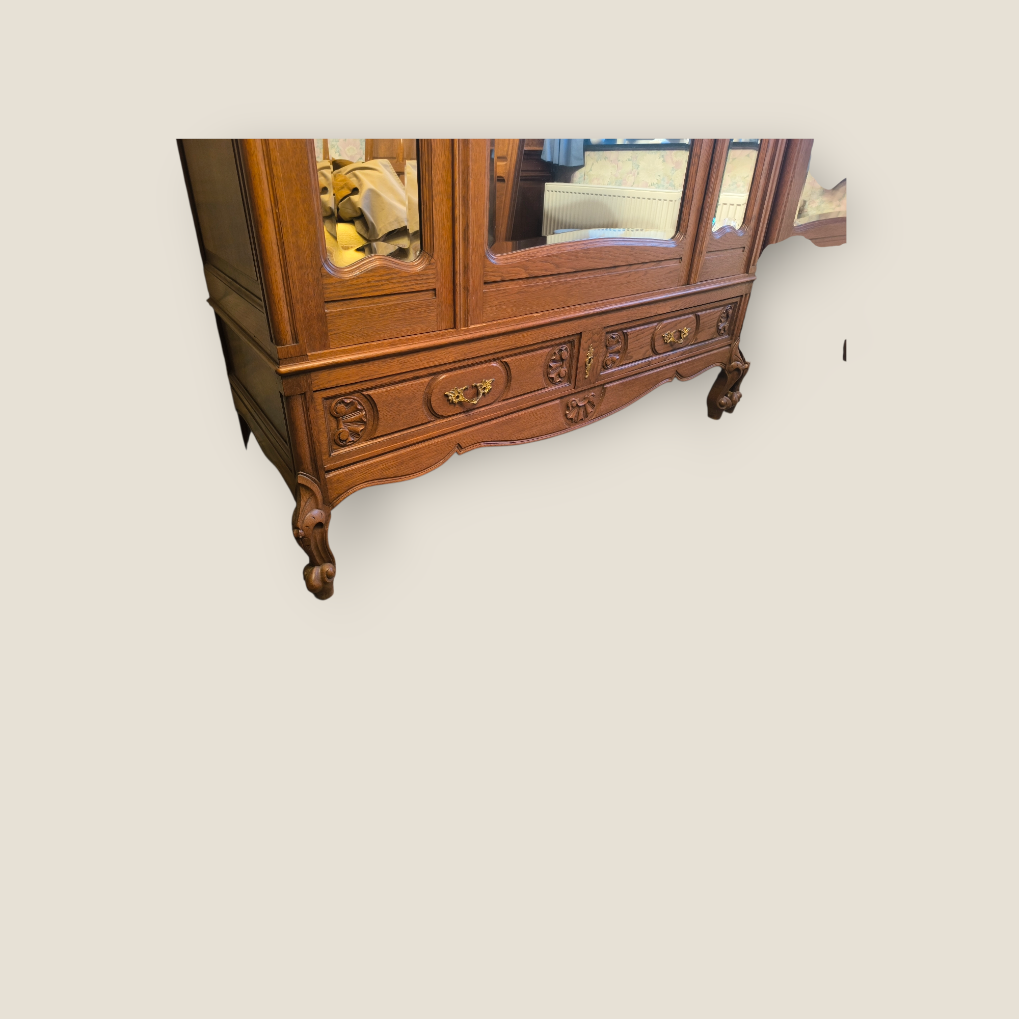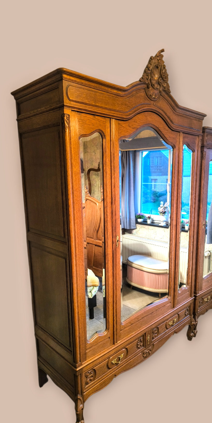 Eladásra kínálunk egy antik ,barokk stílusú 3 ajtós tükrös ruhás szekrényt,gardróbot .