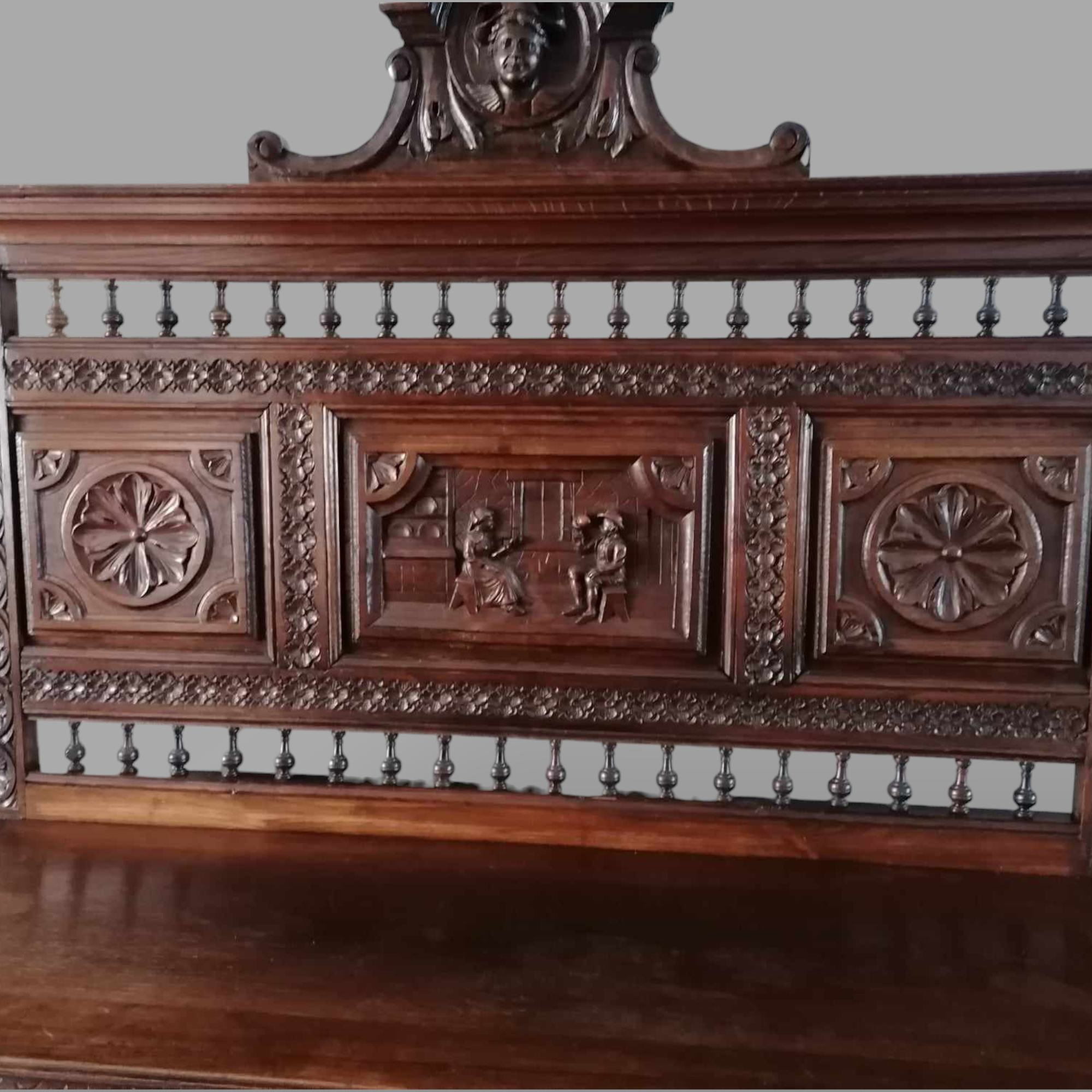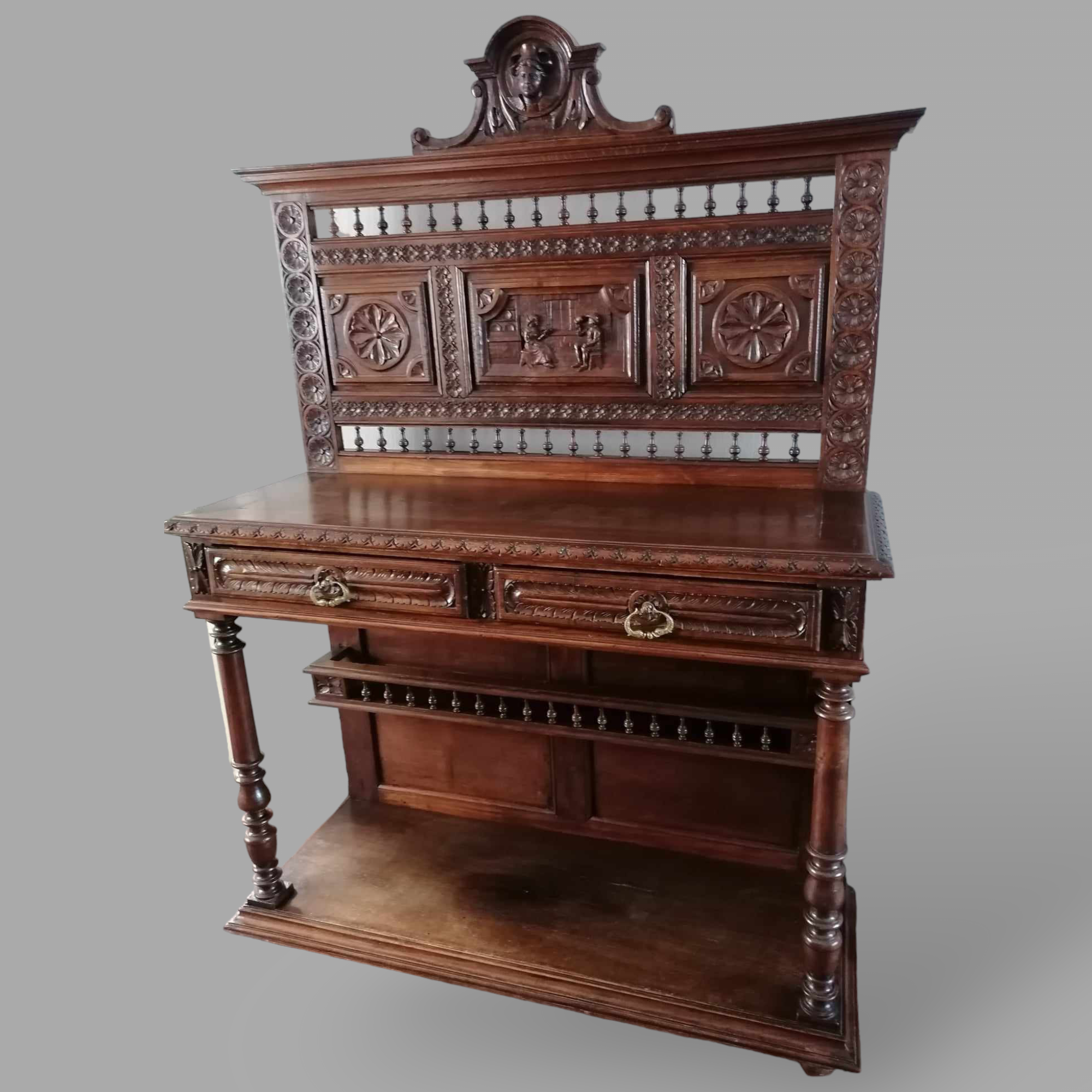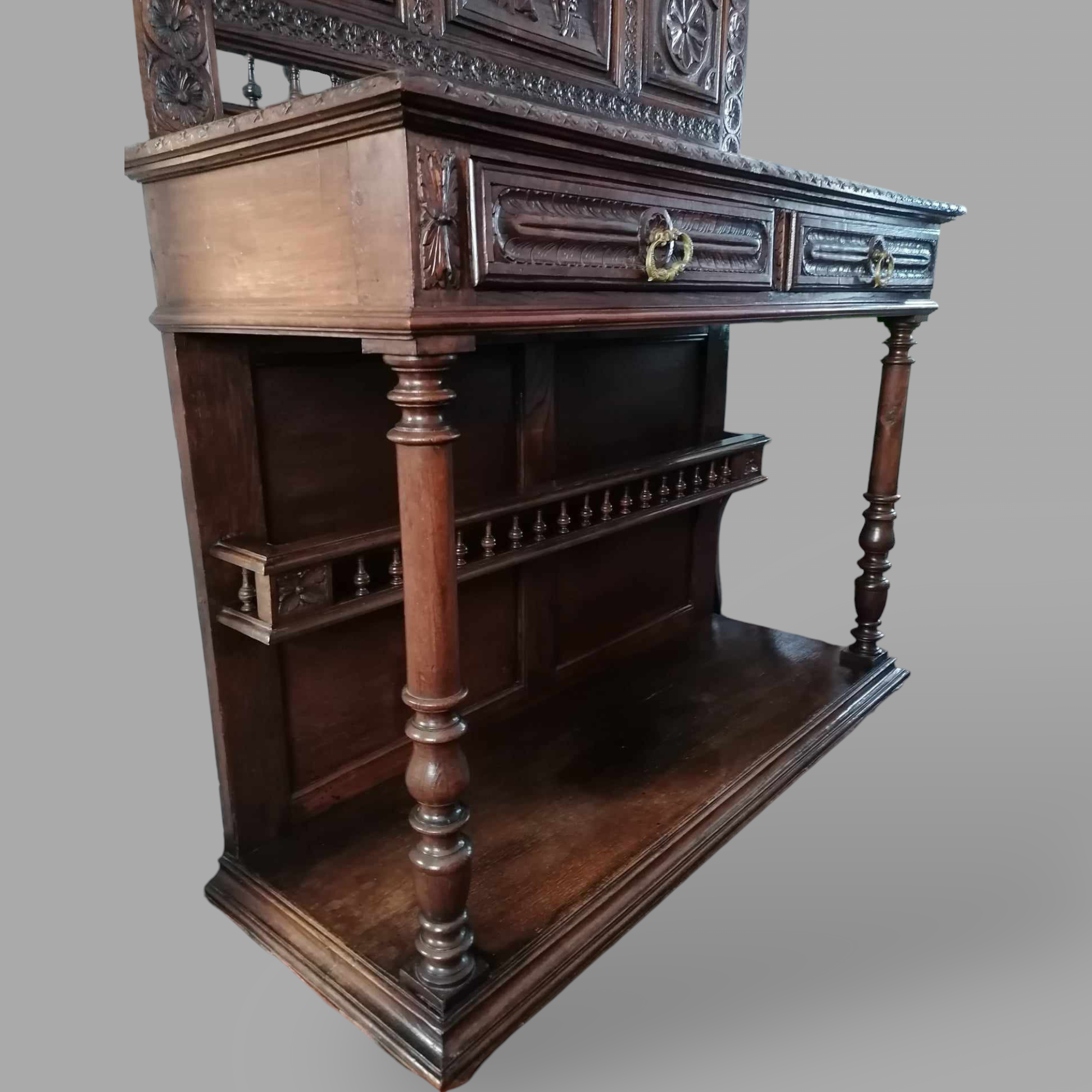 Antik breton neoreneszánsz komód, pohárszék szép állapotban. Alul nyitott kivitel, középen két fiókkal, majd a tetején a dúsan faragott hátfallal. Igazán különleges darab, egyedi megjelenéssel, igény esetén tudok ajánlani hozzá étkező garnitúrát vagy találó szekrényt is ugyanilyen stílusban.