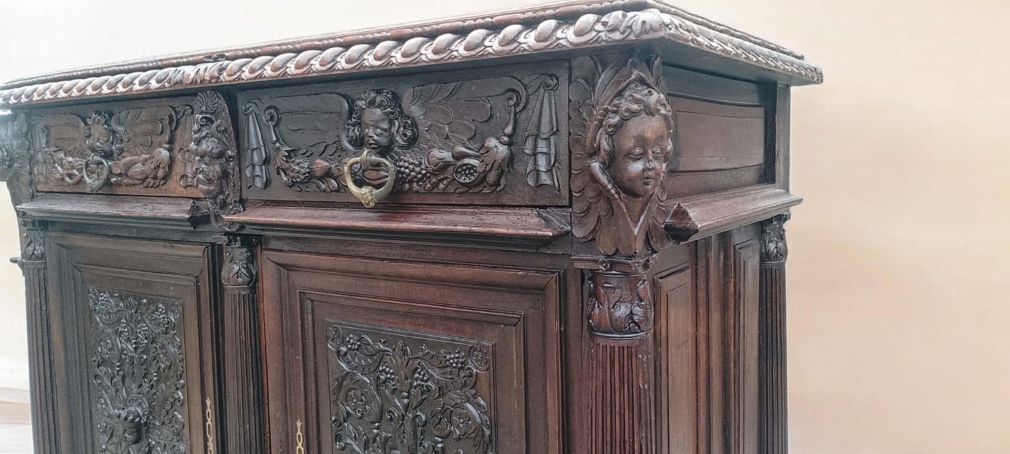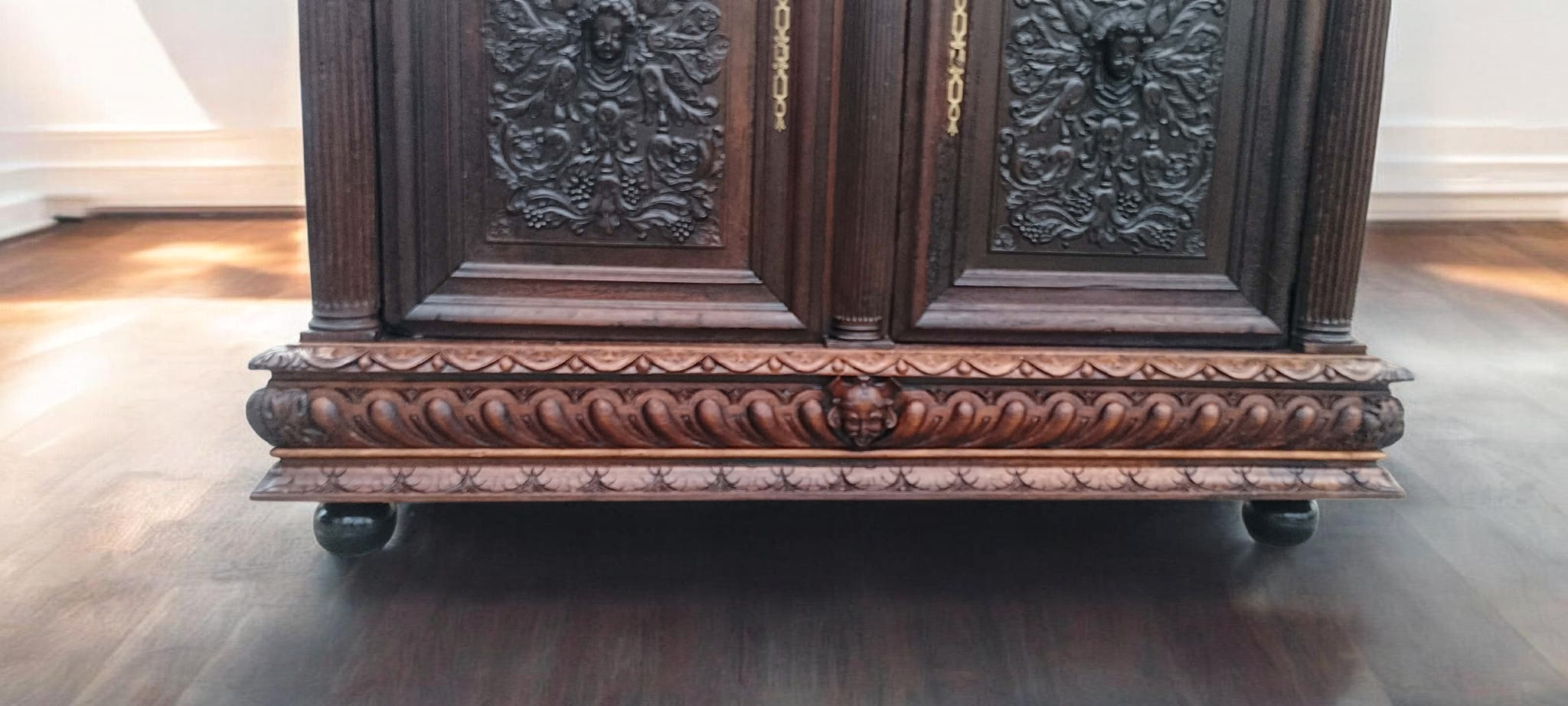 A bútor a 19. század végéről származik, anyaga nemes tölgyfa.