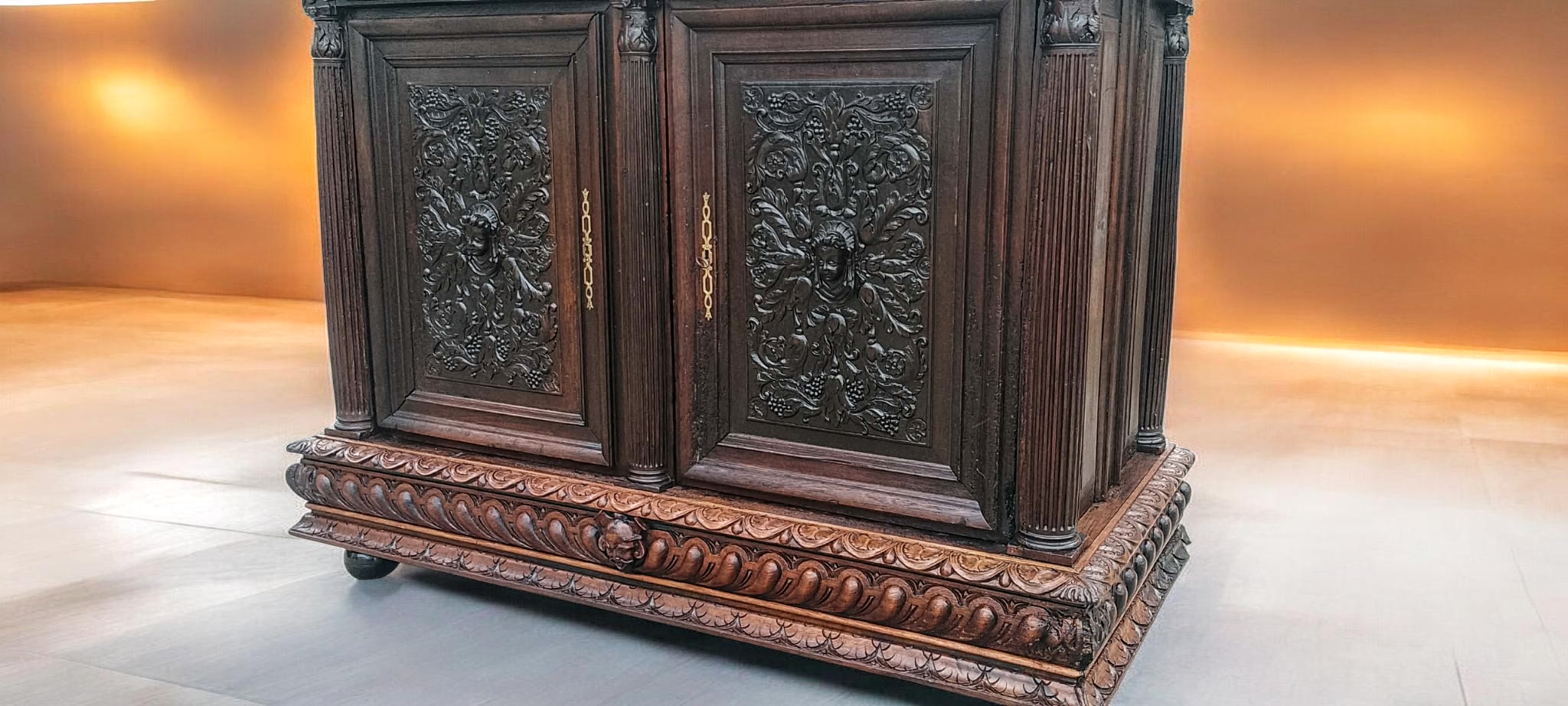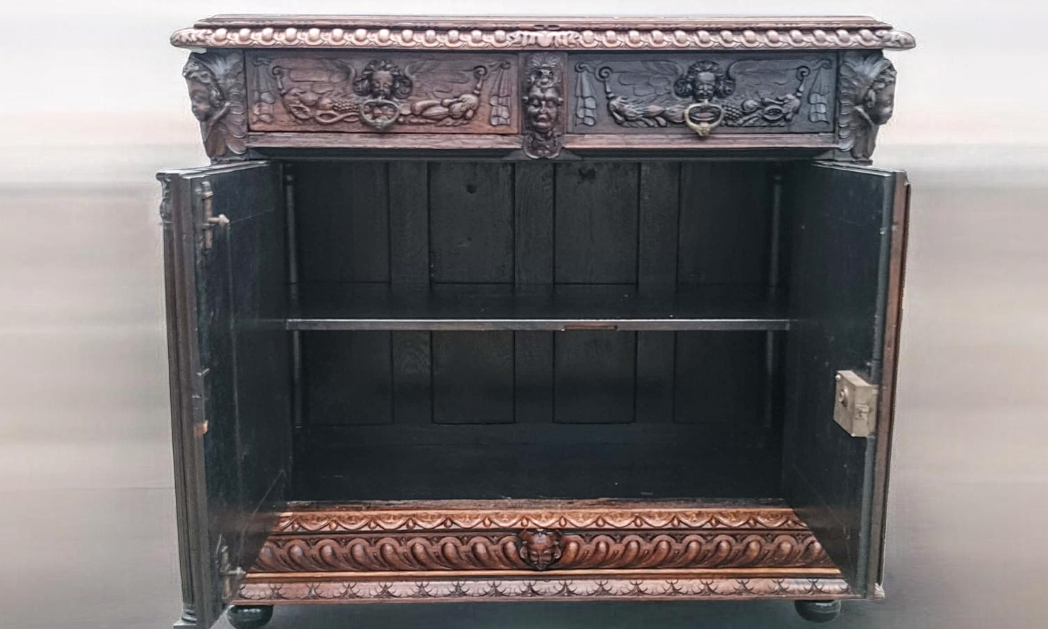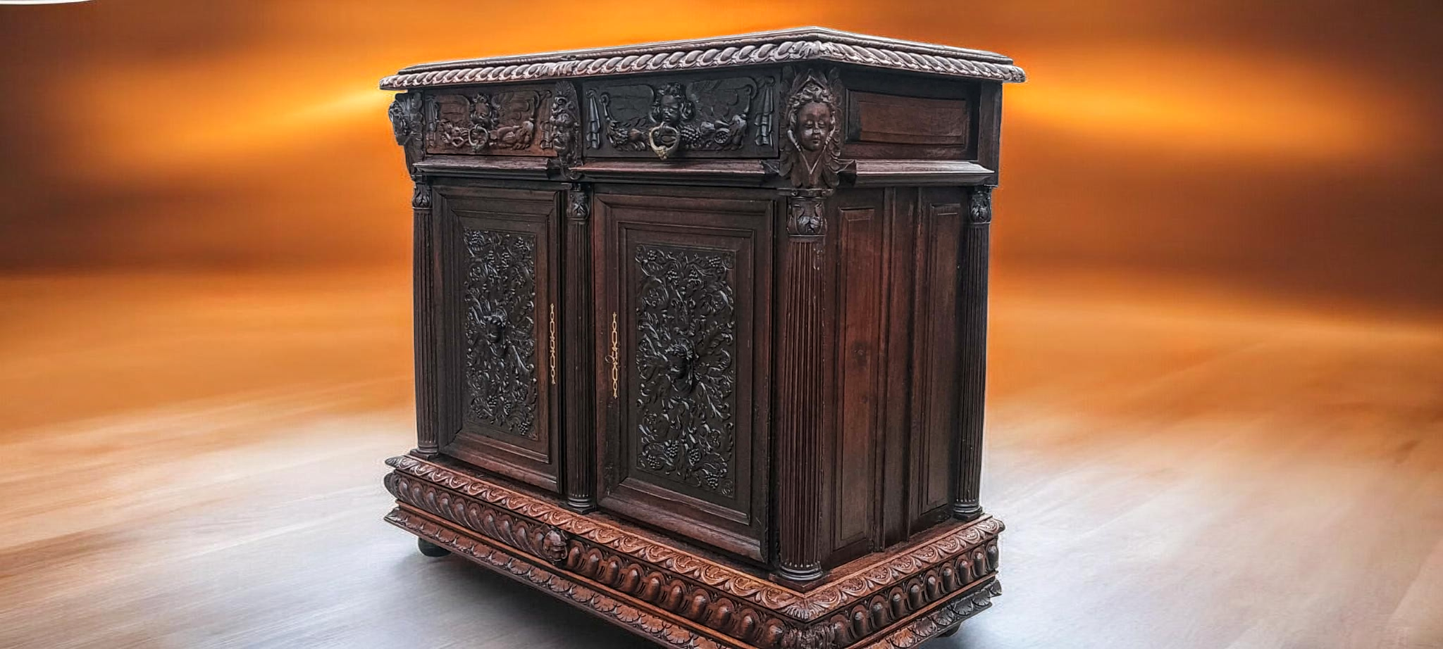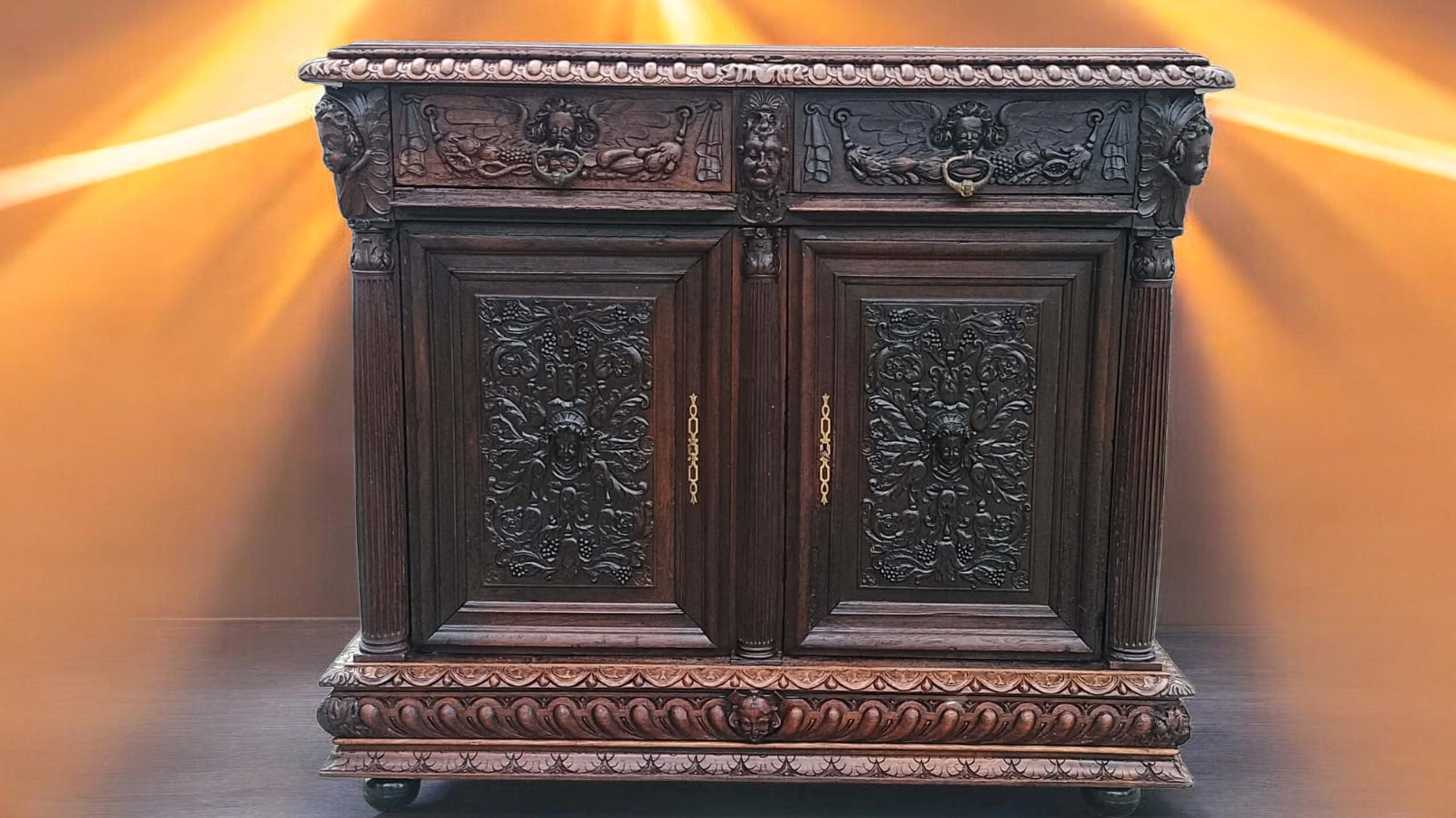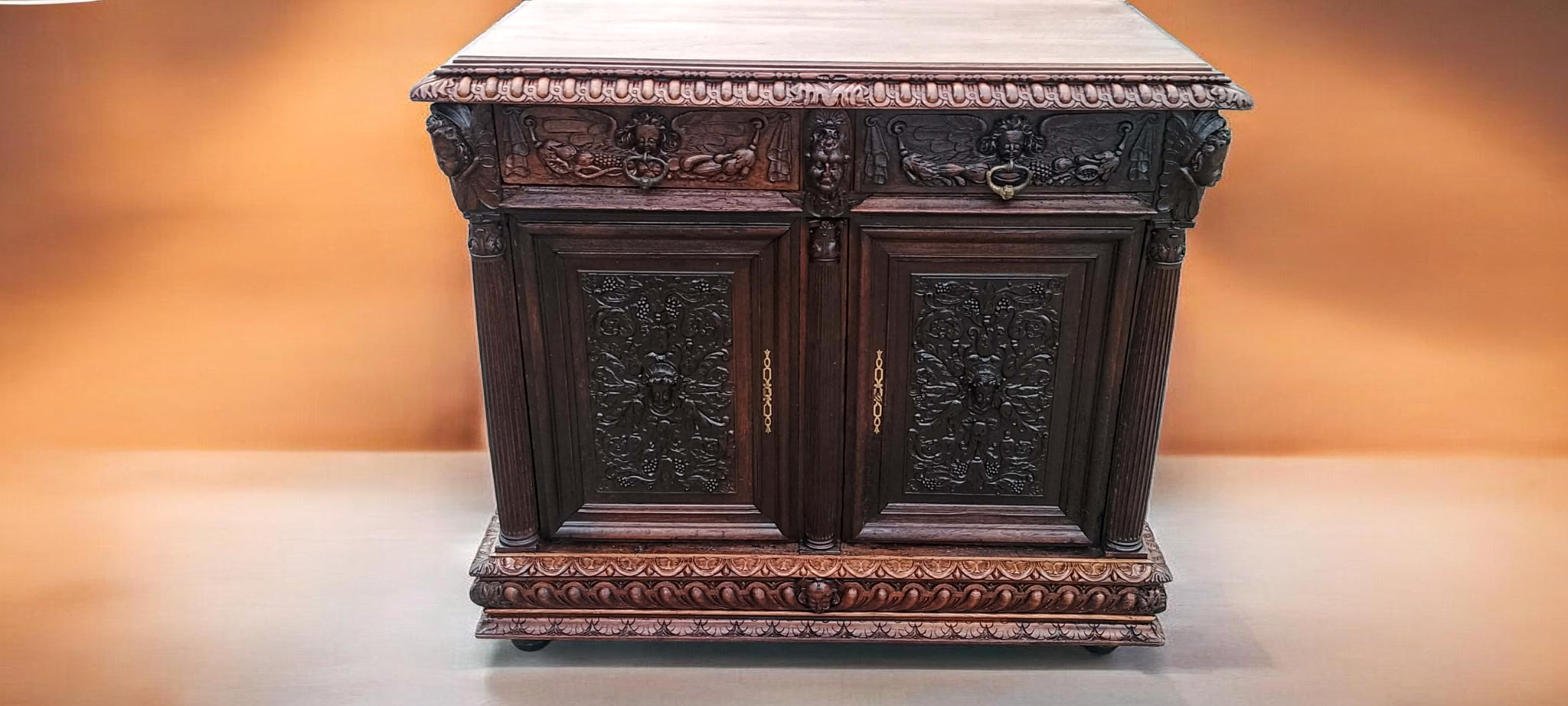 Eladó a képeken látható, lenyűgöző megjelenésű, felújított neoreneszánsz stílusú antik komód.