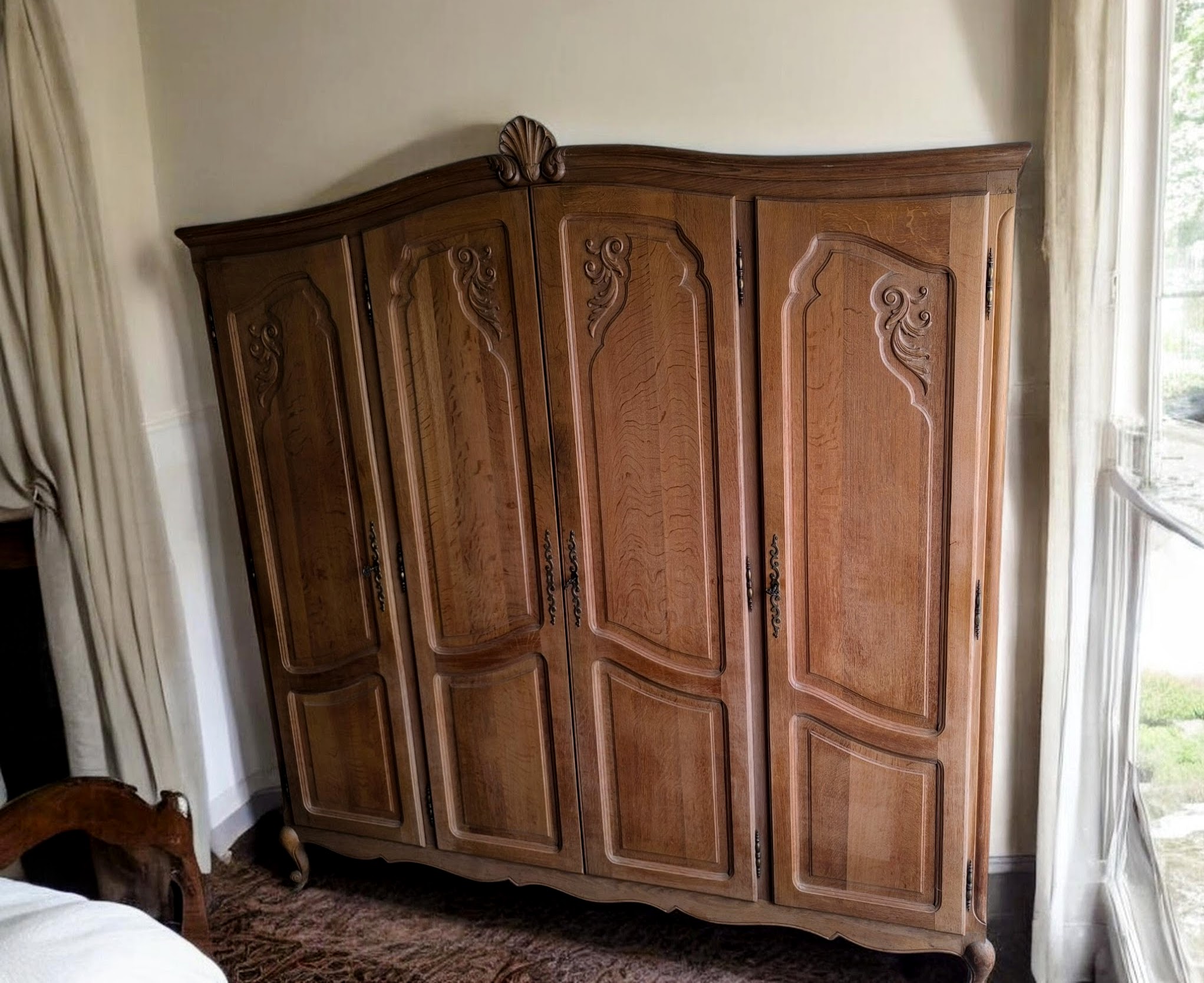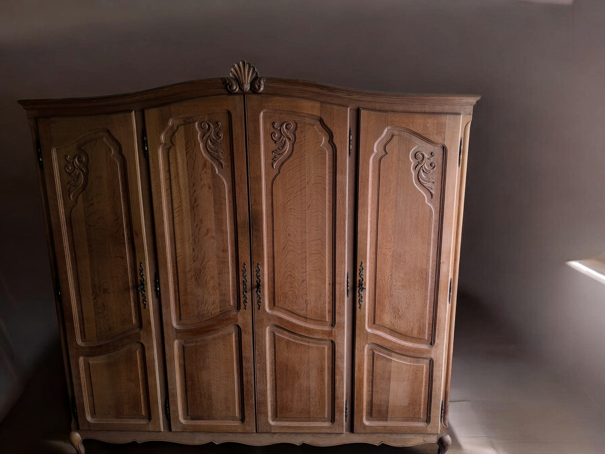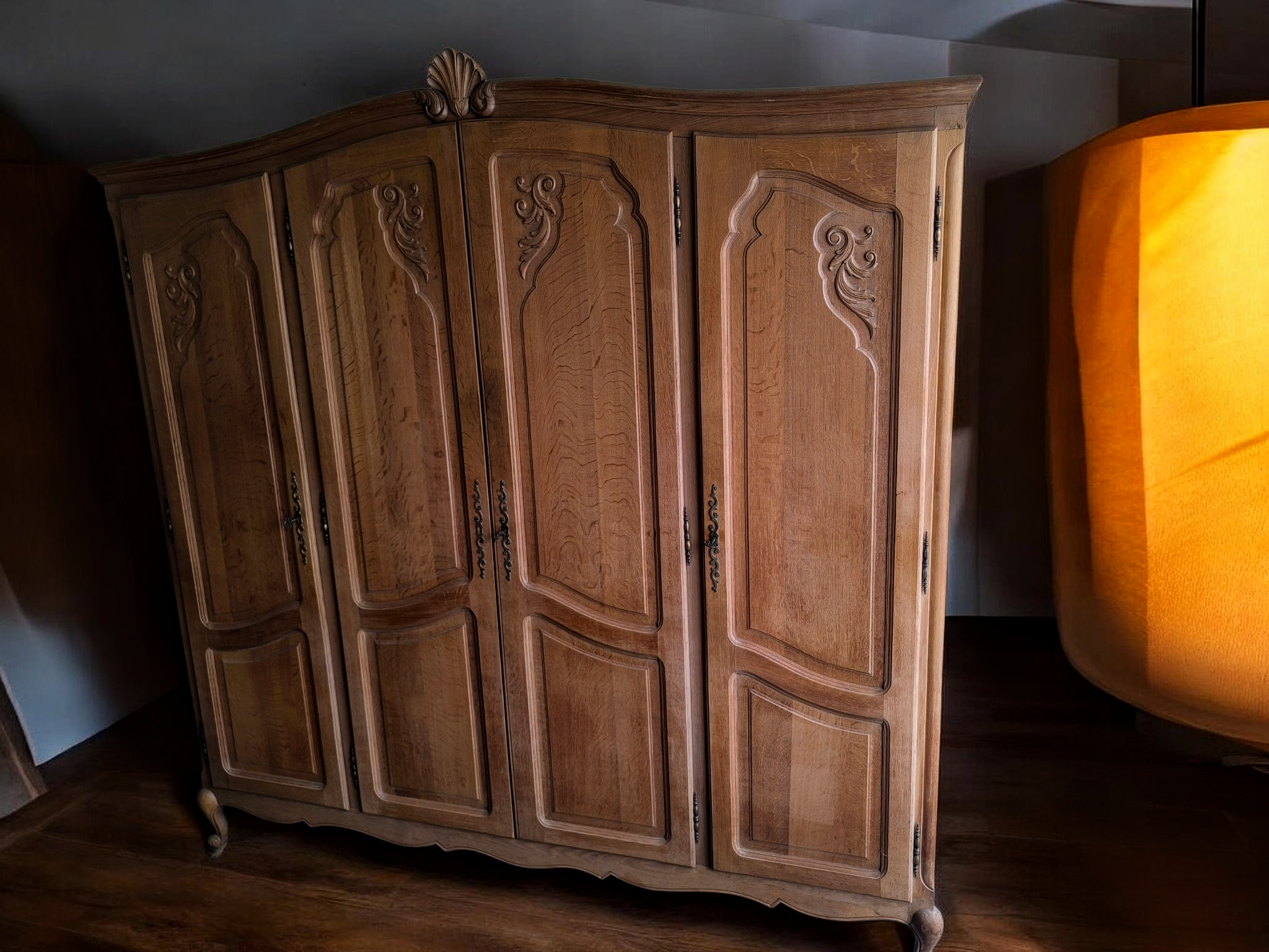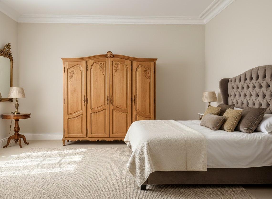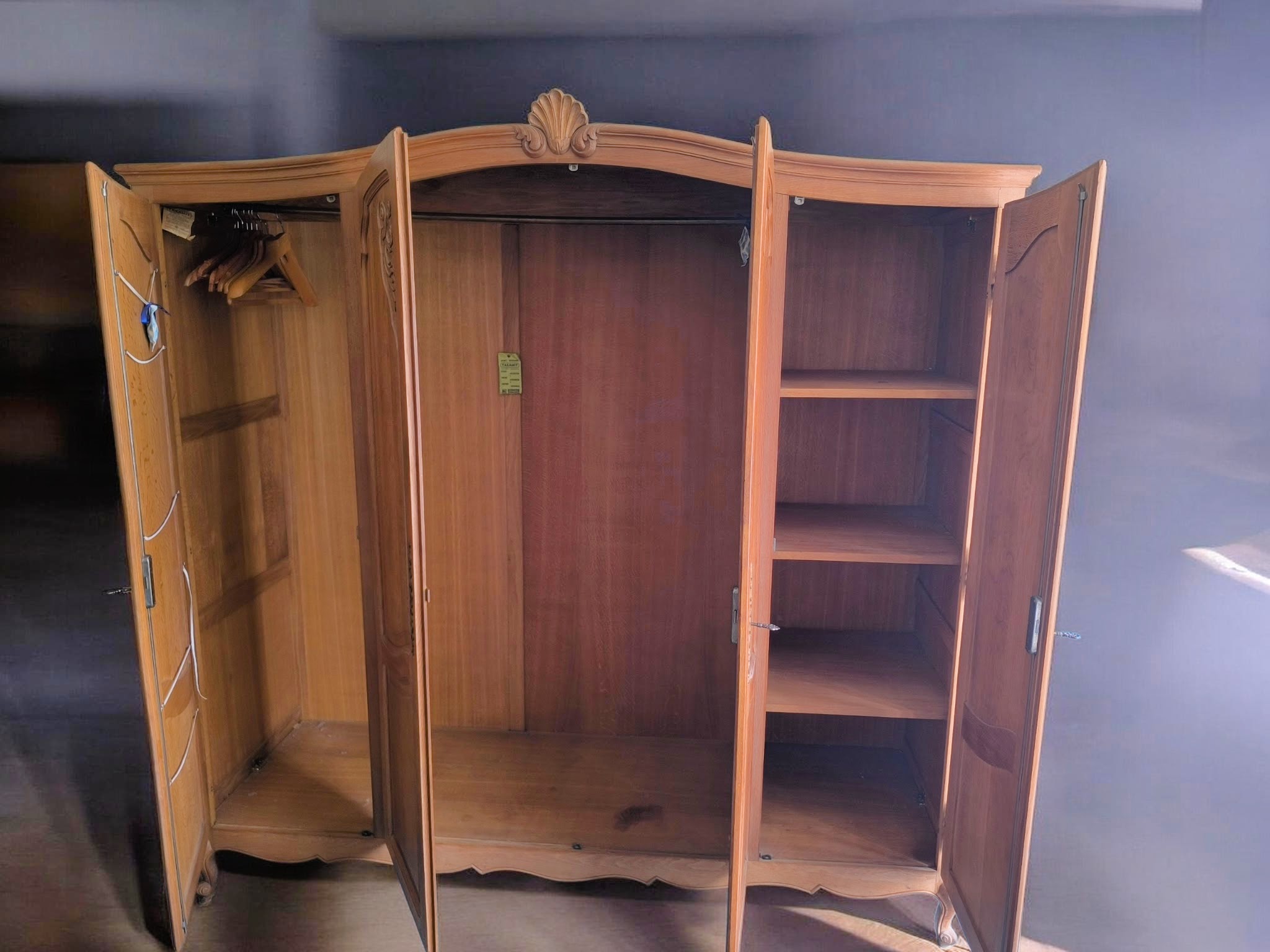 4 ajtós kivitel, gazdagon faragott ajtóbetétekkel és díszes tetővonallal.Belül akasztós és polcos kialakítású.