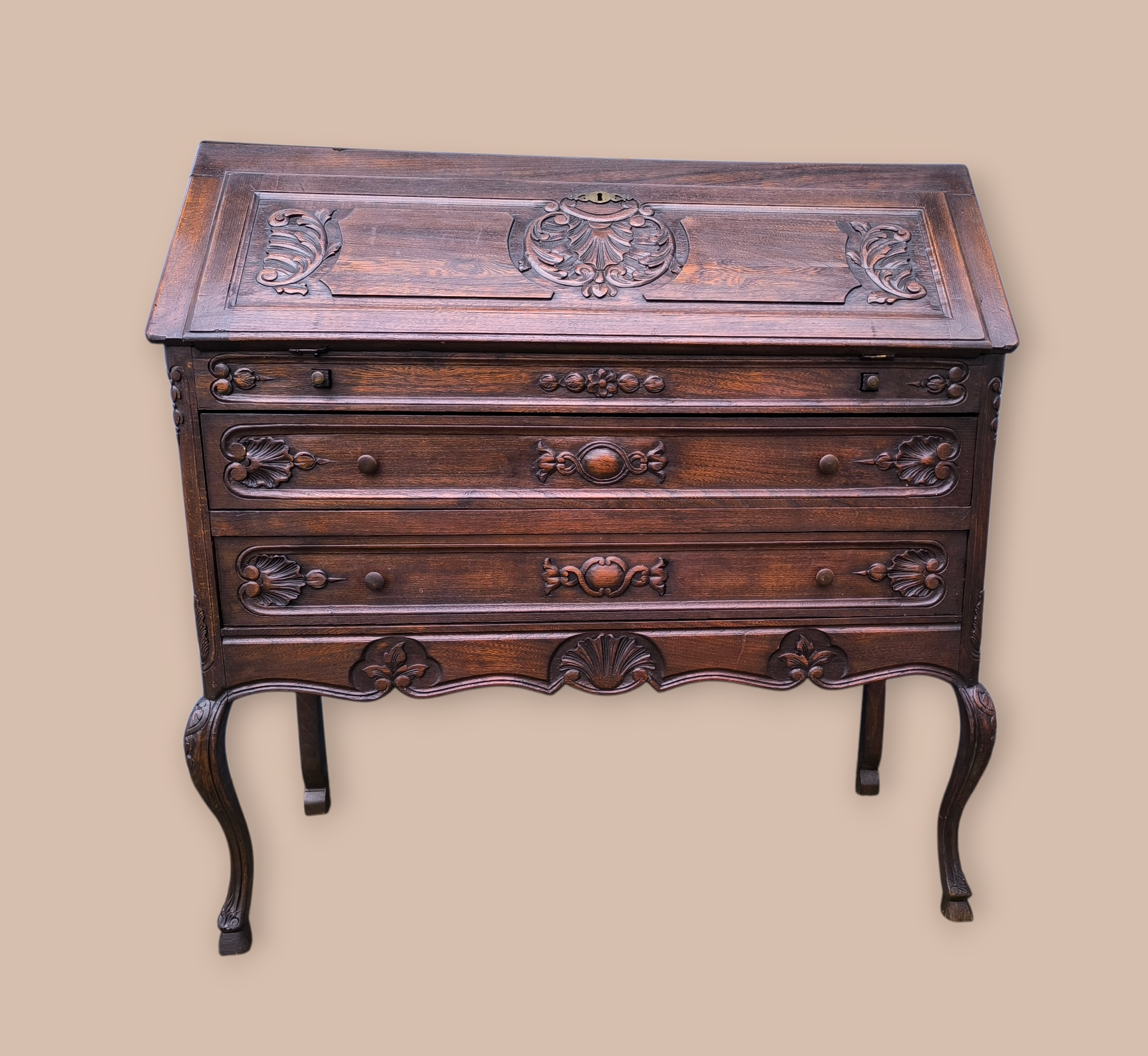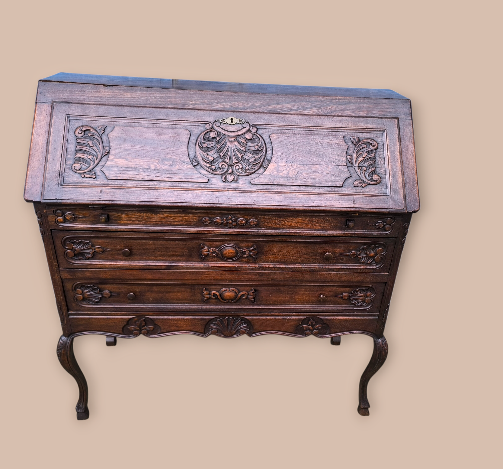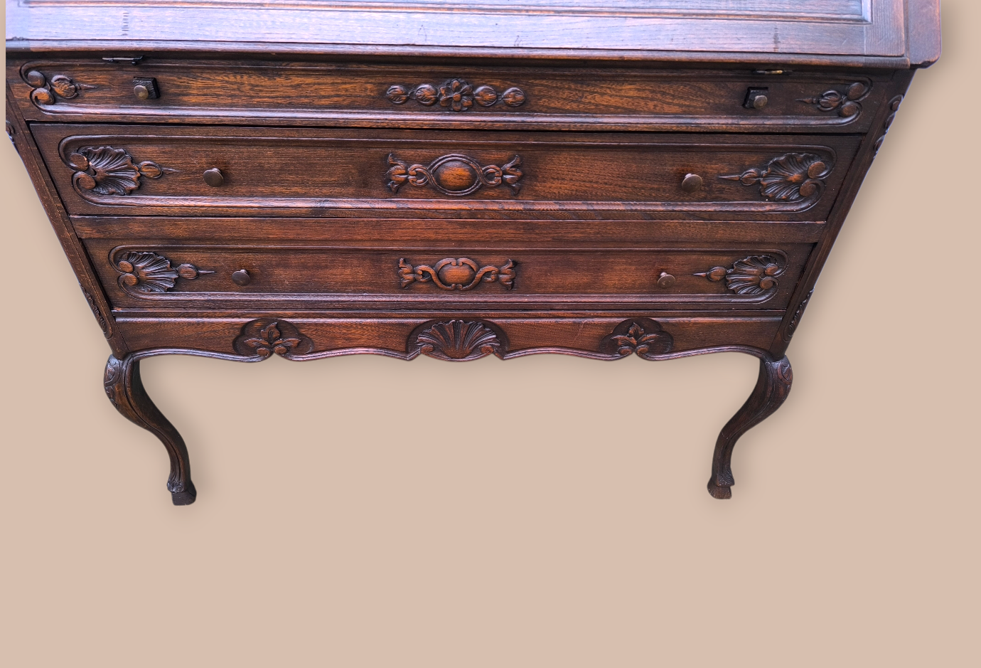 Eladó egy antik ,neobarokk stílusú 2 fiókos szekreter. Kecses ívelt lábakkal, alul 2 fiókkal.