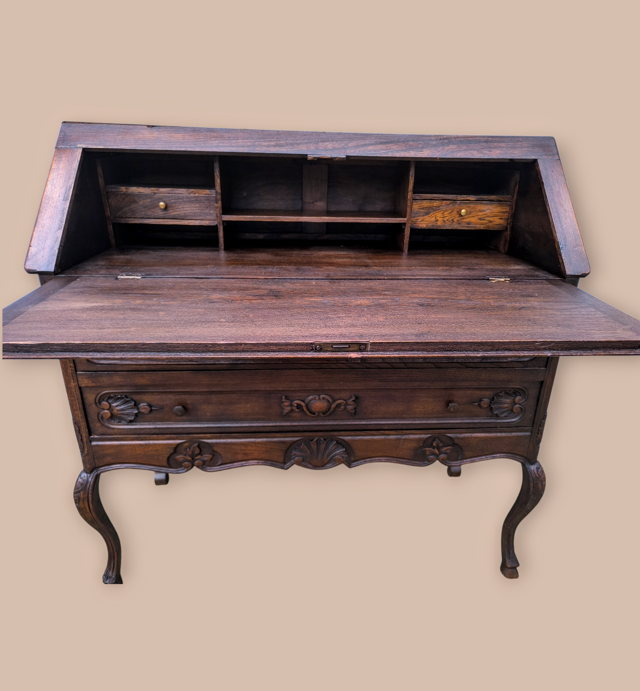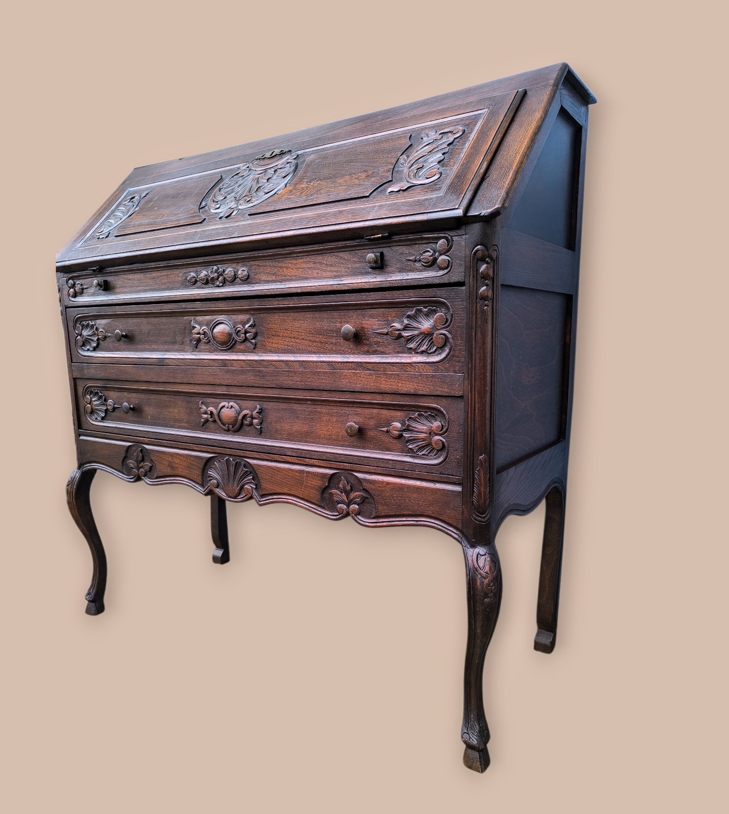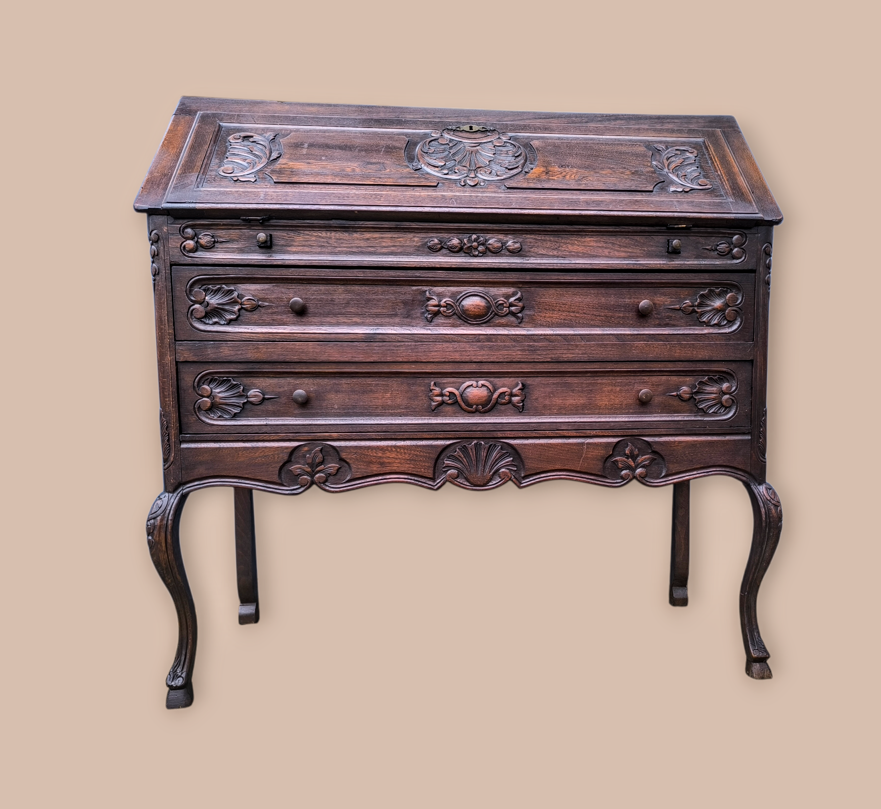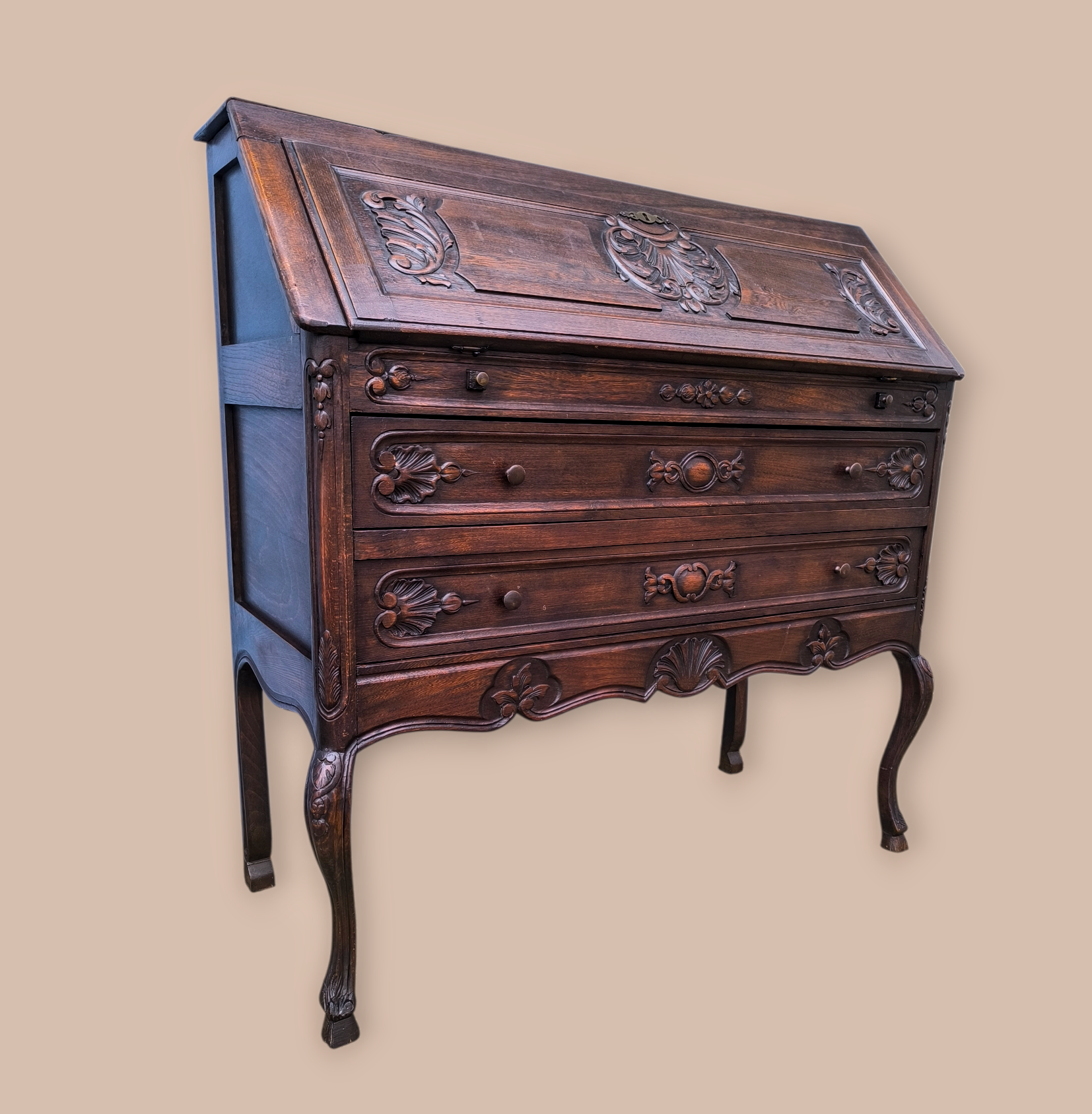 Eladó egy antik ,neobarokk stílusú 2 fiókos szekreter. Kecses ívelt lábakkal, alul 2 fiókkal.