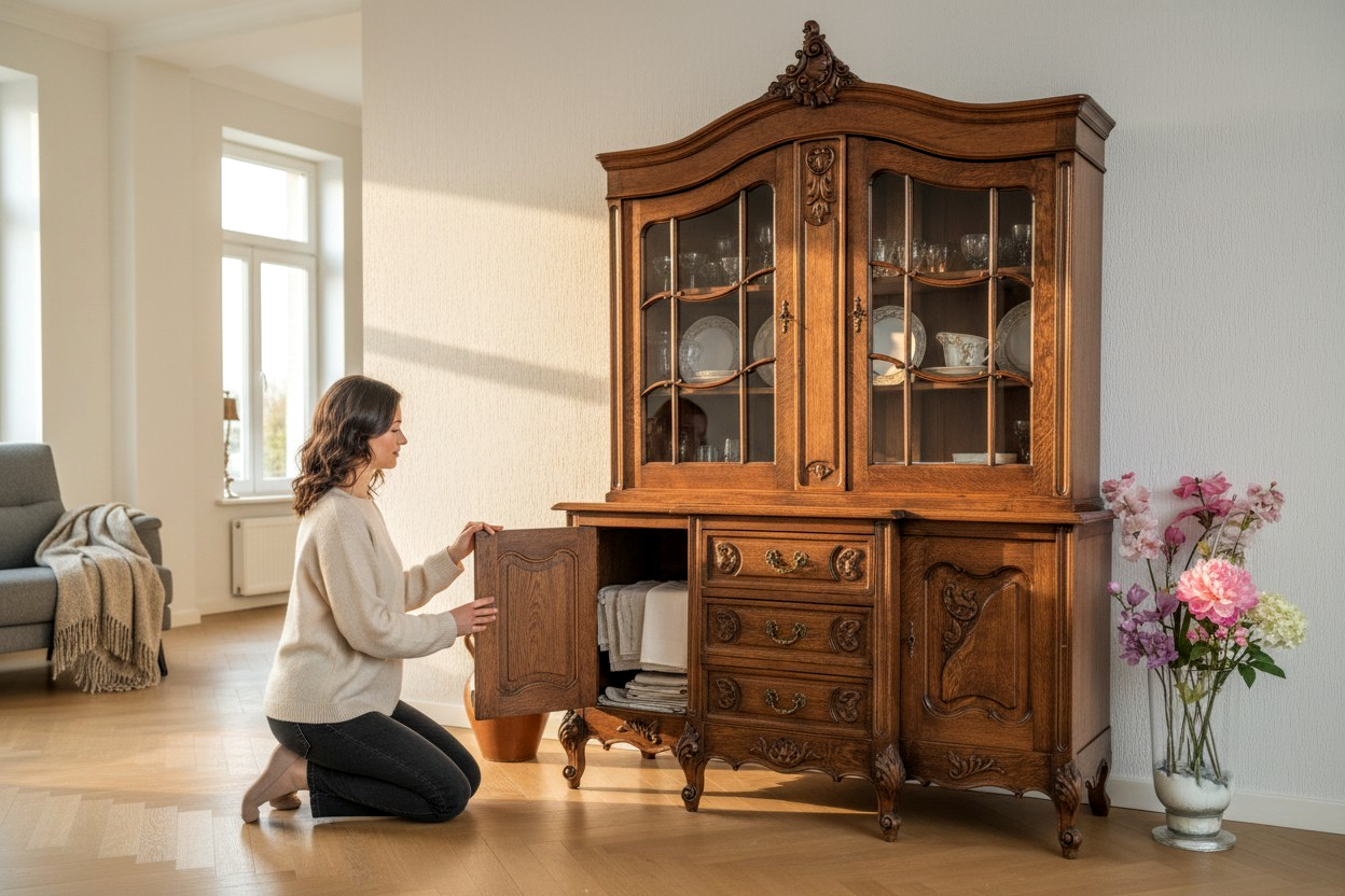 A felső rész üvegezett ajtókkal rendelkezik, amelyek belső polcokat rejtenek étkészletek, poharak vagy gyűjtemények bemutatására. Az alsó rész zárt tárolóhelyeket és fiókokat kínál.
