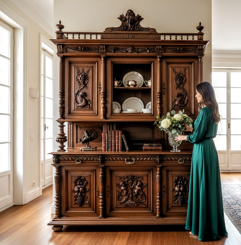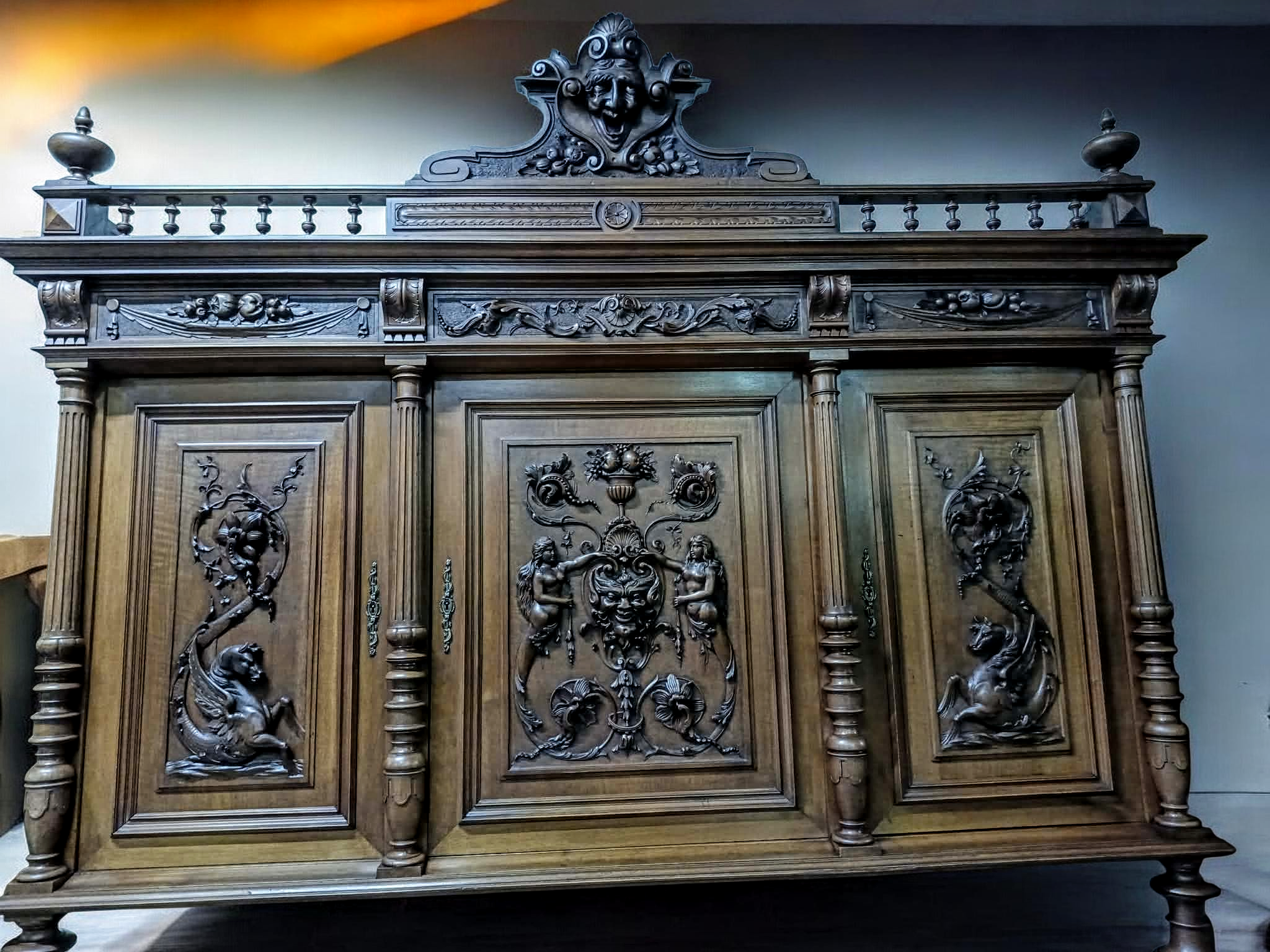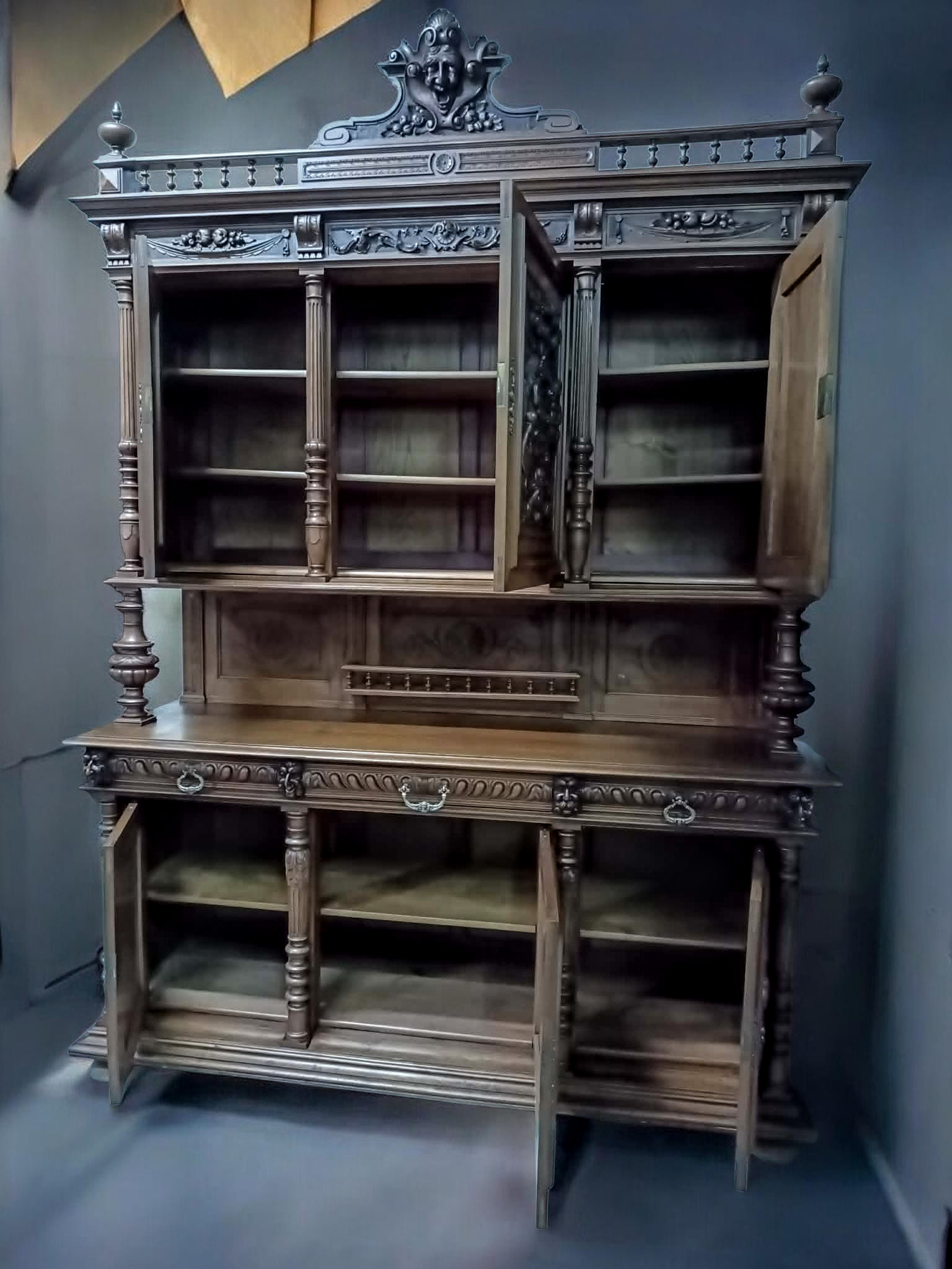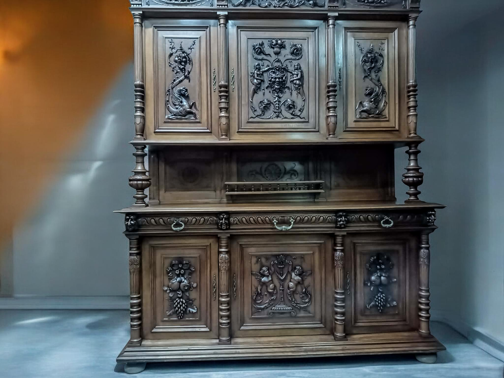 Eladó egy antik neoreneszánsz stílusú diófából készült tálalószekrény az 1860-1890 évekből.