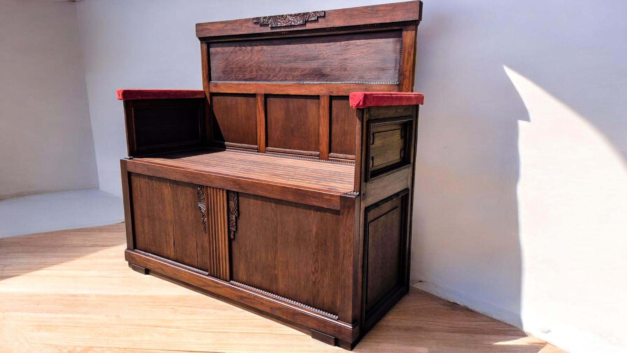 Eladó egy lenyűgöző megjelenésű antik tölgyfa pad a 19. század végéről vagy a 20. század elejéről (kb. 1890–1930) származik.