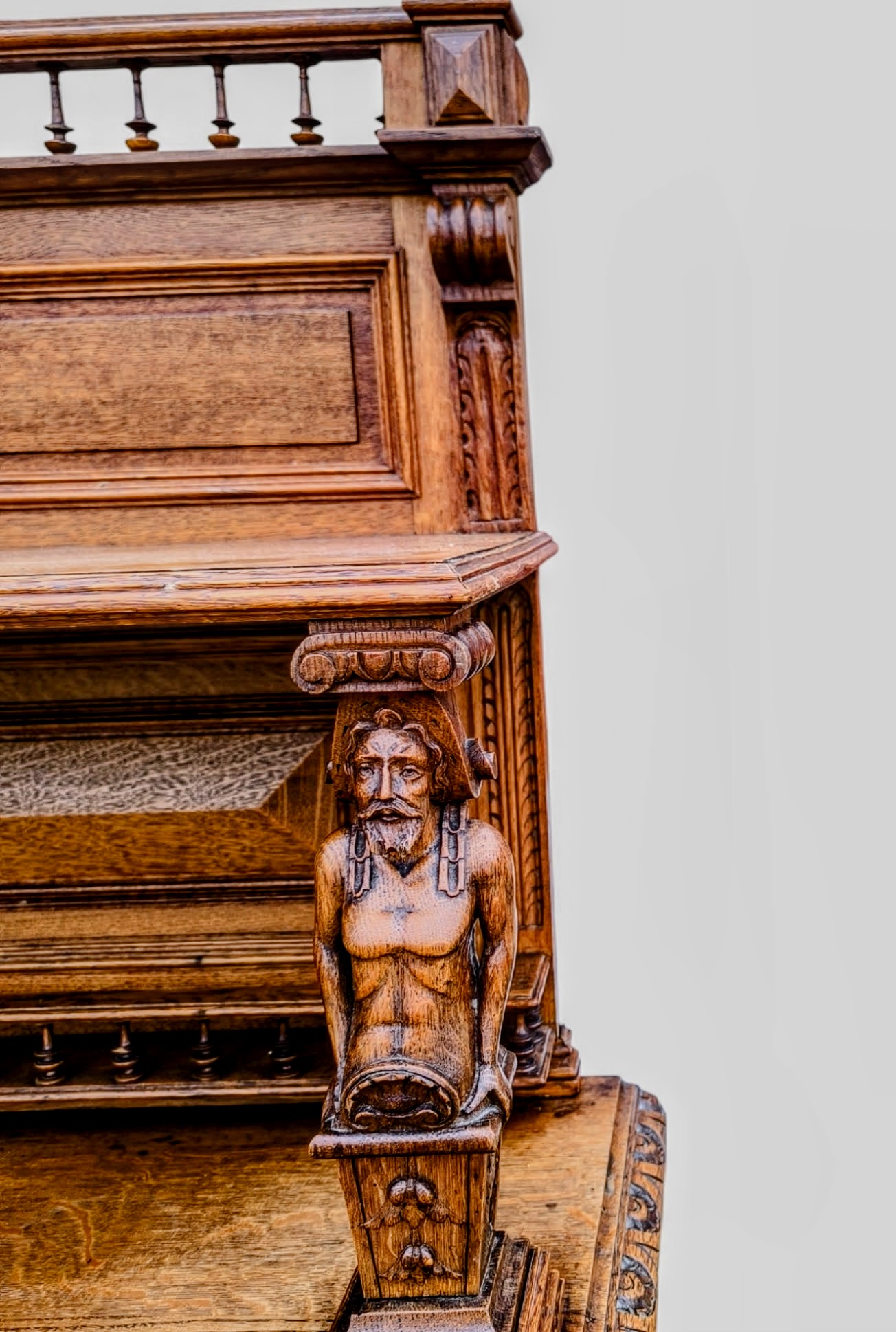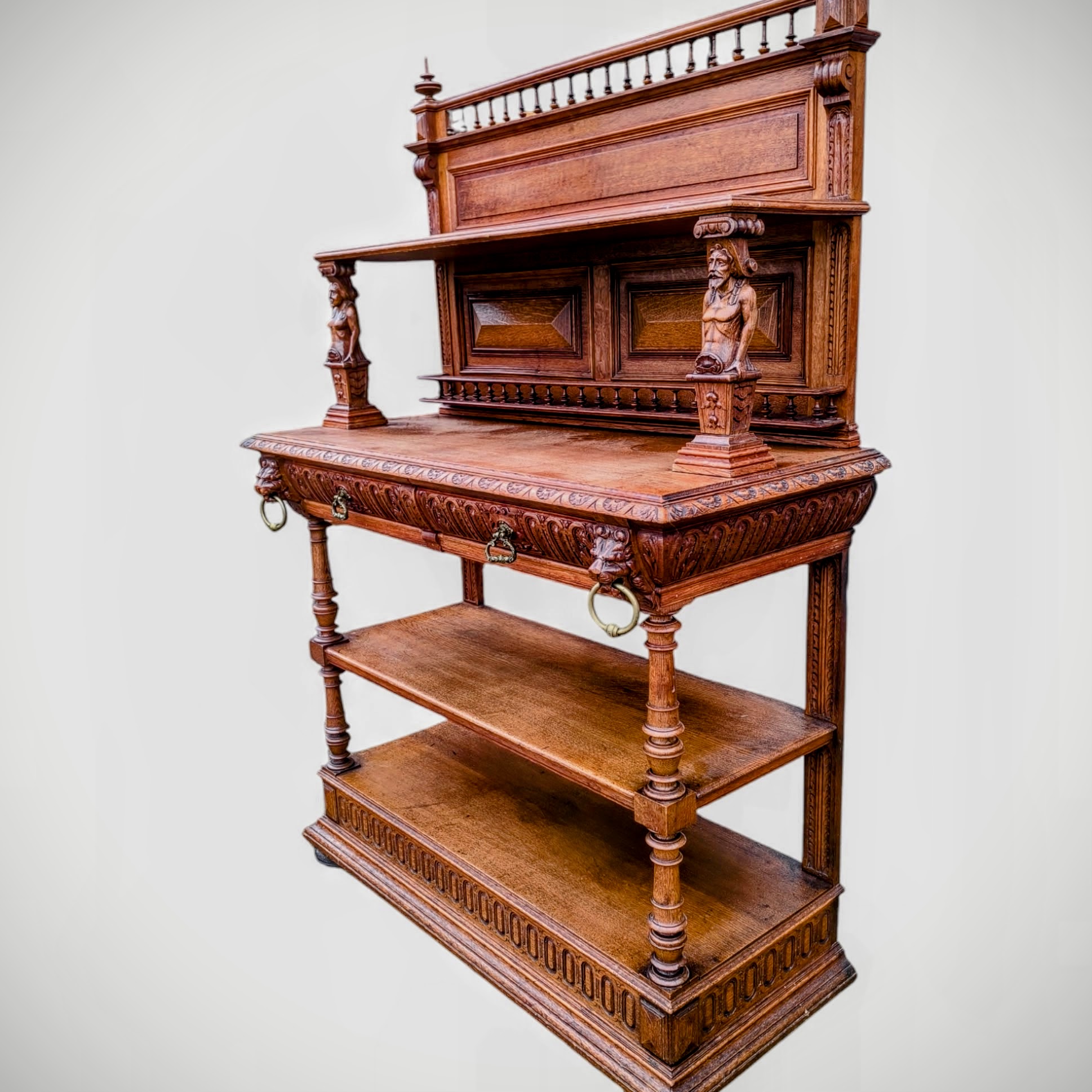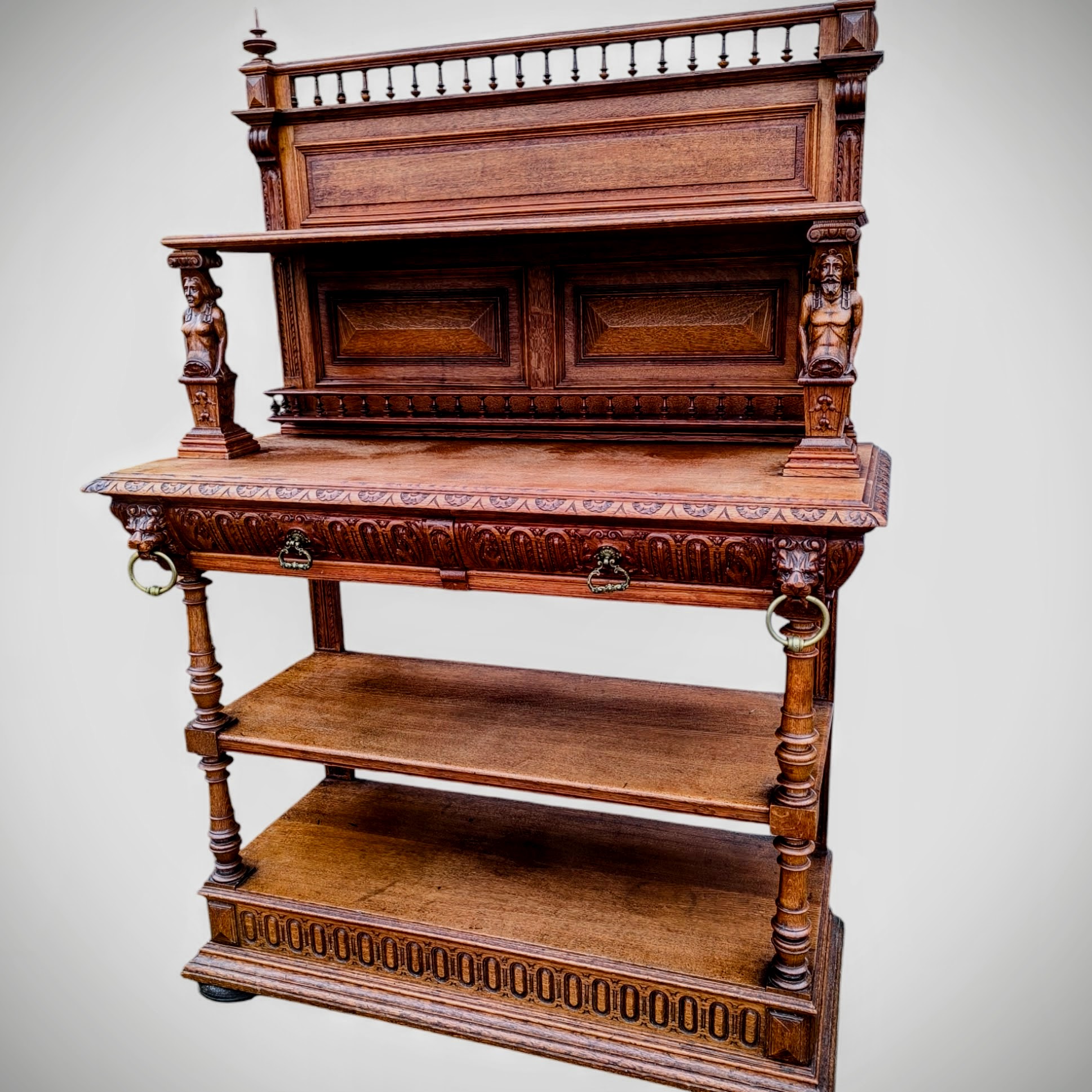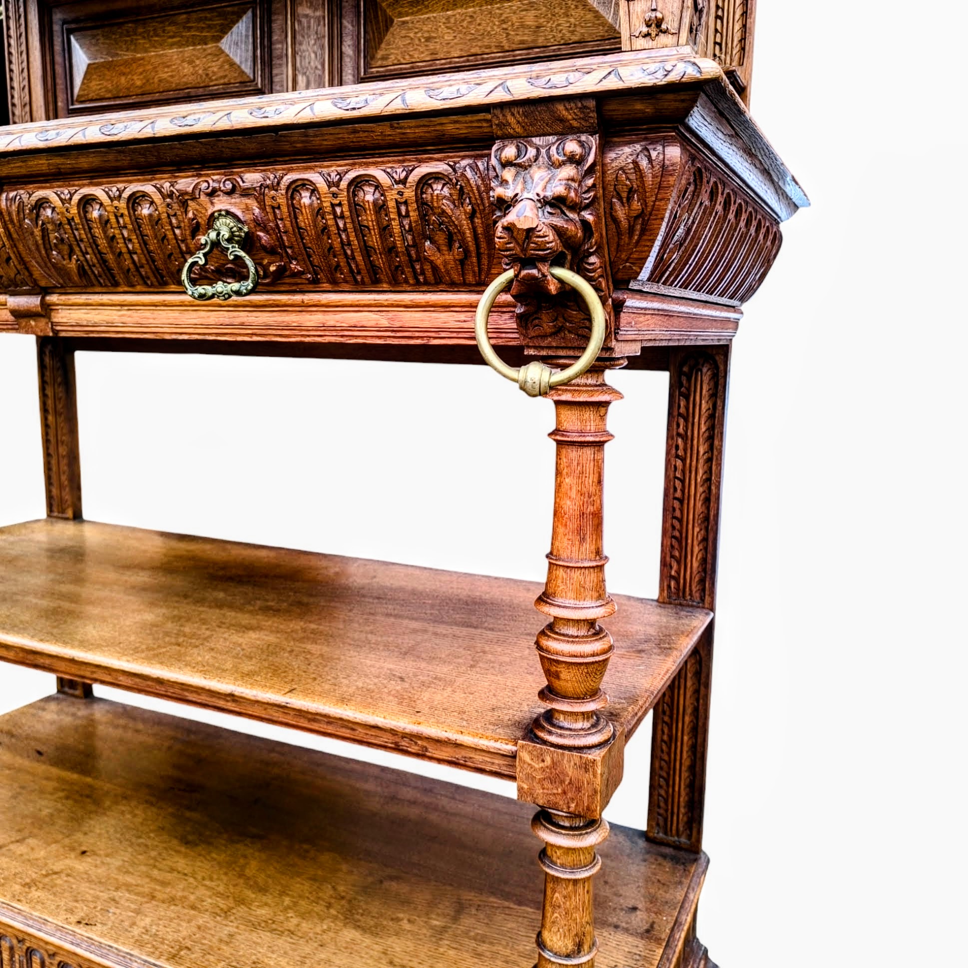 Eladó egy antik neoreneszánsz stílusú pohárszék . Alul nyitott résszel és fiókokkal, felül díszes faragott elemekkel .