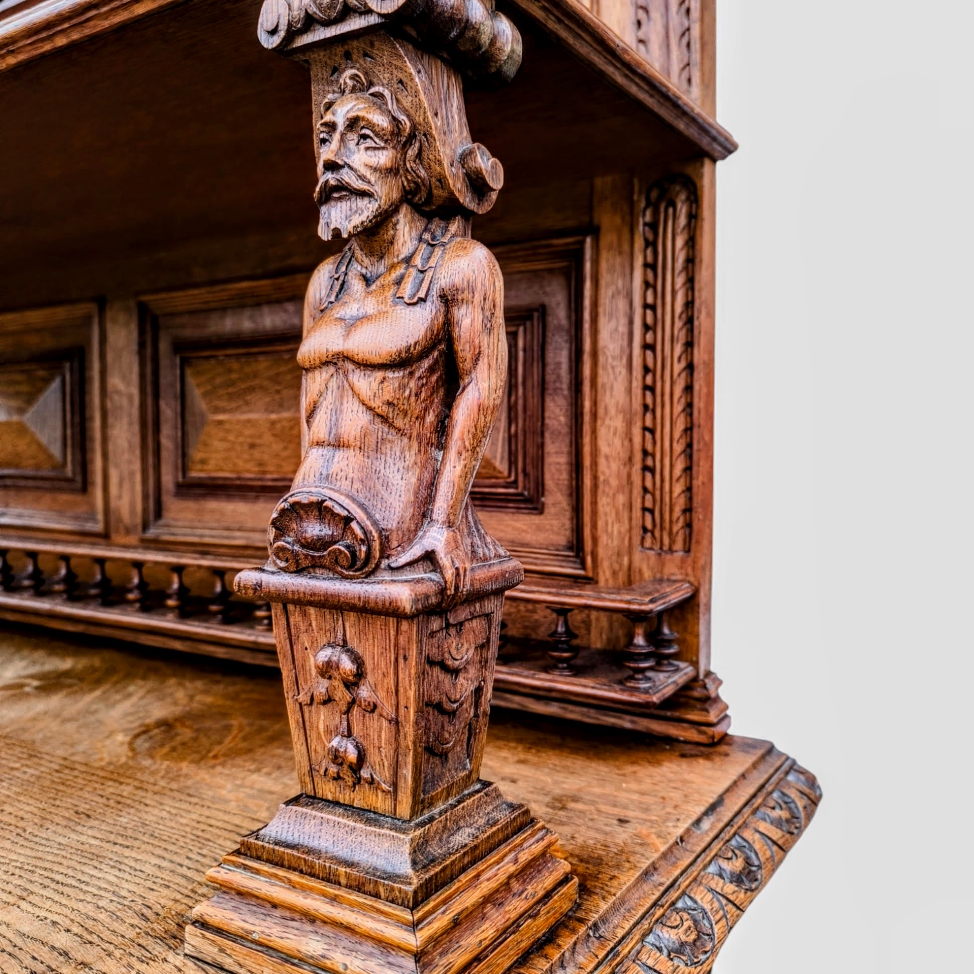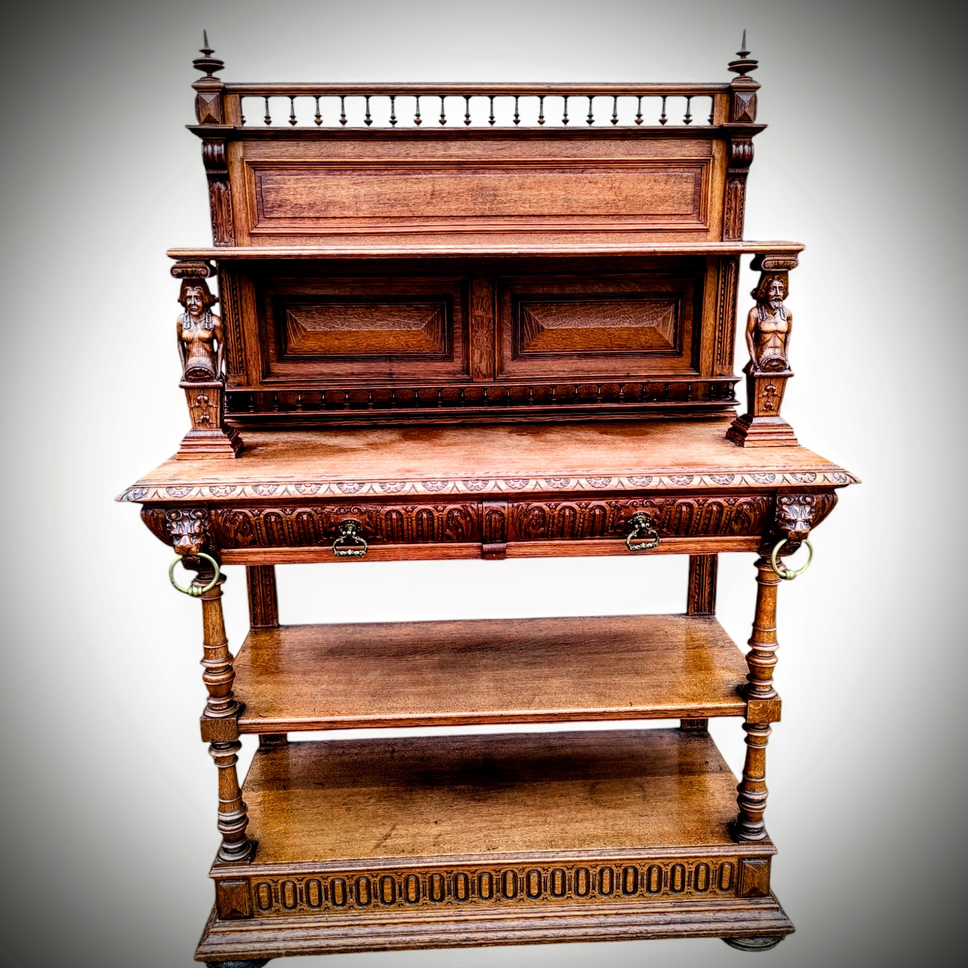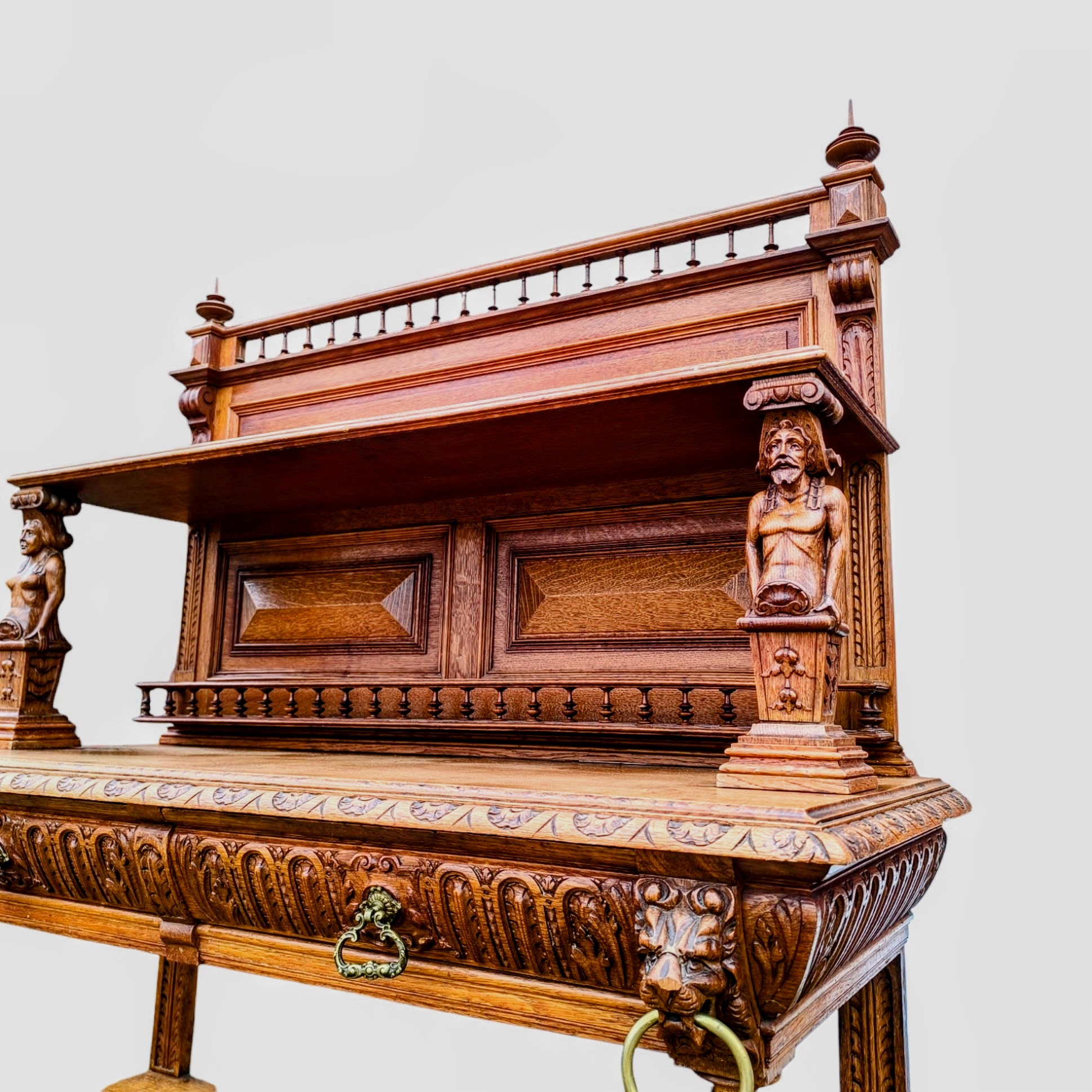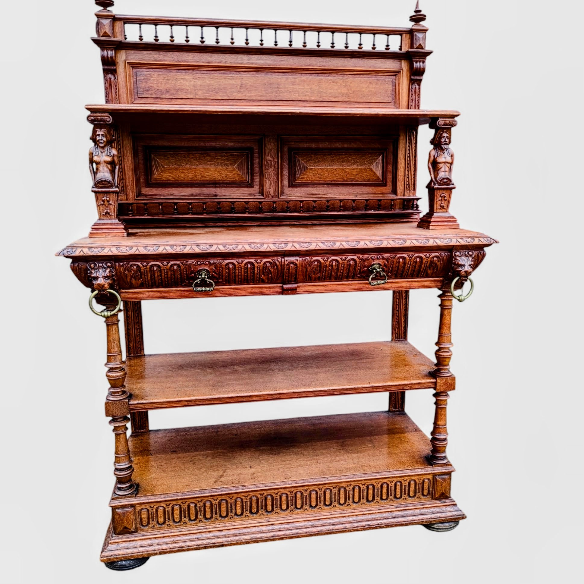 Eladó egy antik neoreneszánsz stílusú pohárszék . Alul nyitott résszel és fiókokkal, felül díszes faragott elemekkel .