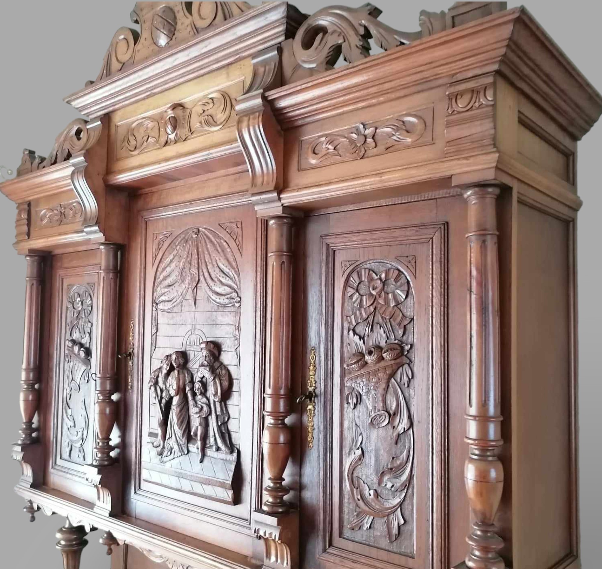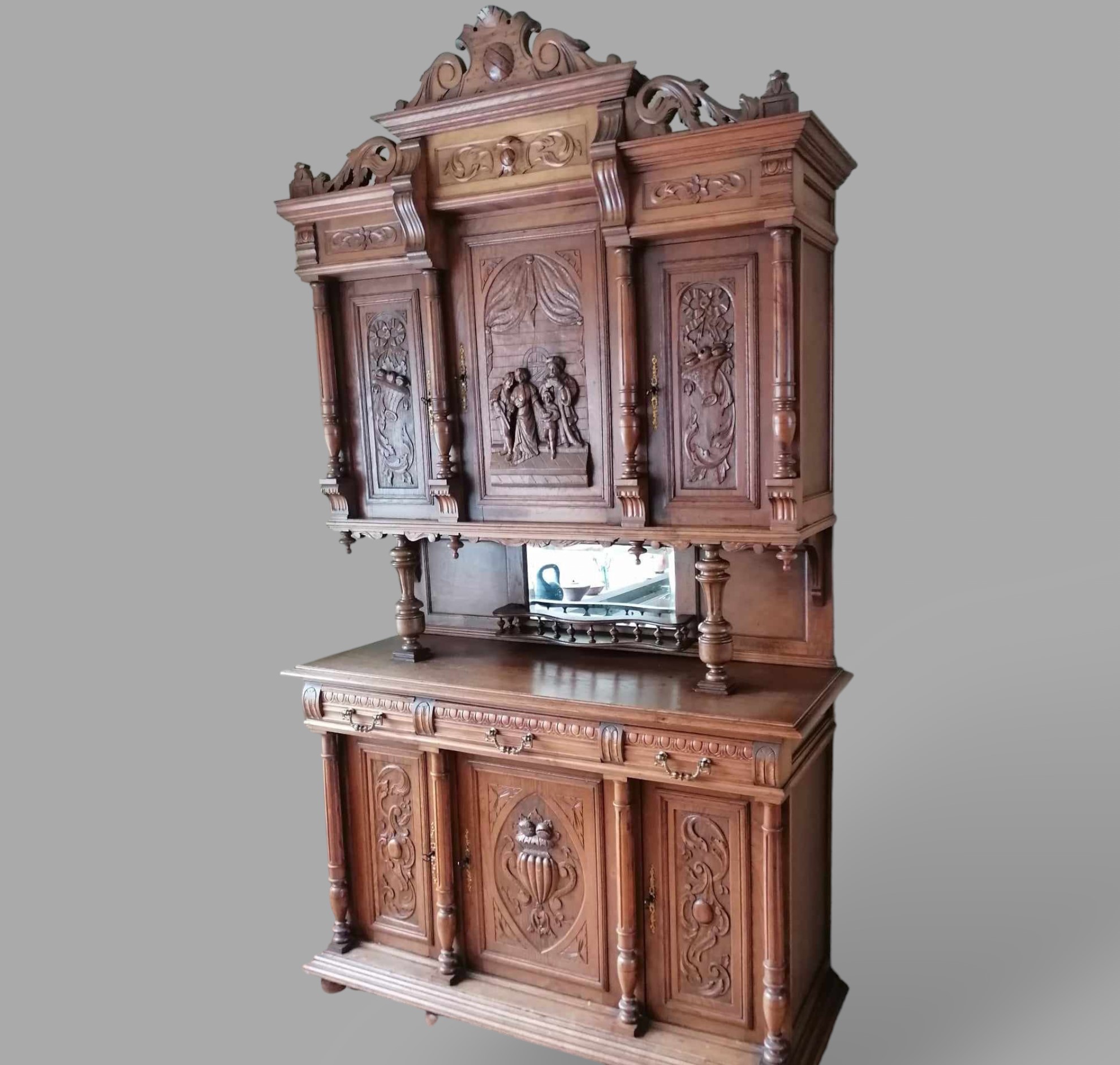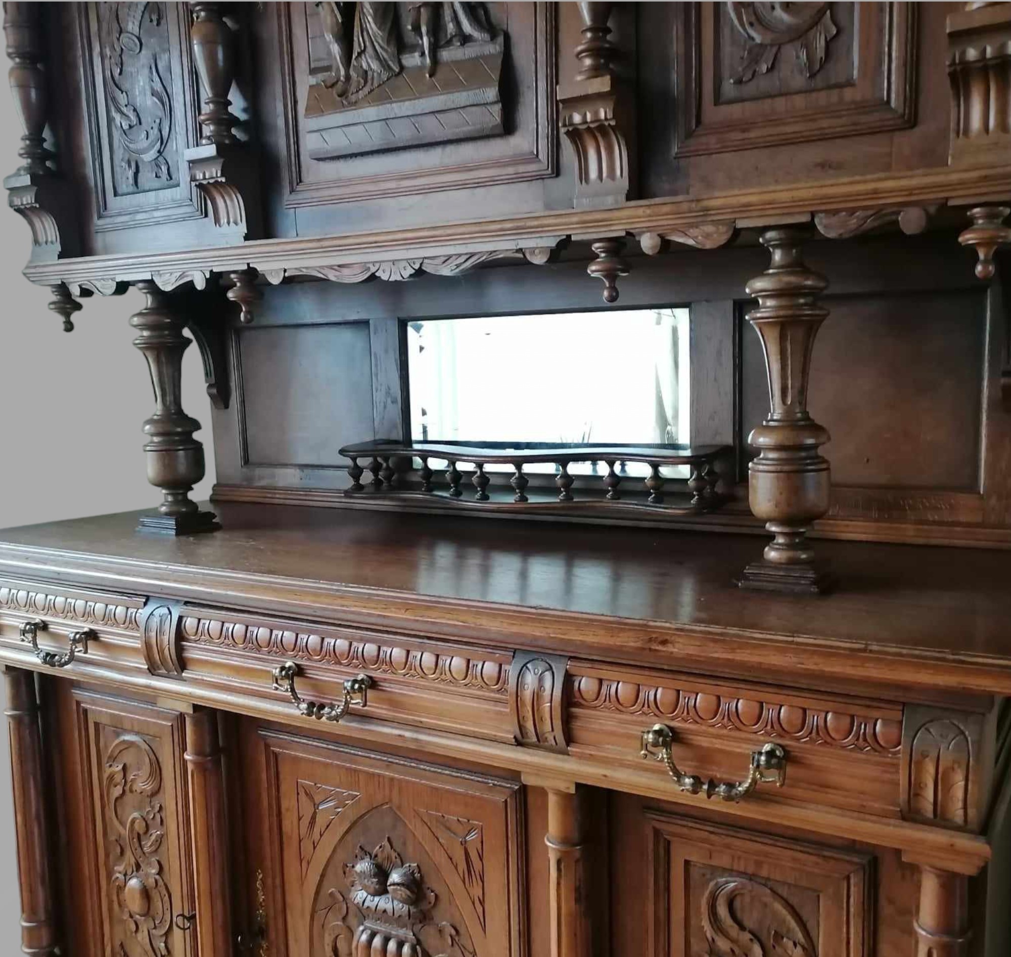 Eladó neoreneszánsz tálalószekrény szép állapotban. Dúsan faragott kivitel alul-felül díszes motívumokkal, élethű jelenetekkel az ajtókon. Fiókon réz fogantyúk találhatók, középen tükörrel. Díszes megjelenésű, de mégis praktikus bútor darab. Akár modern otthonba is, minden helyen jól mutat. Szállításhoz szétszedhető, így bárhová eljuttatható.