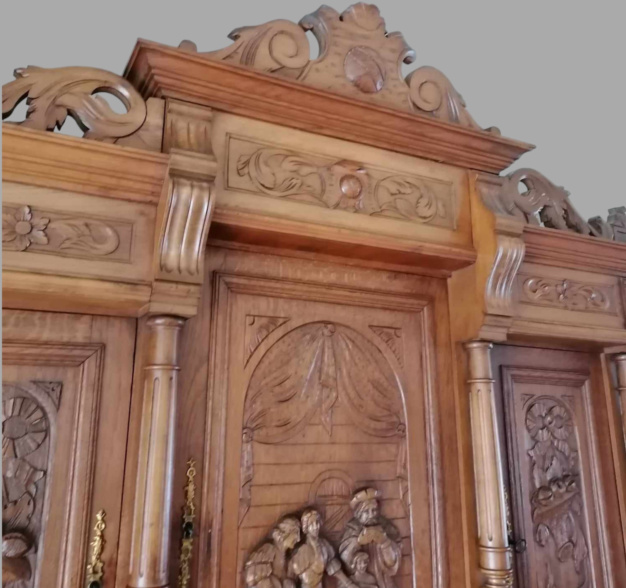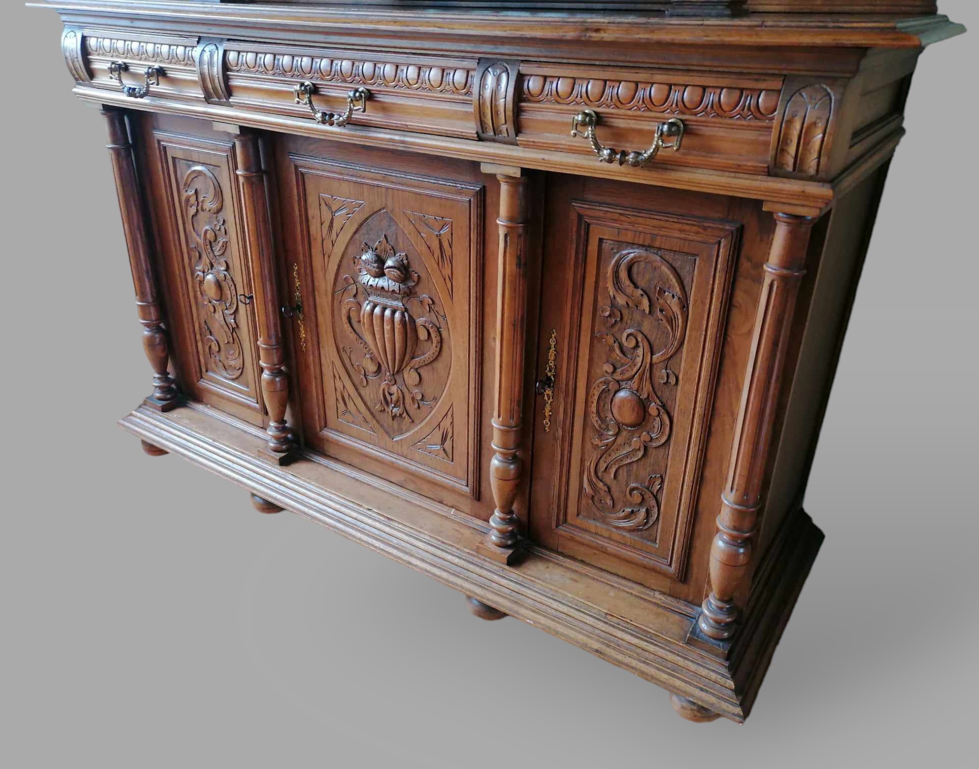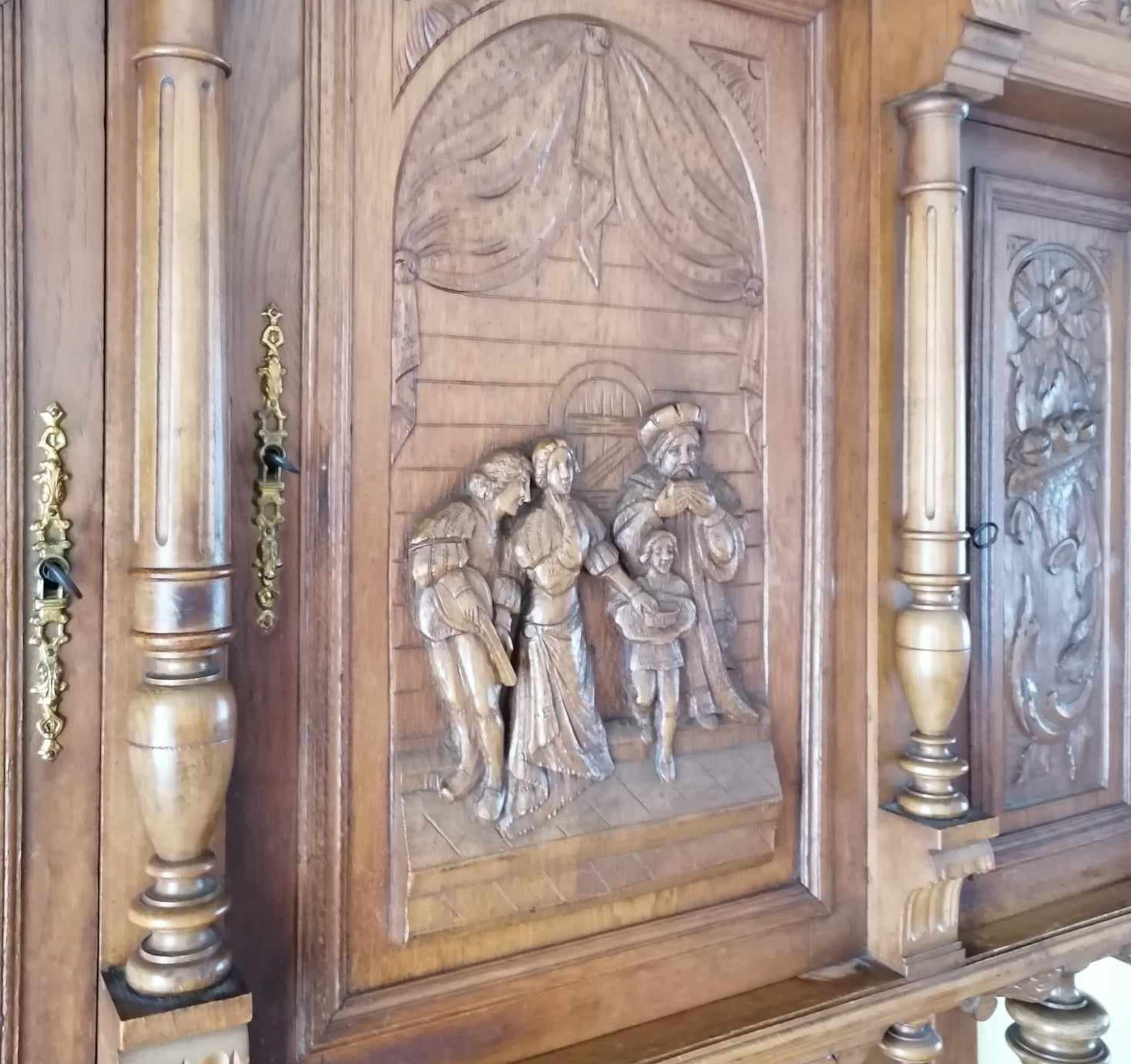 Eladó neoreneszánsz tálalószekrény szép állapotban. Dúsan faragott kivitel alul-felül díszes motívumokkal, élethű jelenetekkel az ajtókon. Fiókon réz fogantyúk találhatók, középen tükörrel. Díszes megjelenésű, de mégis praktikus bútor darab. Akár modern otthonba is, minden helyen jól mutat. Szállításhoz szétszedhető, így bárhová eljuttatható.