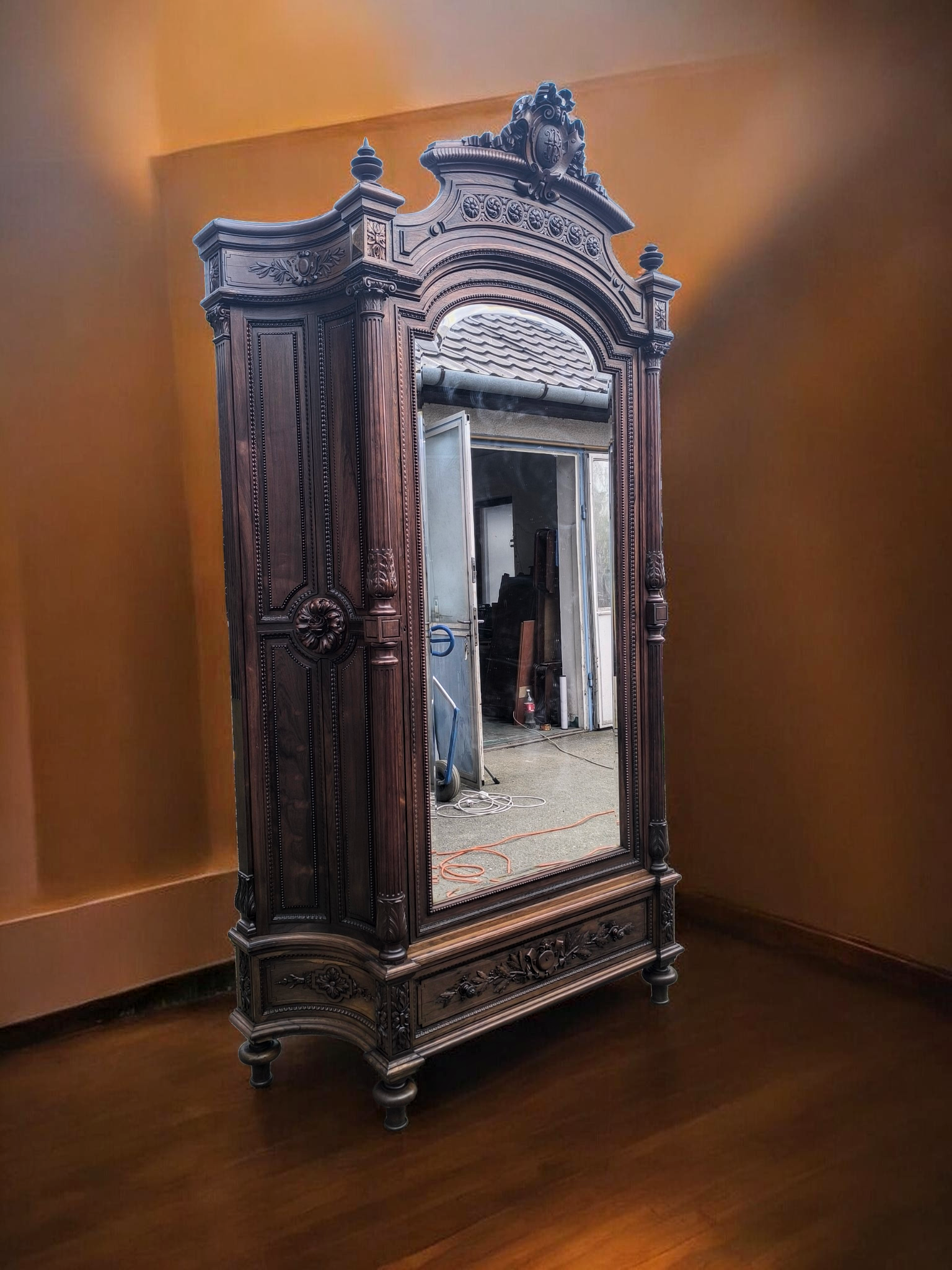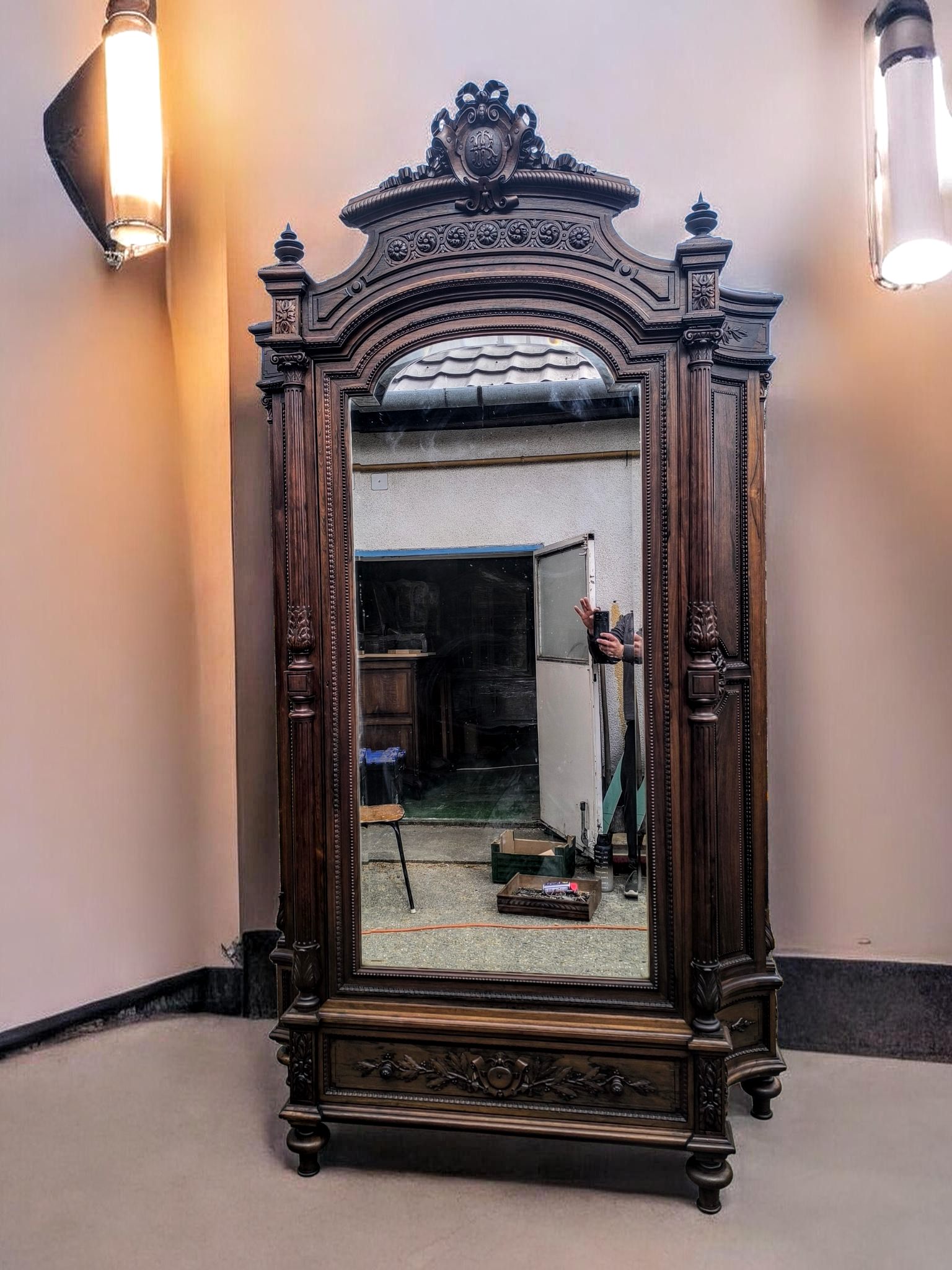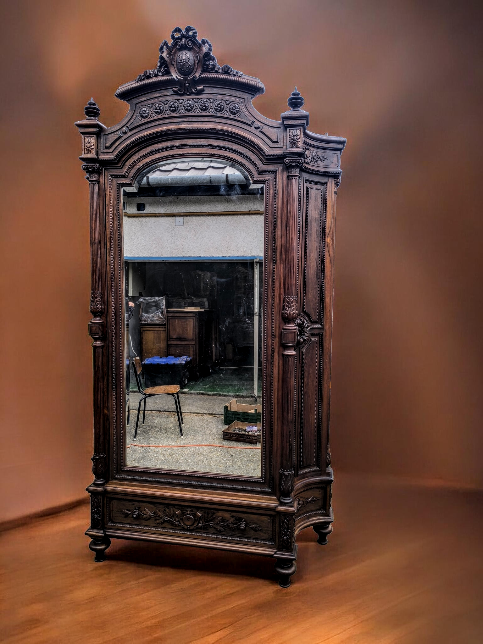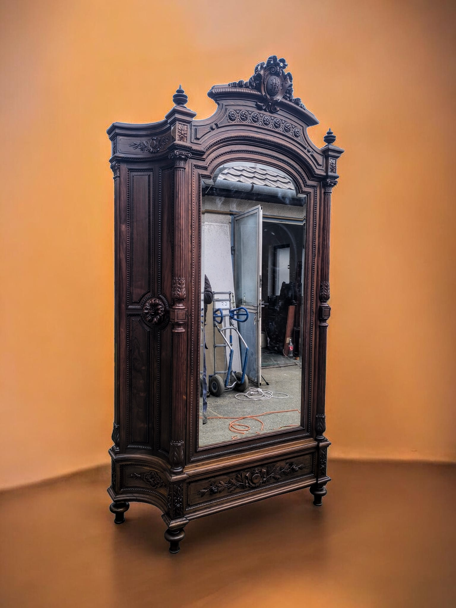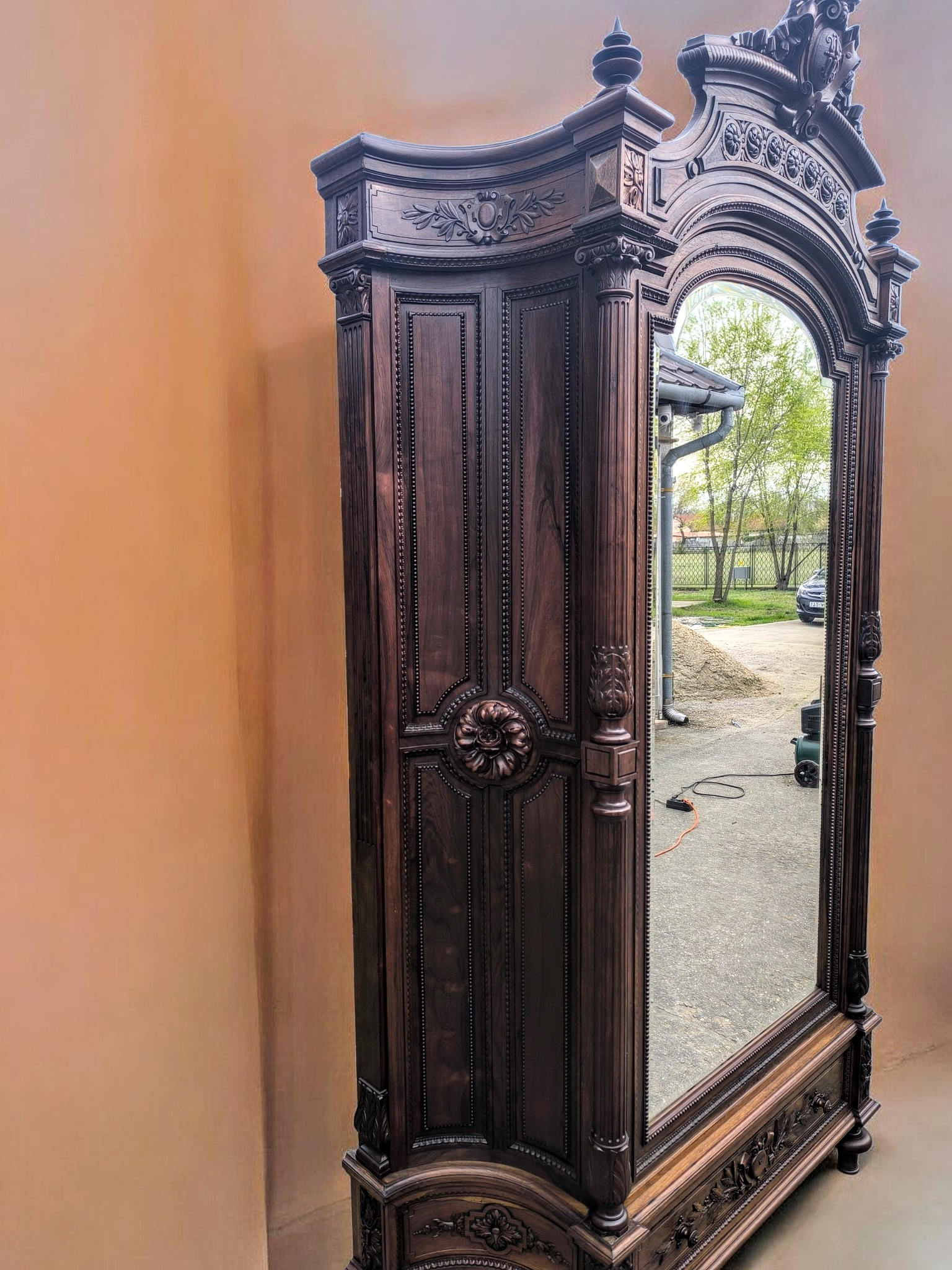 Eladásra kínálunk egy antik neoreneszánsz stílusú tükrös ruhás szekrényt,gardróbot.