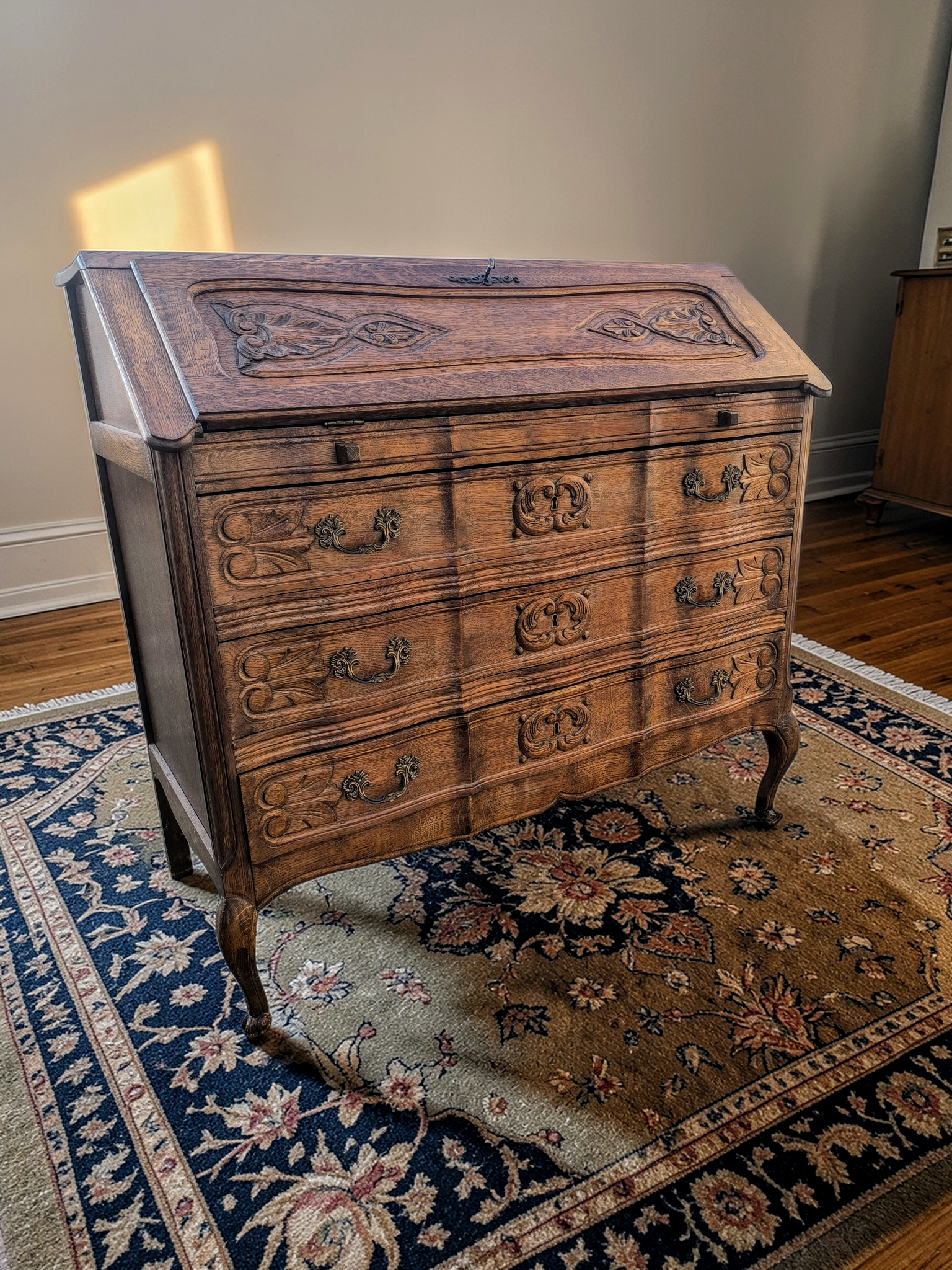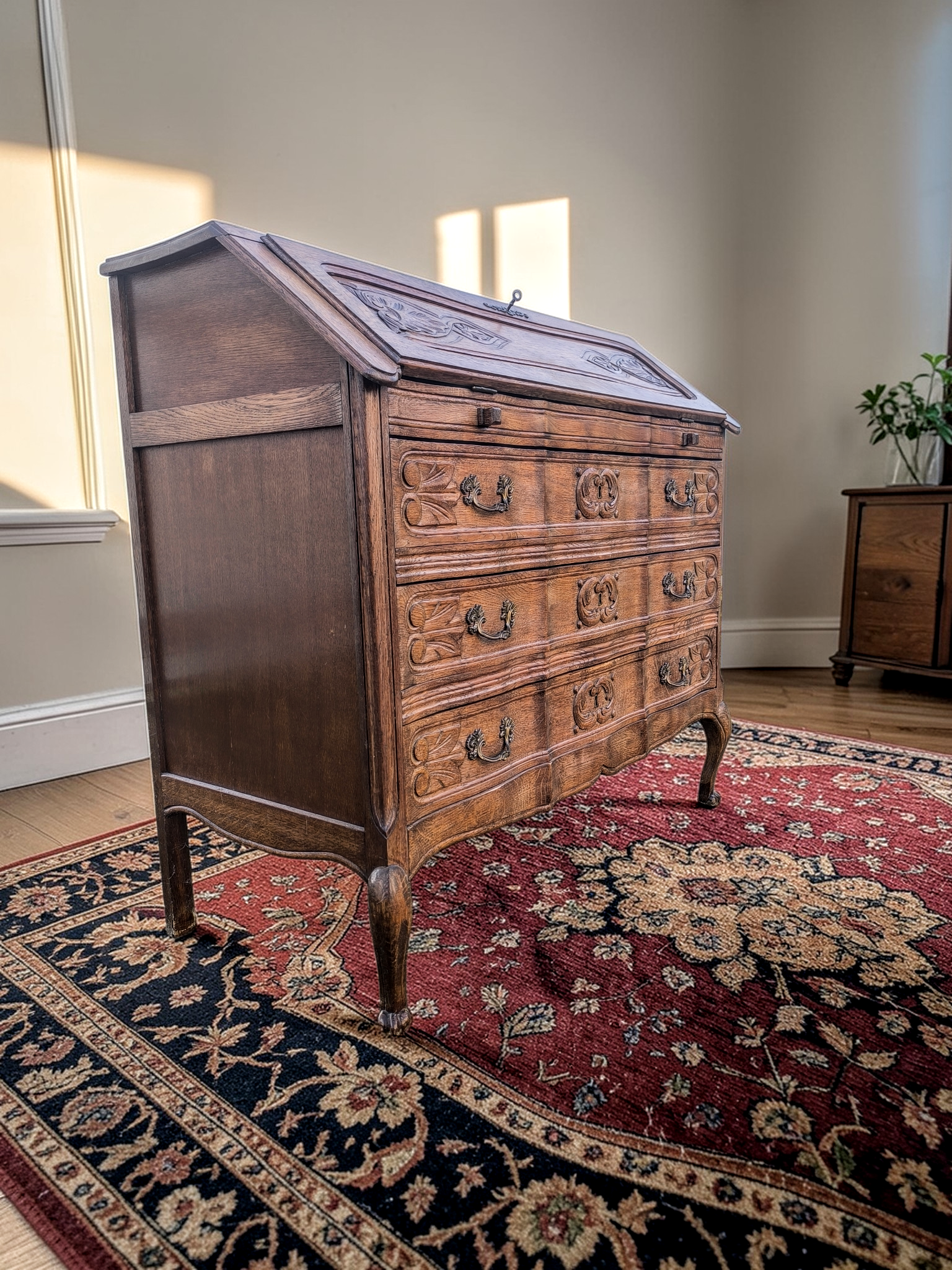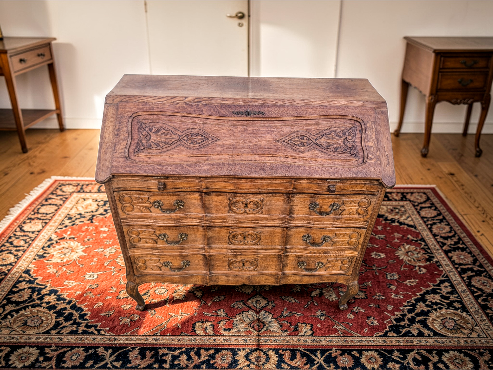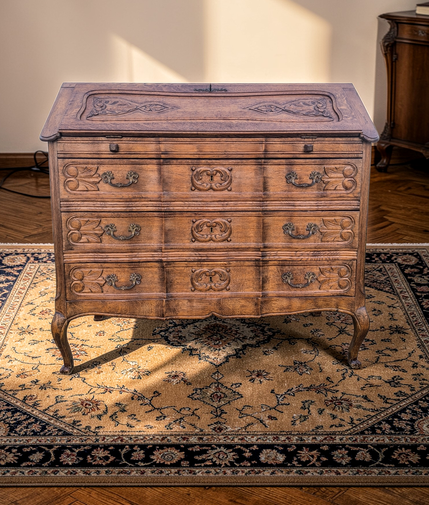 Eladó egy antik stílusú neobarokk 3 fiókos szekreter. Kecses ívelt lábakkal, alul 3 íves fiókkal.