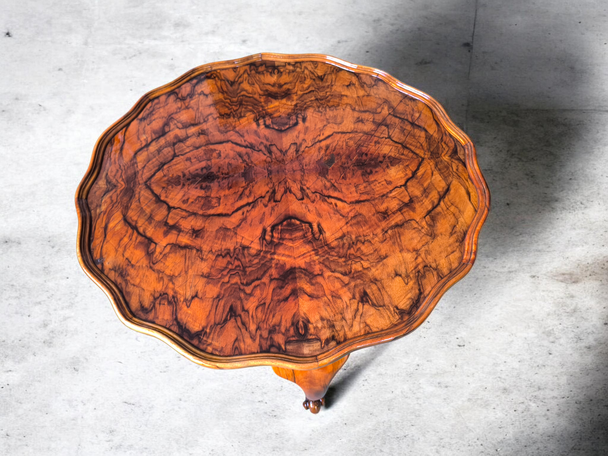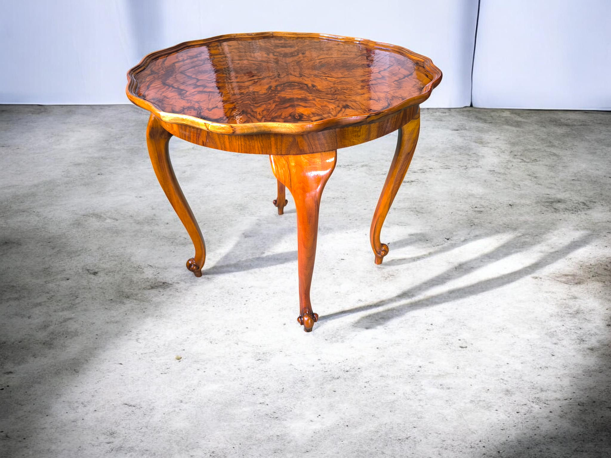 Az asztallap diógyökér-furnér borítrású.A magasfényű felület kiemeli a fa természetes erezetét.Az asztal széle hullámosan faragott,ami finom megjelenést kölcsönöz neki.
