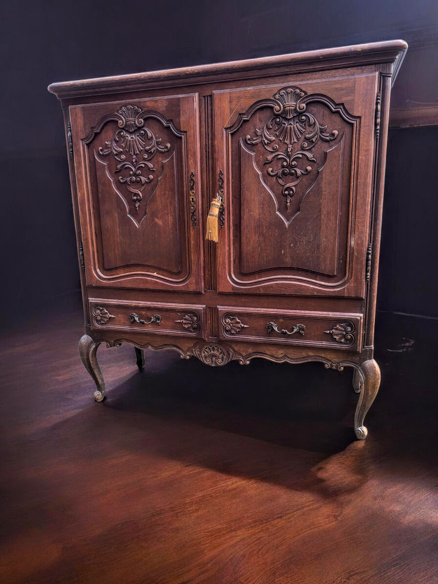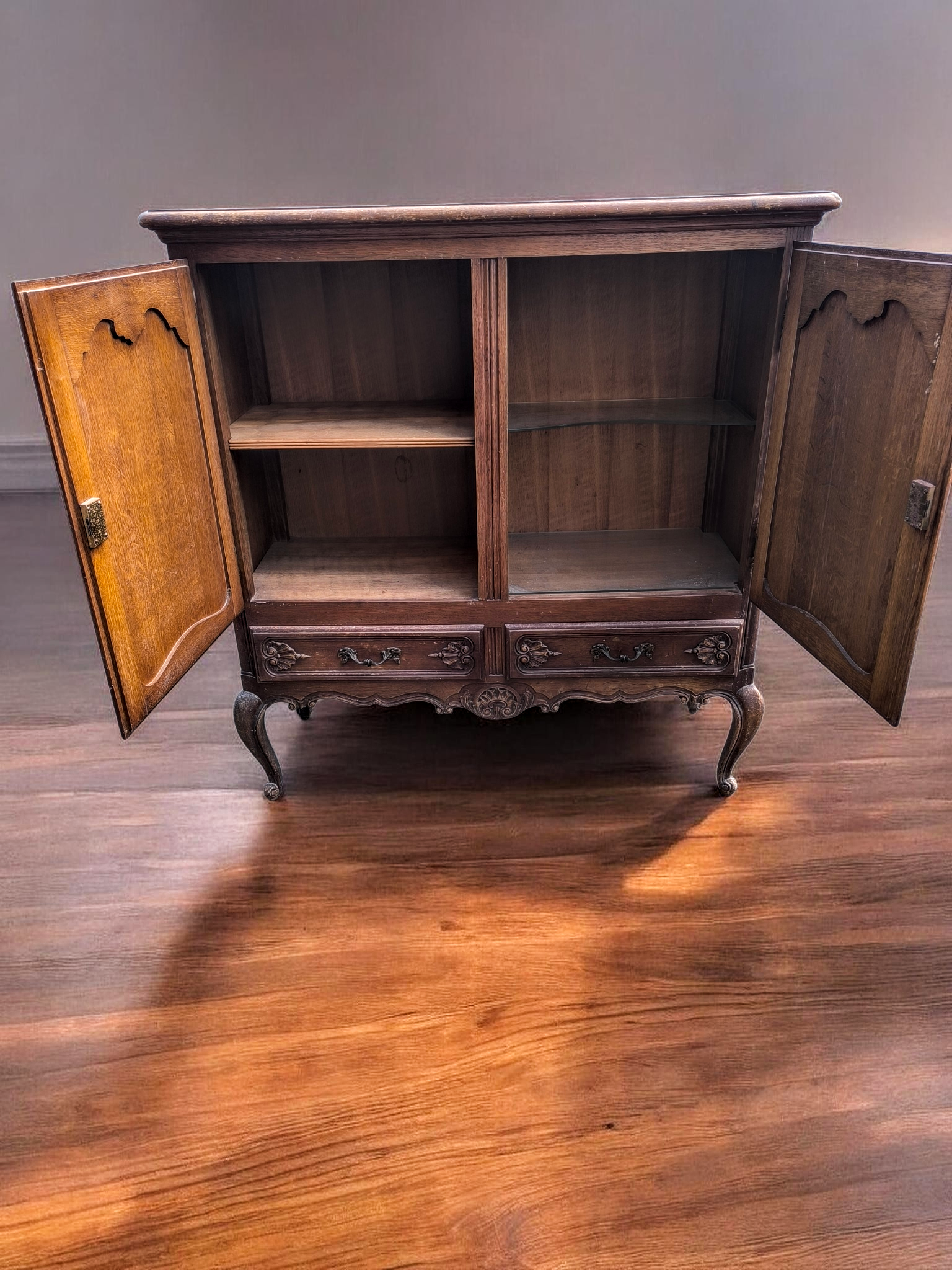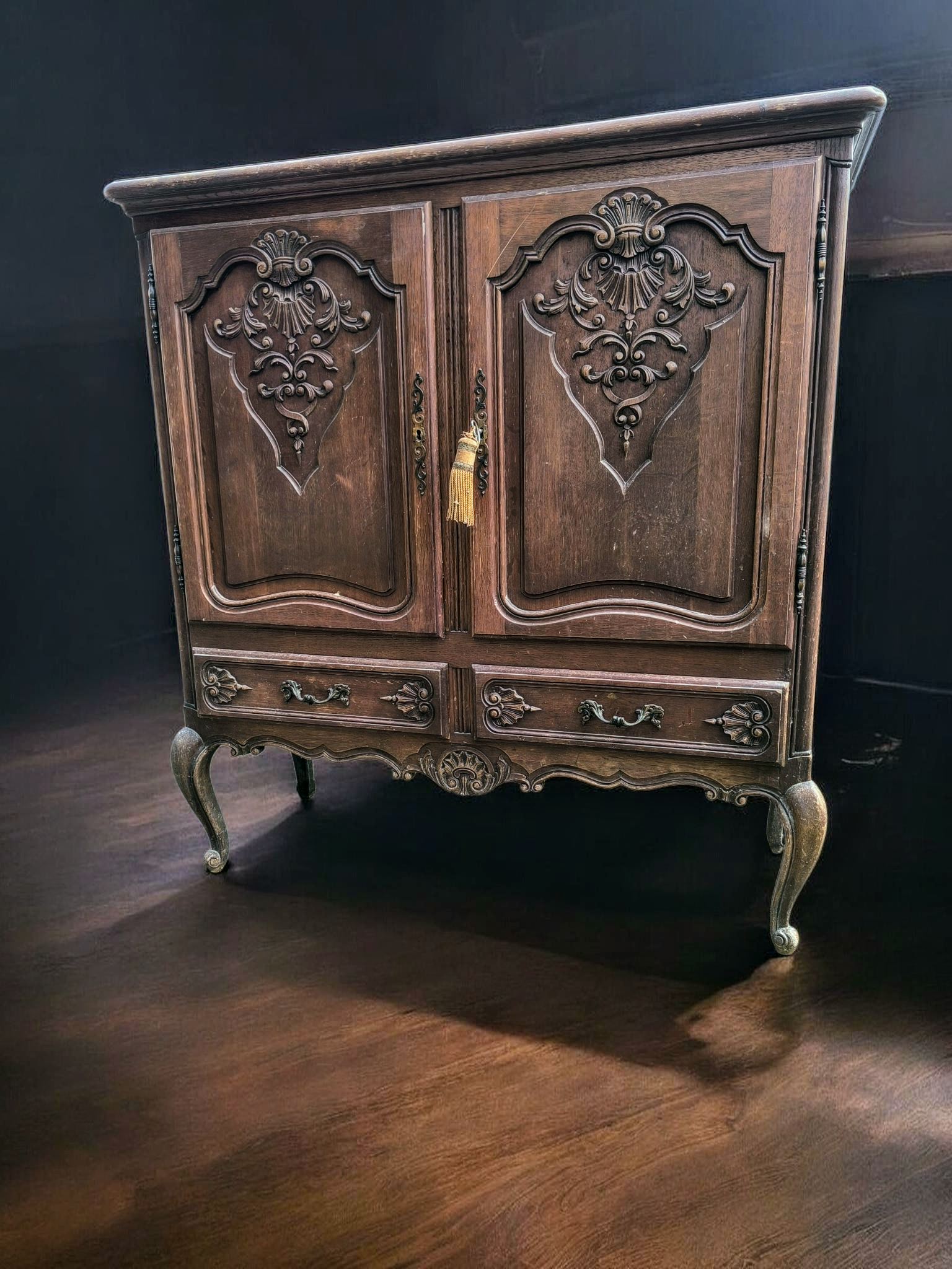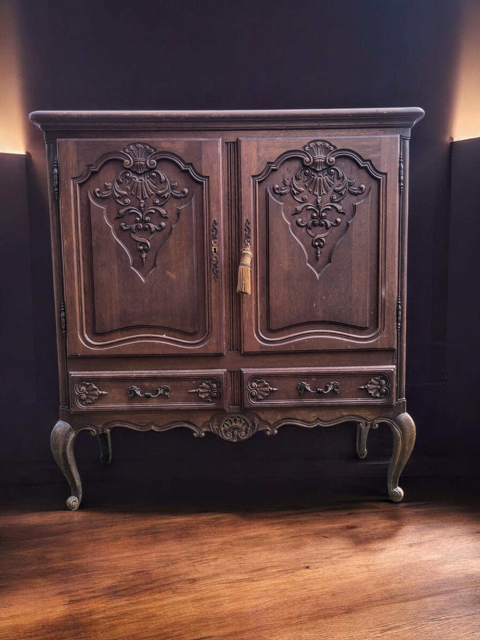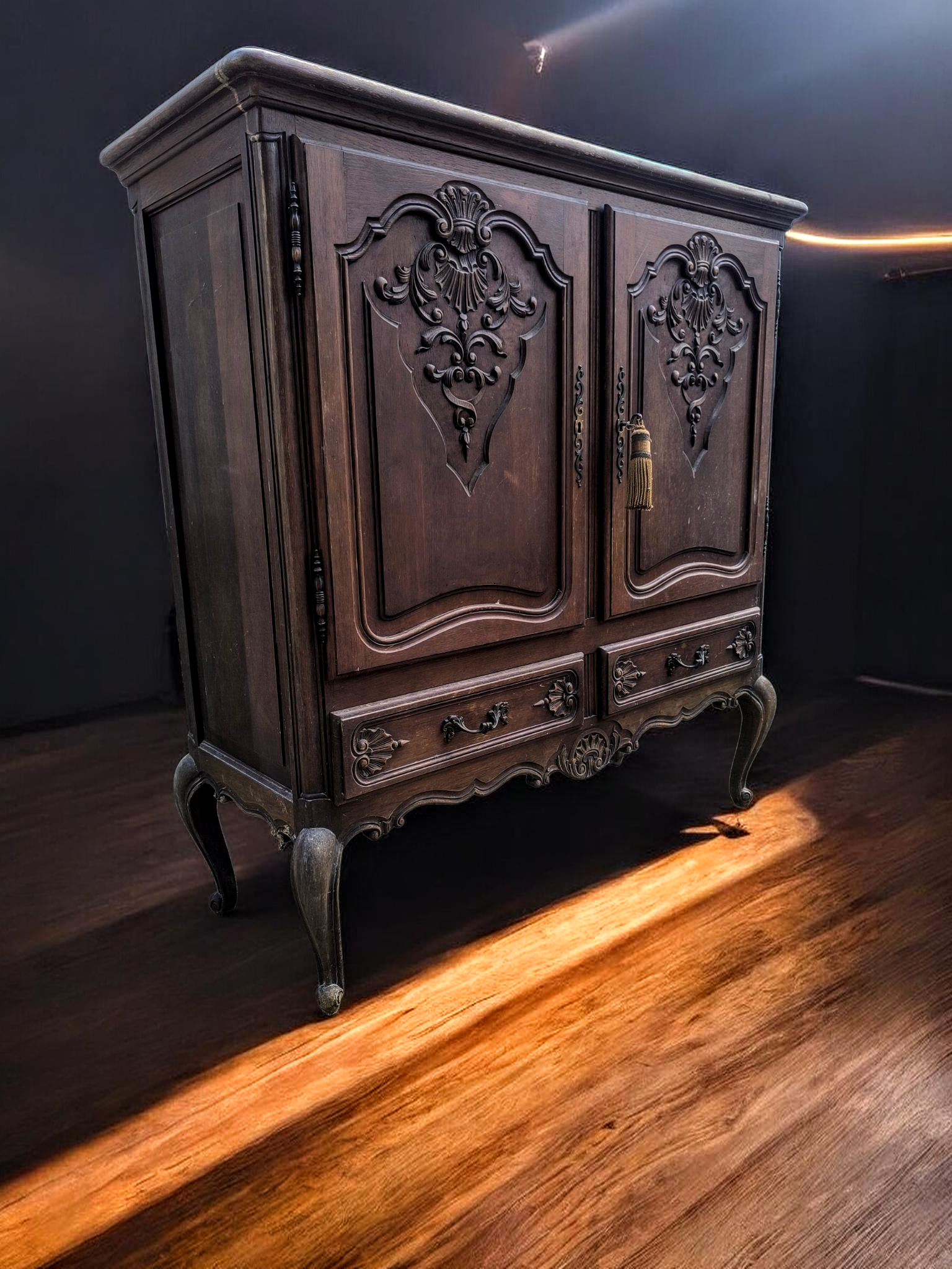 Kialakítás: Két nagy méretű, nyíló ajtó felül, alattuk pedig két praktikus, díszes fogantyúval ellátott fiók. Stílus: Kecses, ívelt "cabriole" lábak, amelyek stabil, mégis könnyed megjelenést kölcsönöznek a bútornak.