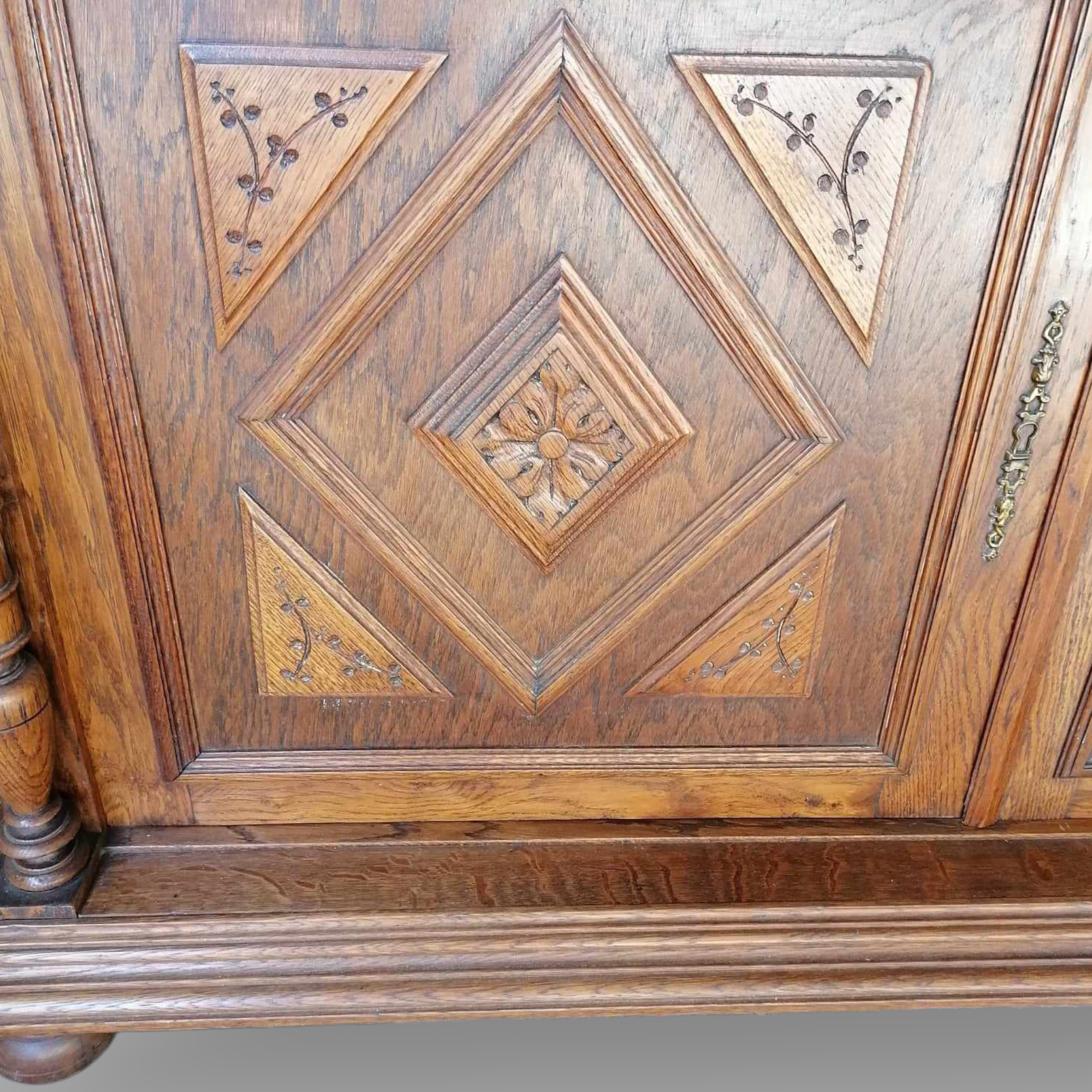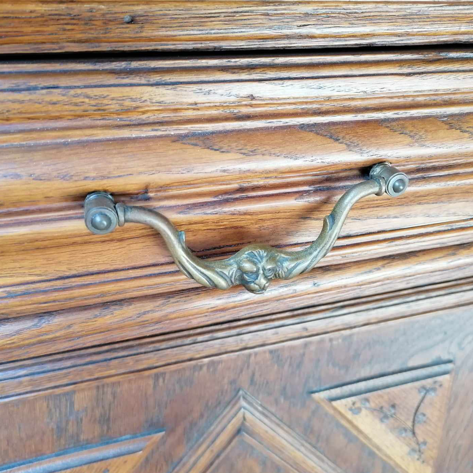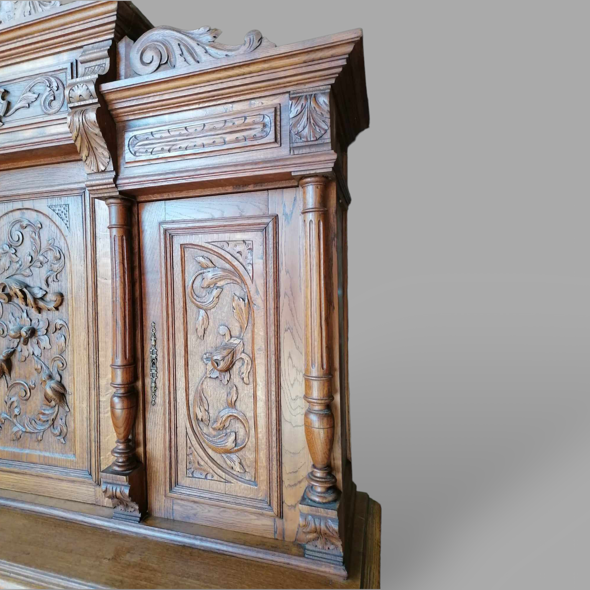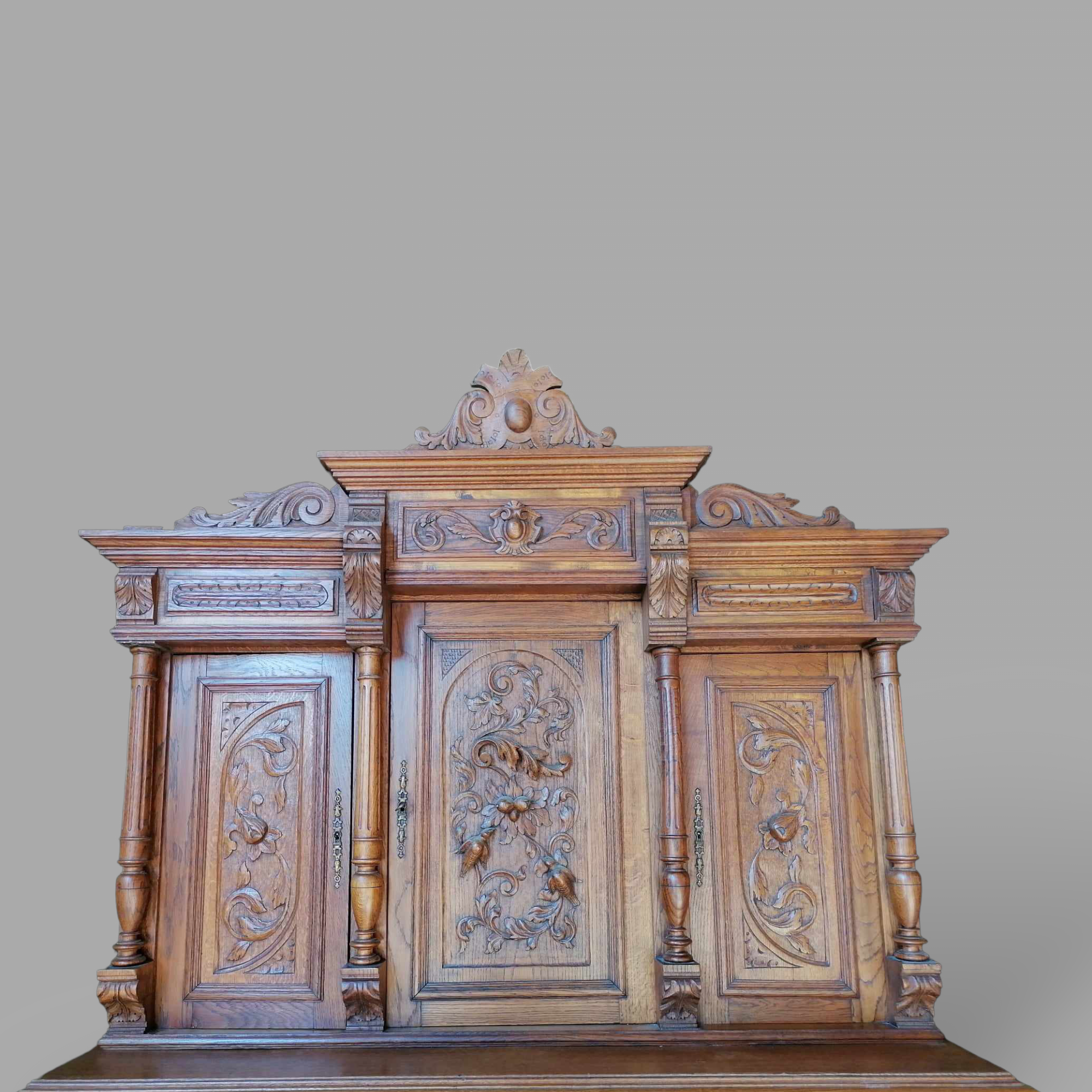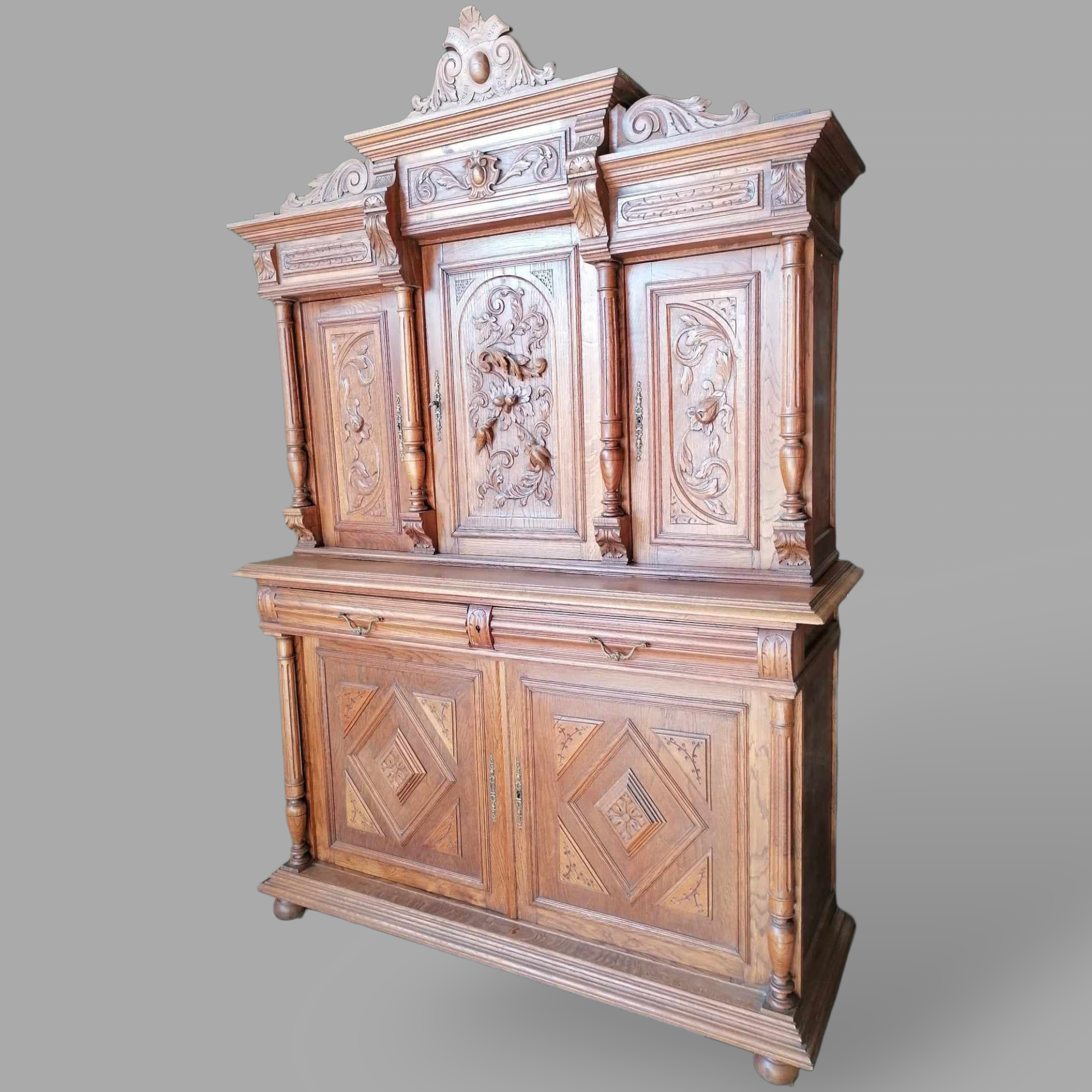 Antik nagy méretű tálalószekrény szép állapotban. Különleges darab, alul faragott ajtóval, réz oroszlános fogantyúkkal. Felül díszesen faragott középső ajtó és kimagasló csúcsdísz található. Szállításhoz két részre szedhető.
