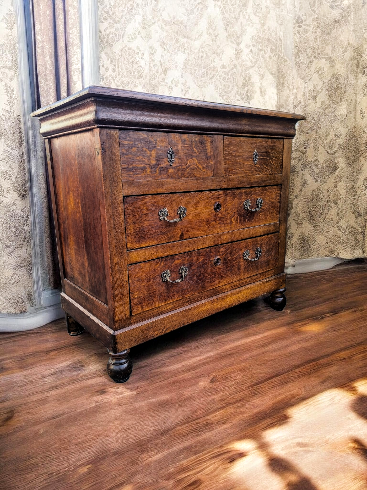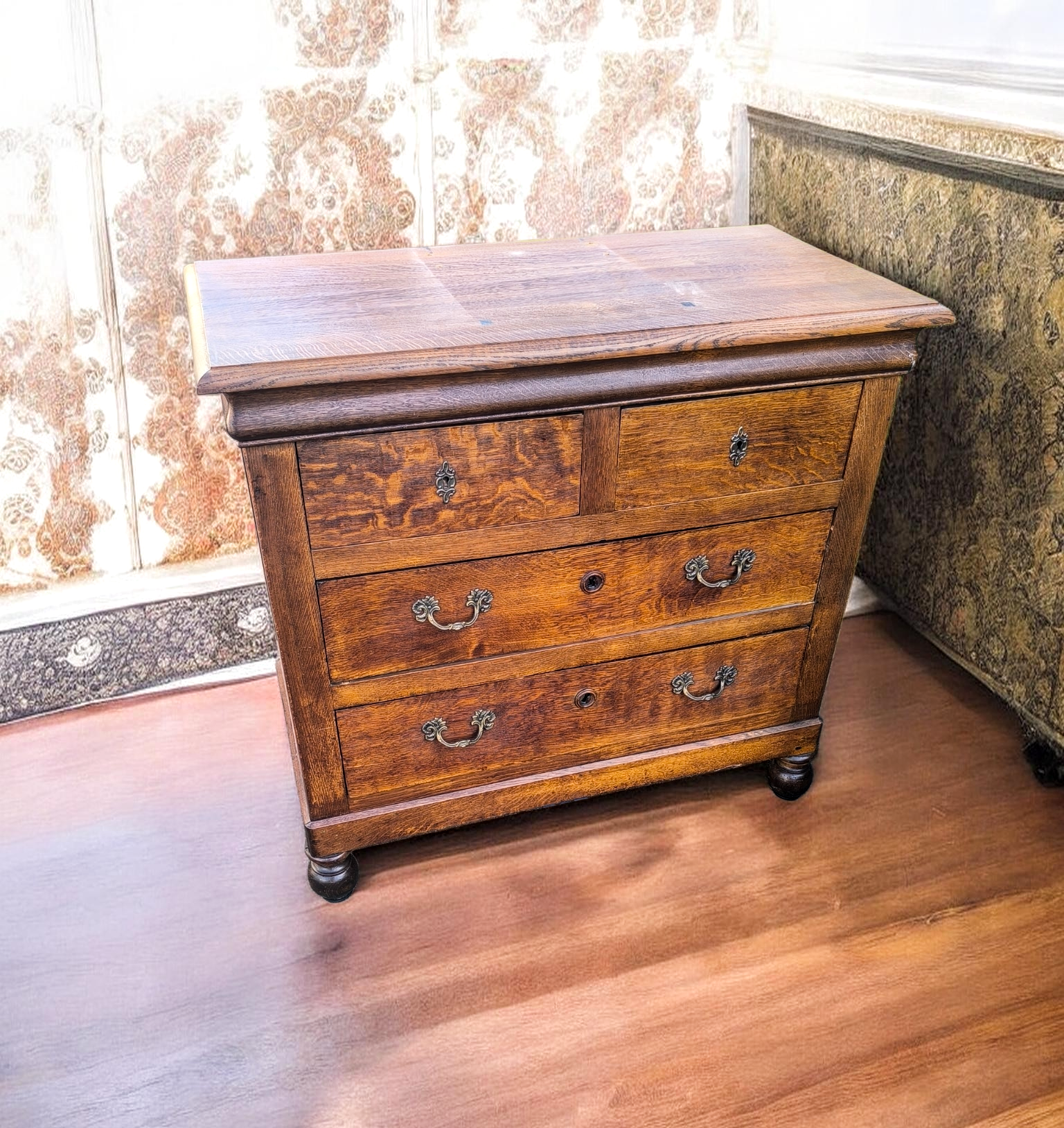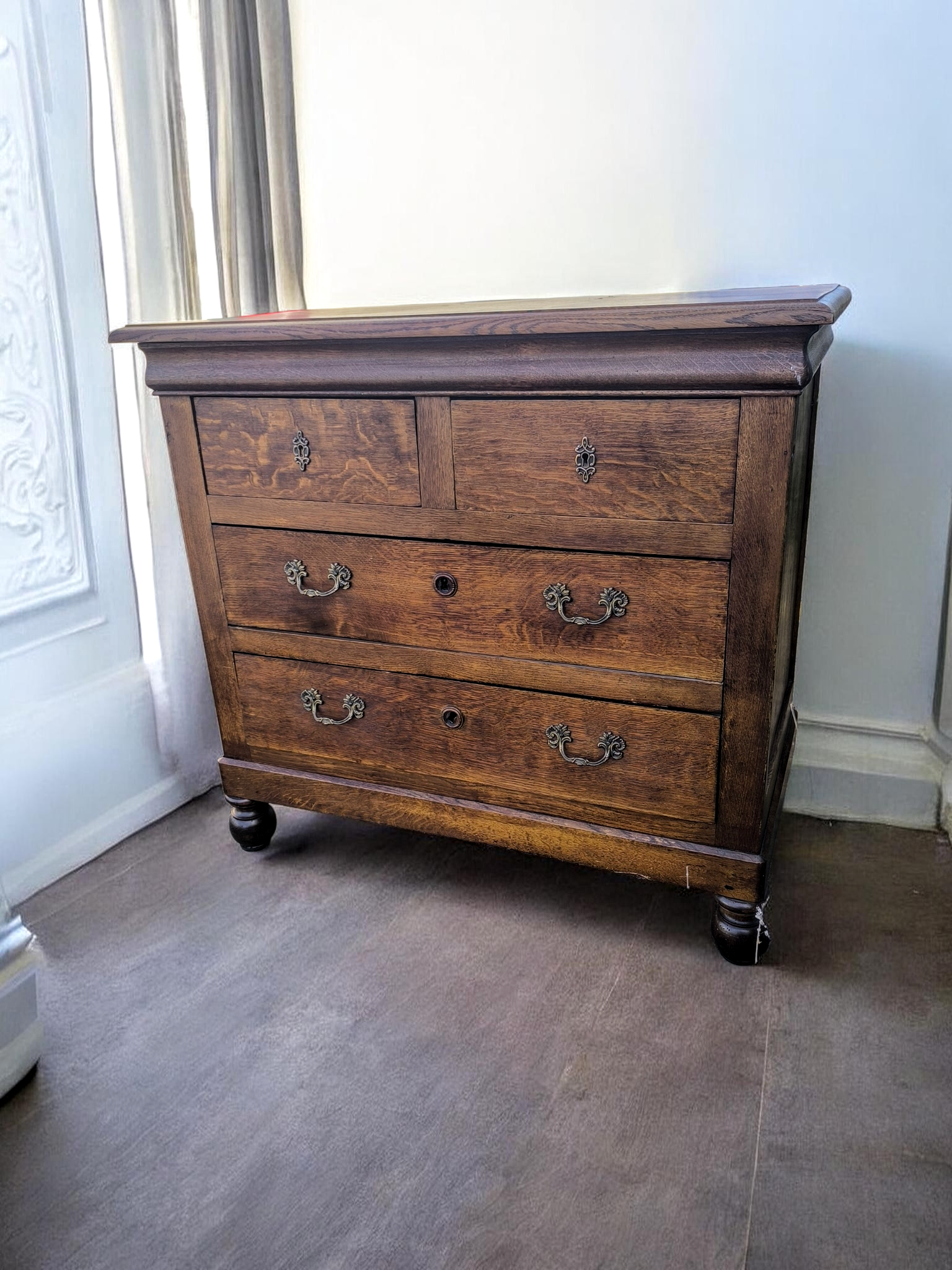 Felül 2 kisebb, alul 2 tágas, teljes szélességű fiók. Eredeti stílusú, díszes sárgaréz veretek és fogantyúk. Esztergált pogácsalábakon áll.