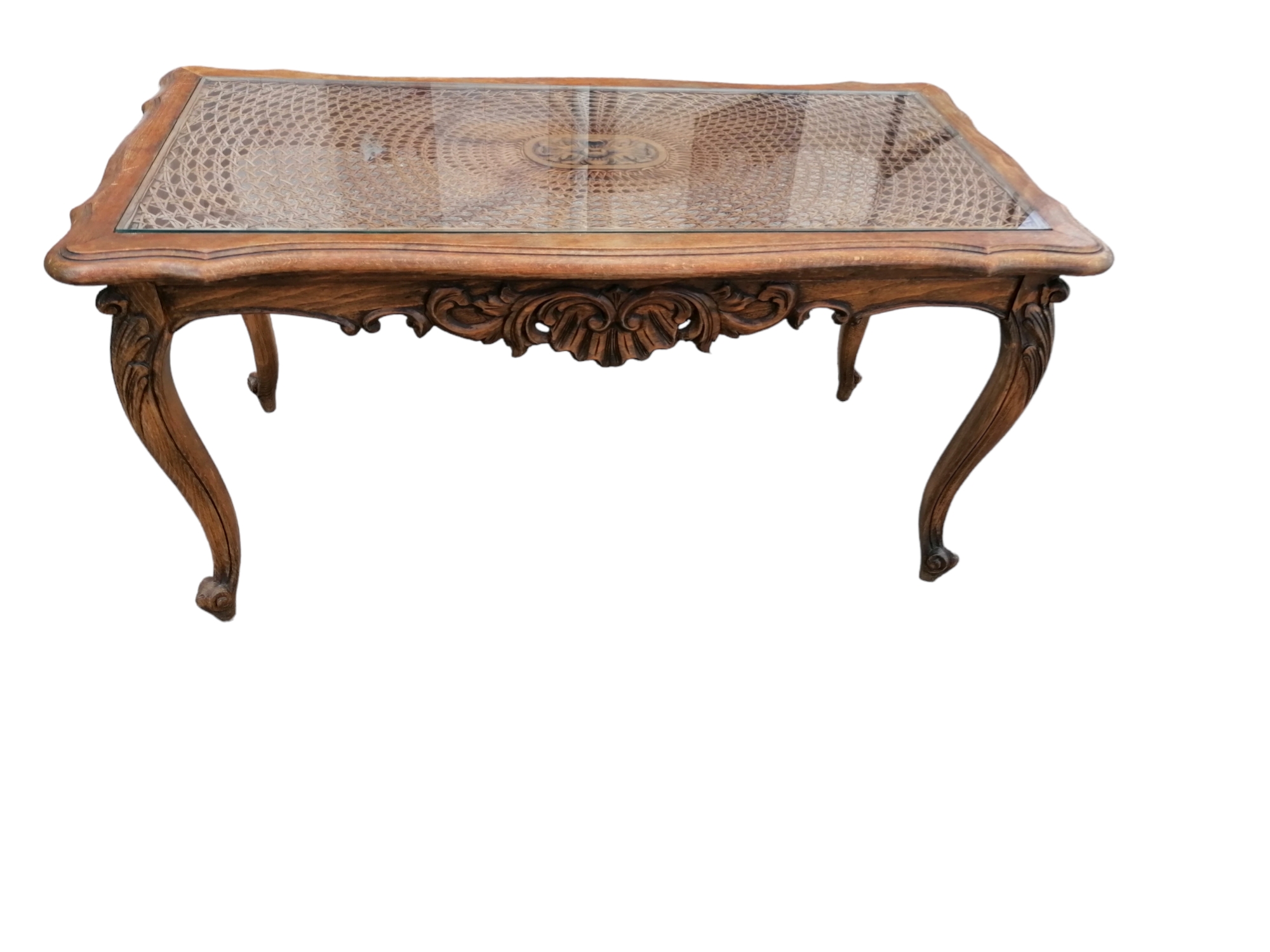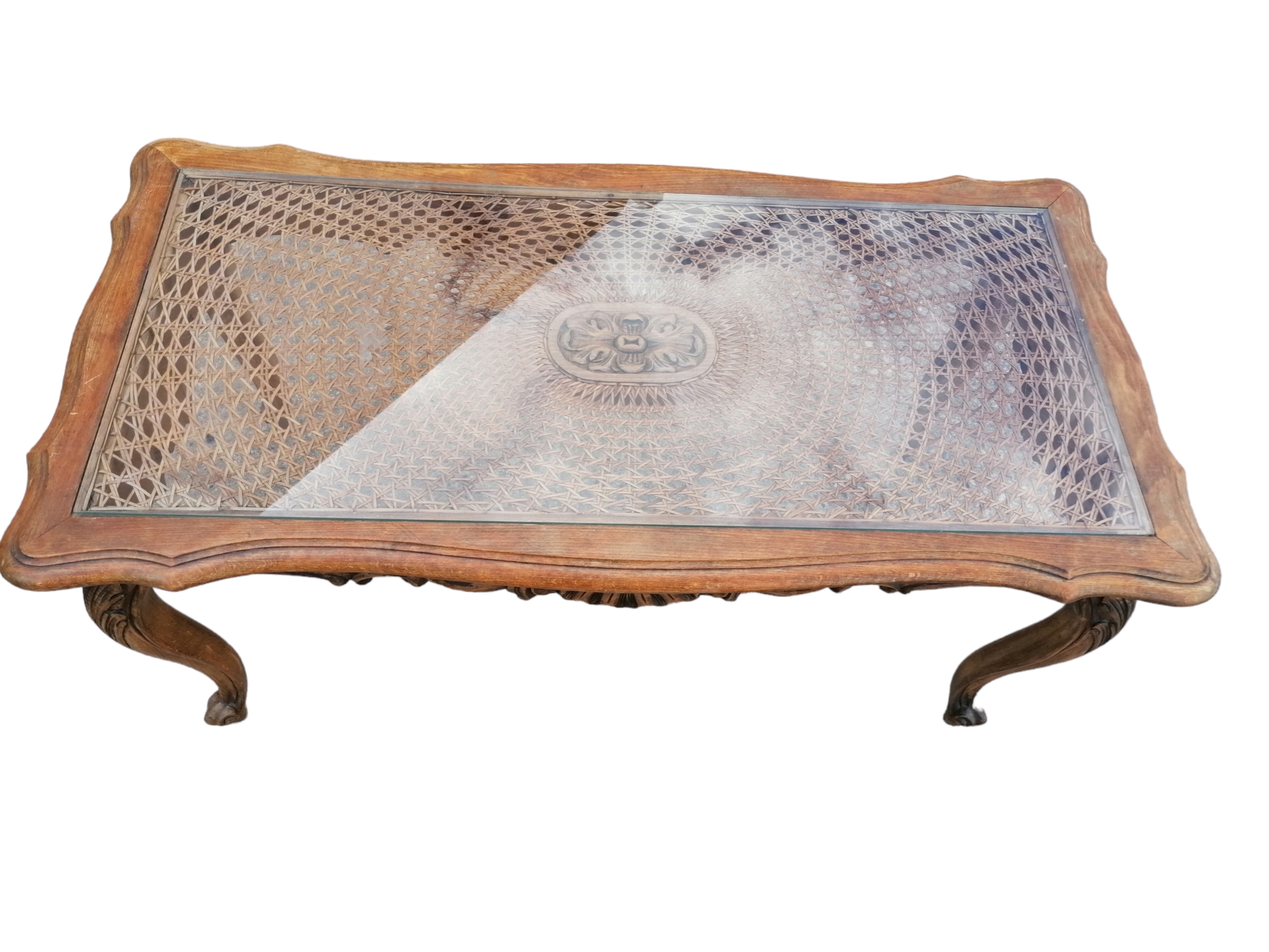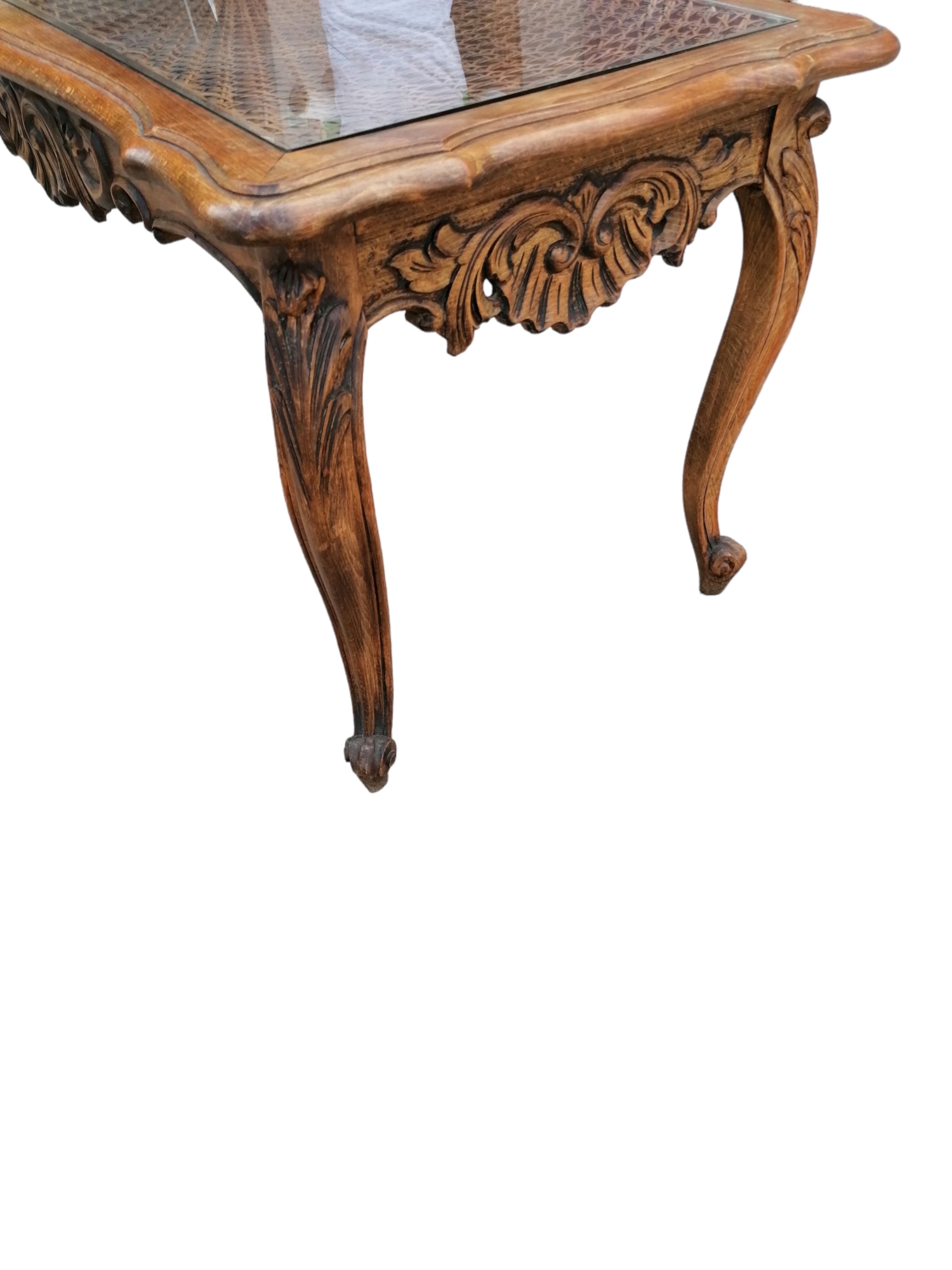 Szögletes formájú,rattan betéttel és üveglappal.Mívesen faragott oldalakkal,íves lappal.