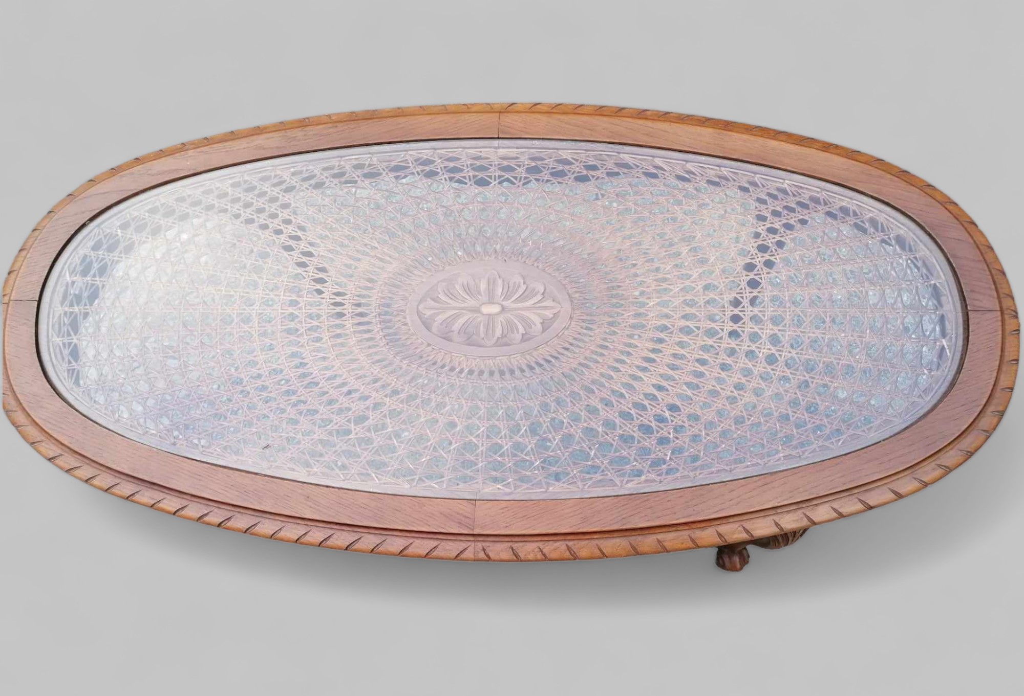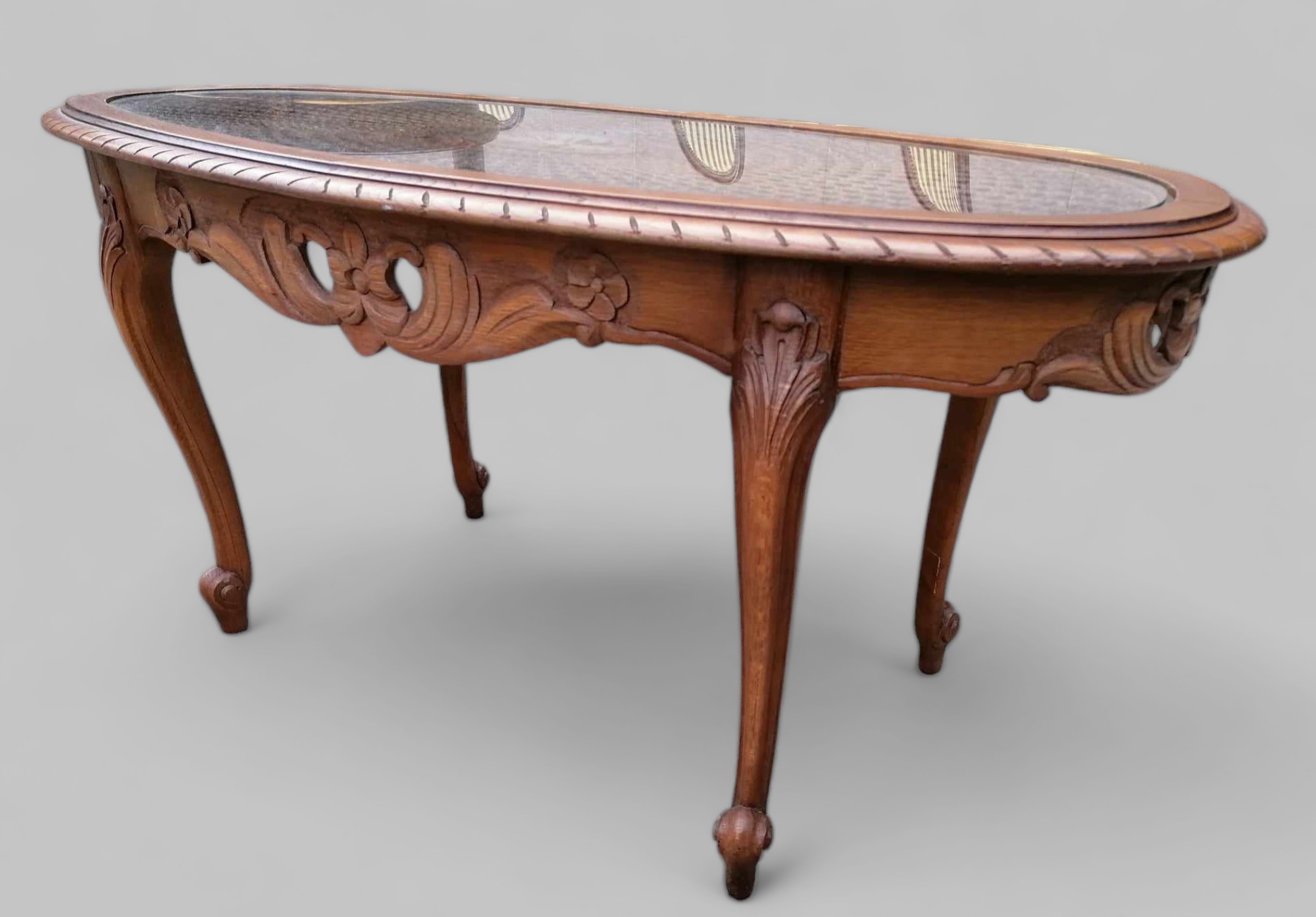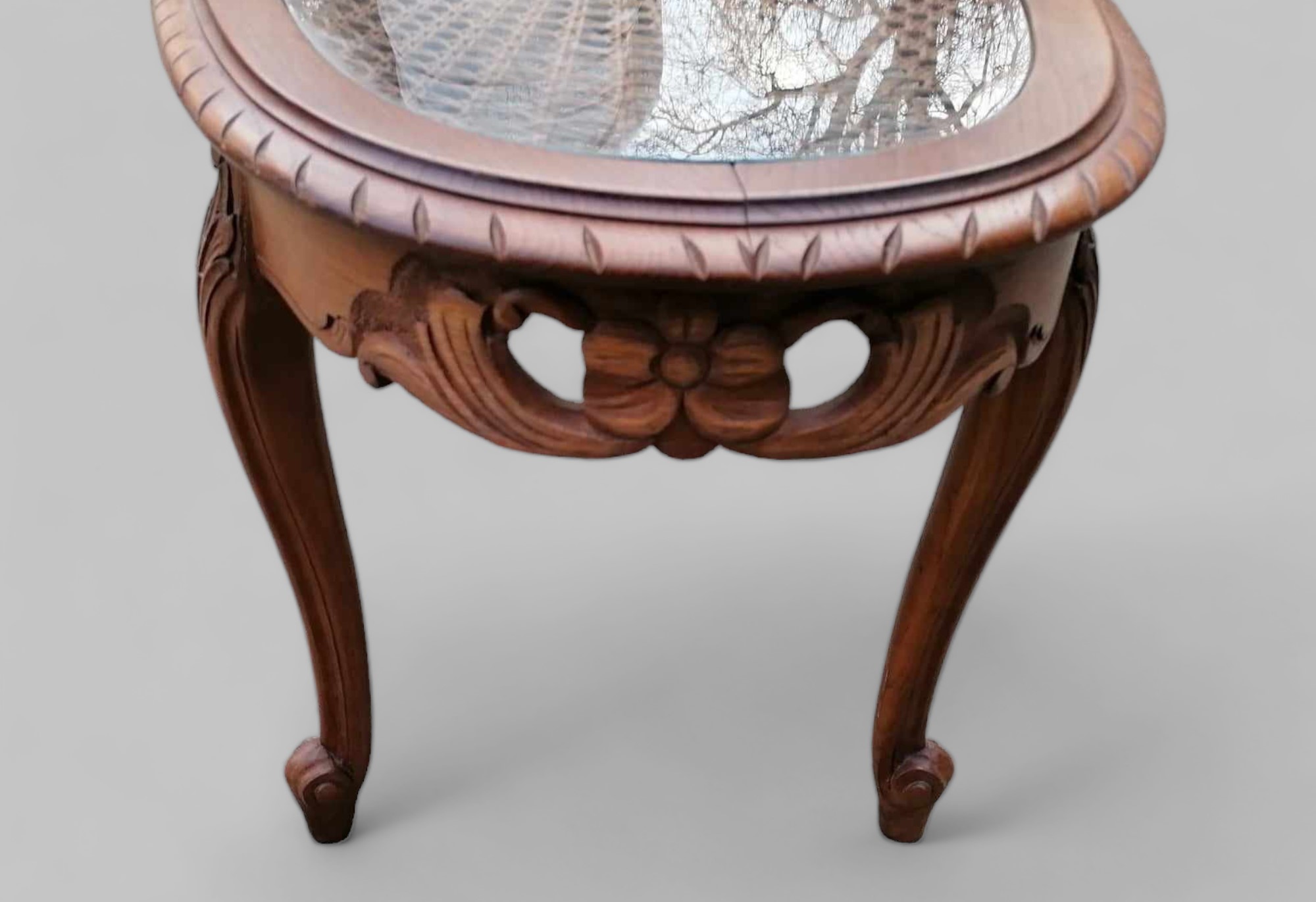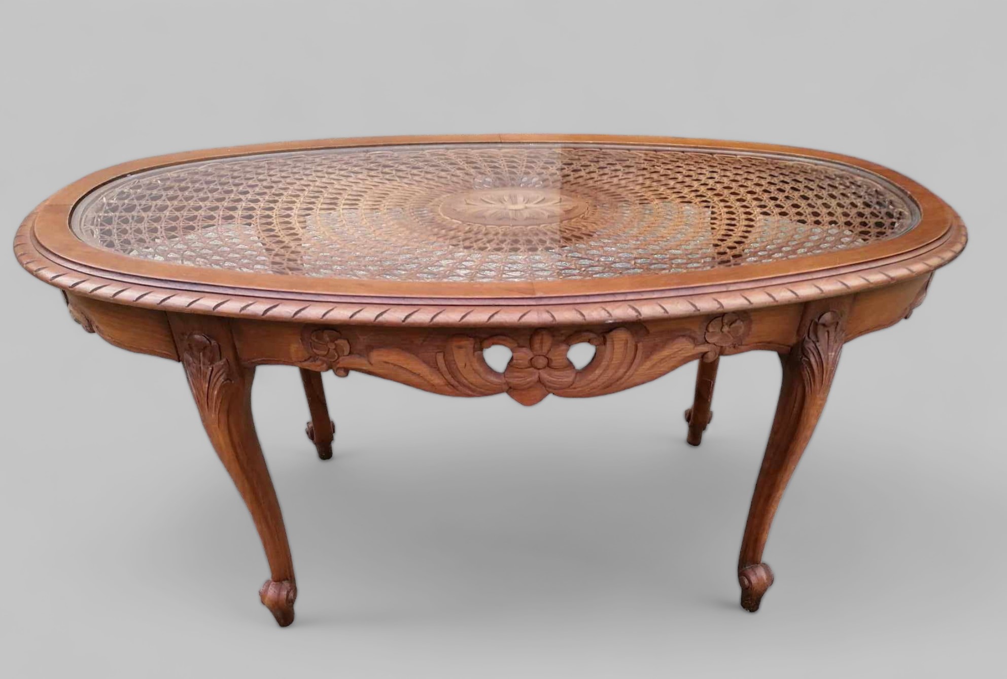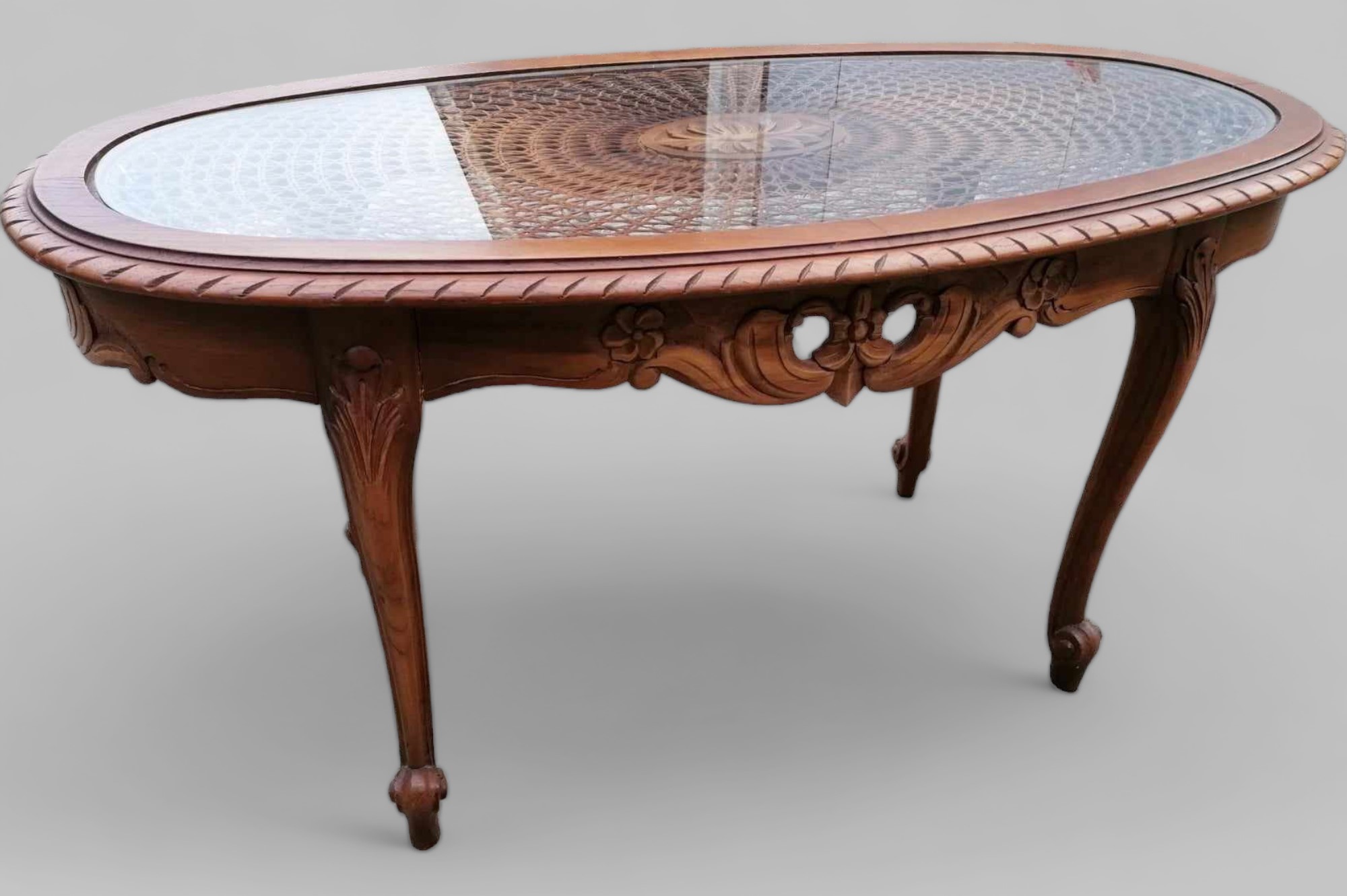 Eladó barokk ovális dohányzóasztal szép állapotban. Kecses, ívelt lábakkal, szoknyáján körben díszes áttört faragásokkal, tetején rattan díszítéssel, amelyet üveglap fed. Különleges, mutatós darab.