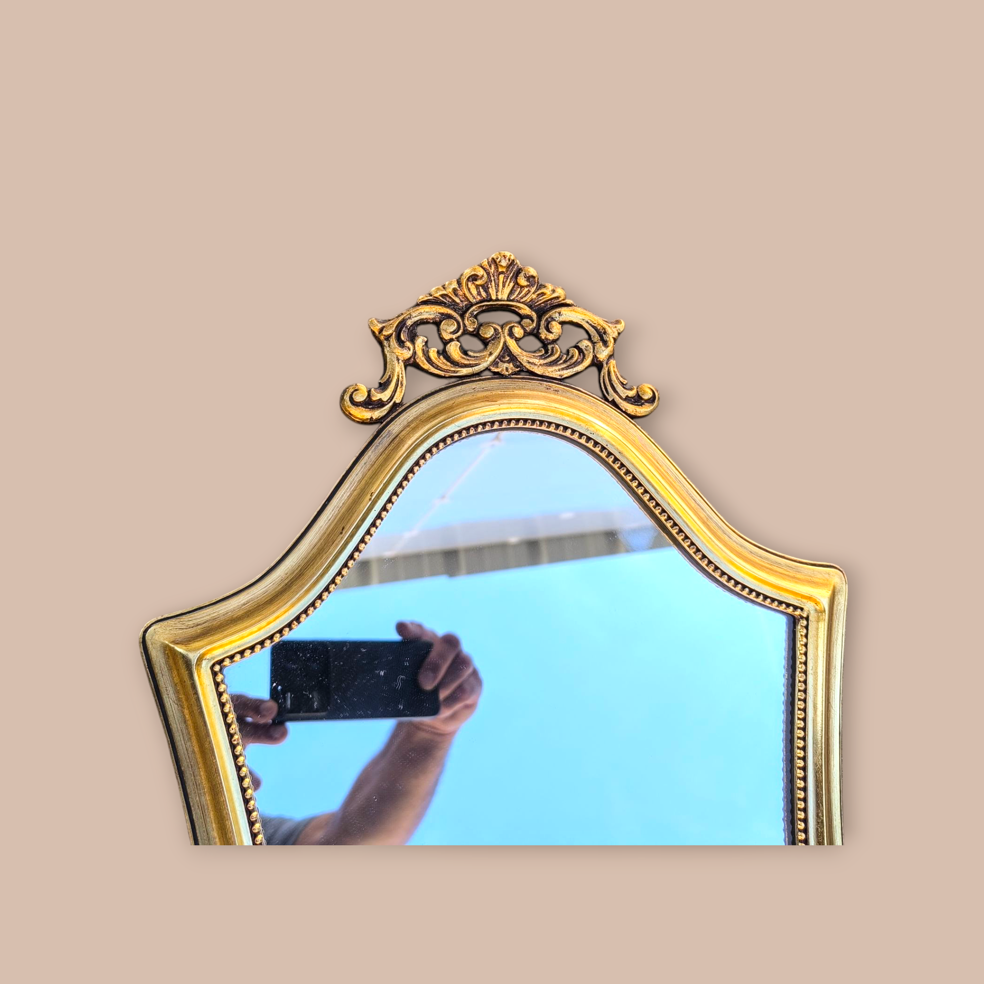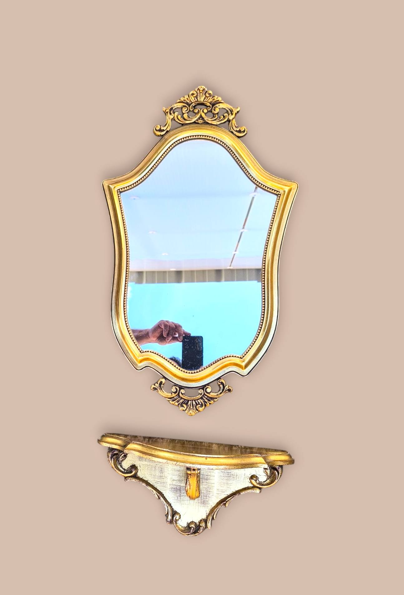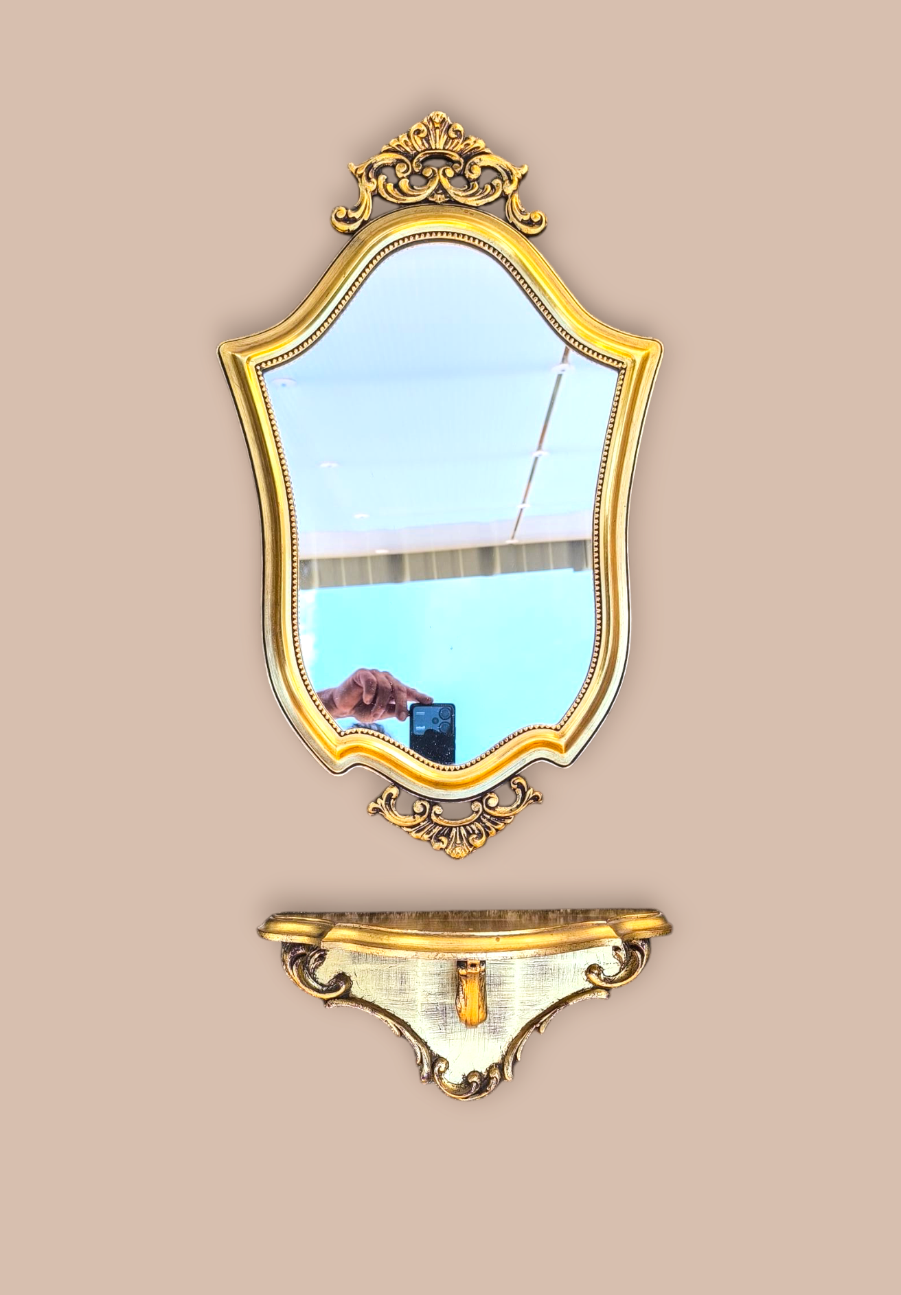 Eladásra kínálunk egy barokk stílusú tükröt a kis konzolasztalával.