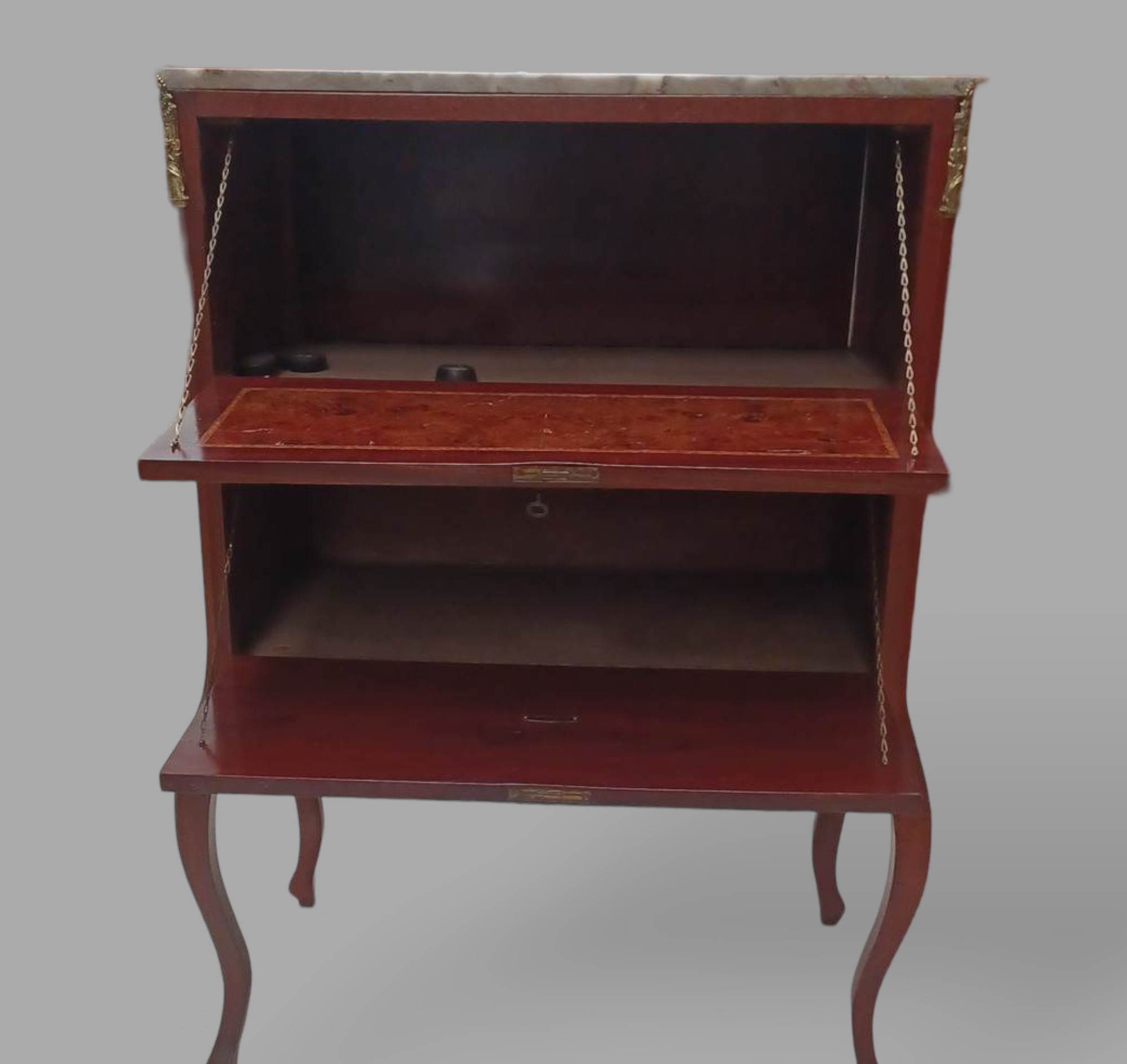Eladó barokk, magas fényű márványlapos komód szép állapotban. Az ajtók lefelé nyílnak, különleges réz veretekkel, magas lábakkal.