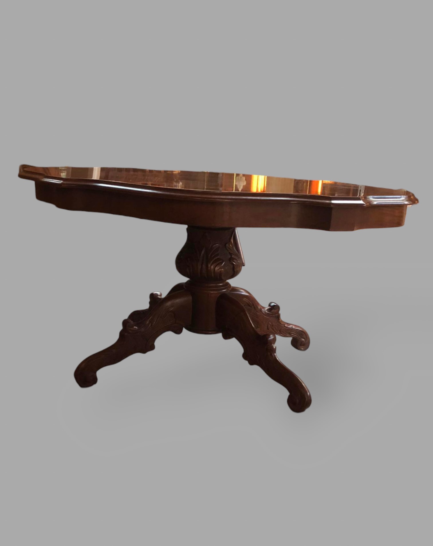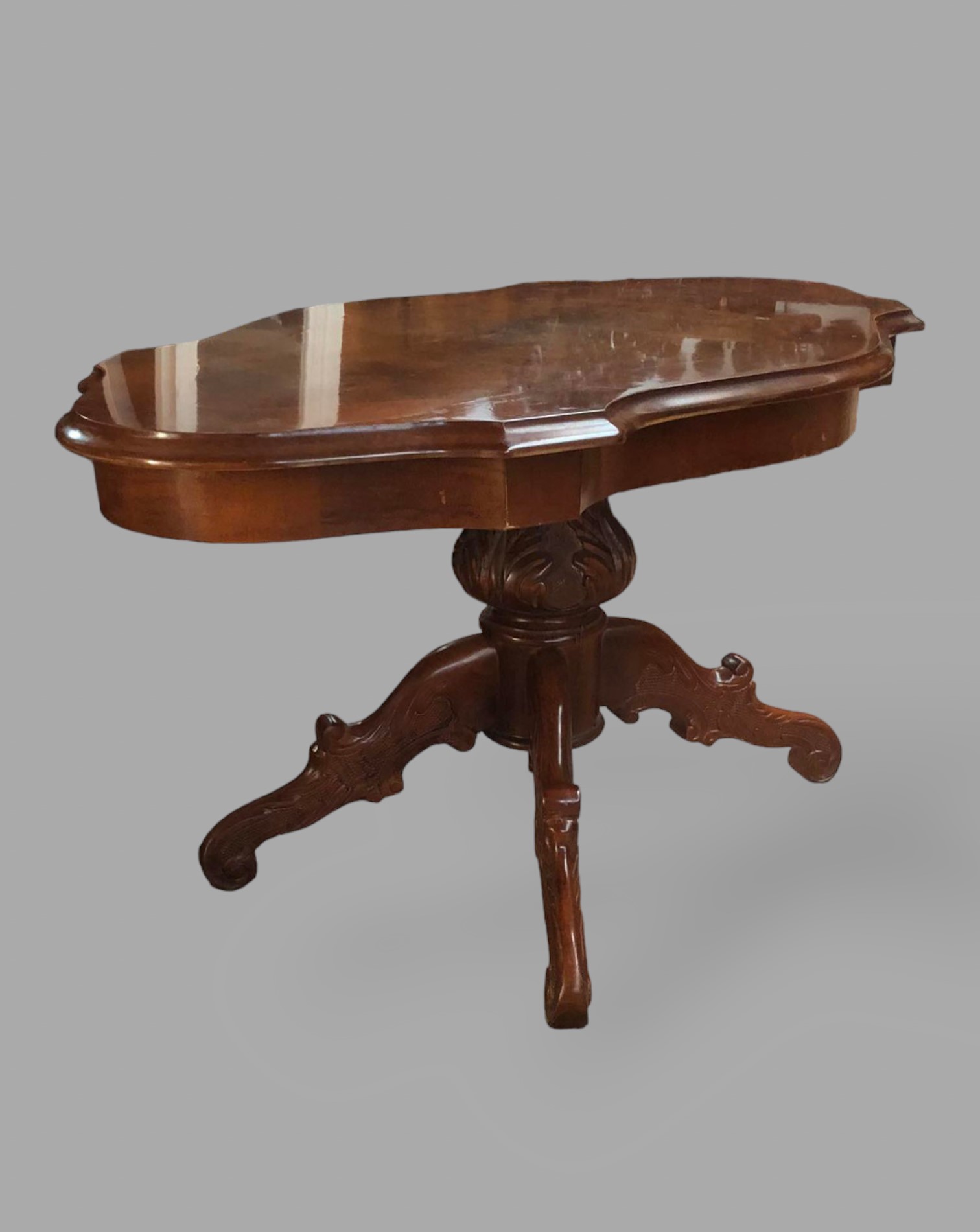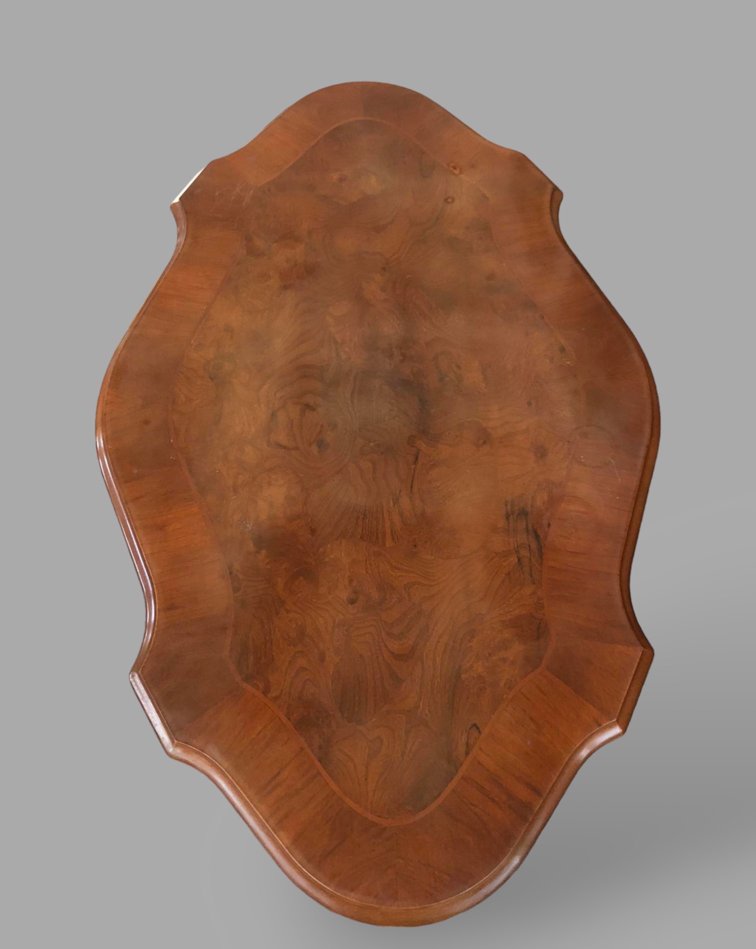Eladó barokk piskóta alakú dohányzóasztal szép állapotban. Kecses, faragaott lábakkal, díszes asztal lappal. Kecses, különleges darab.