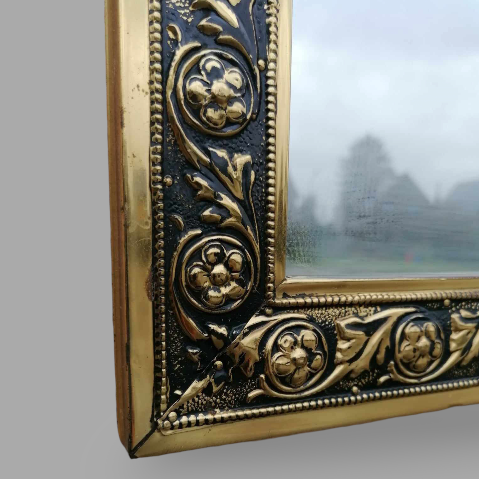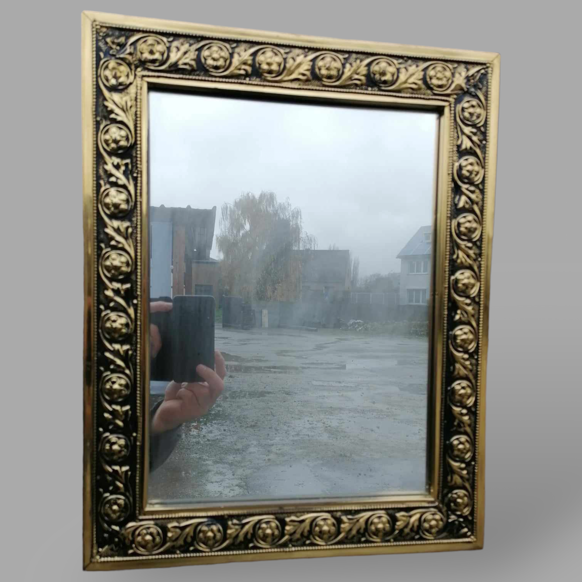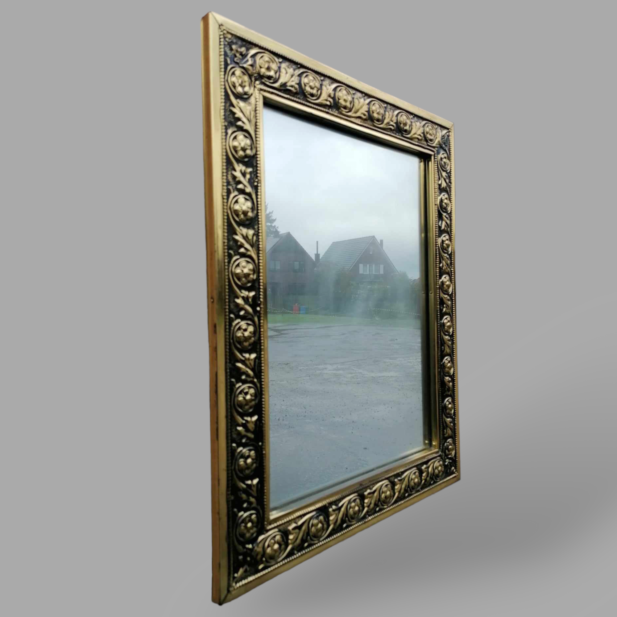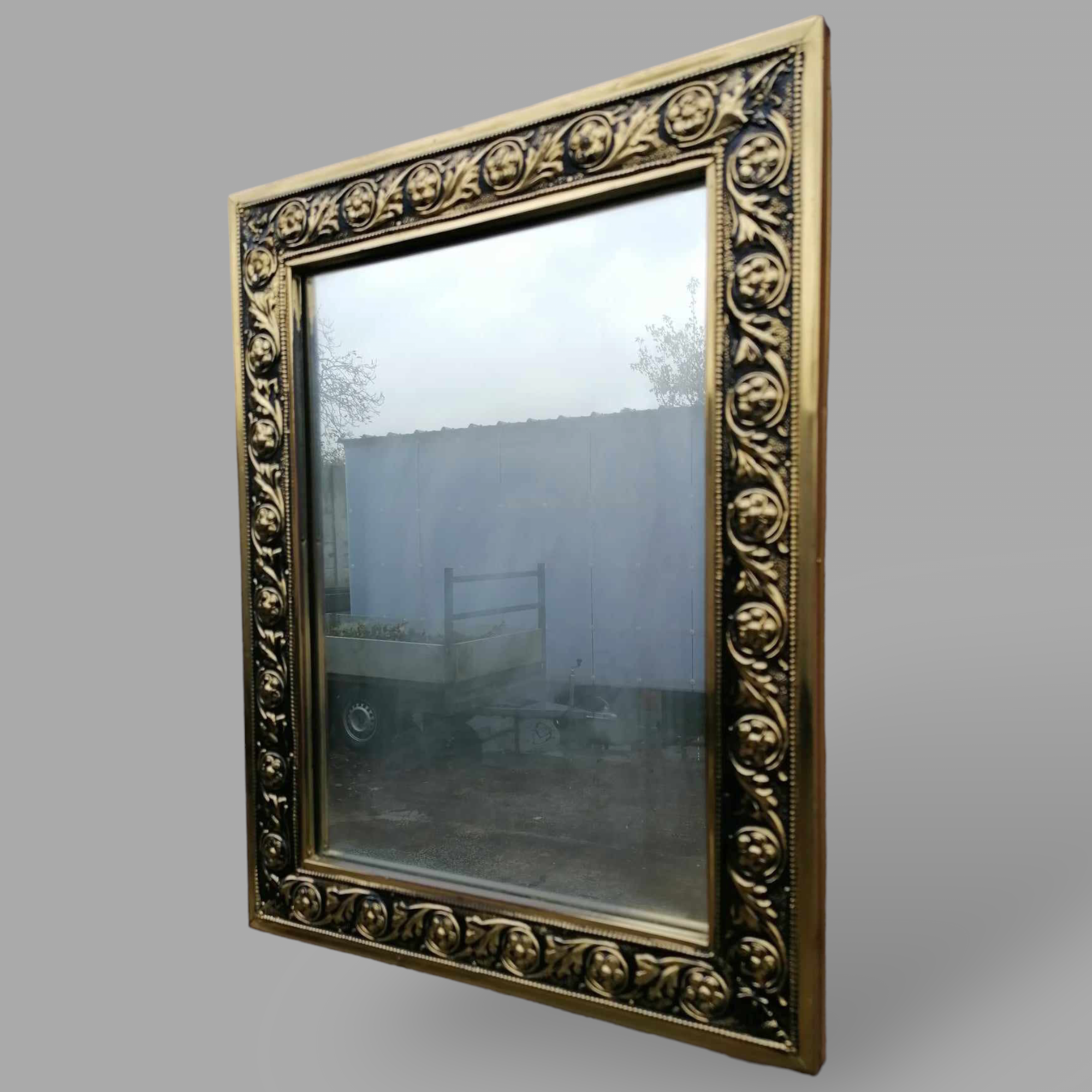 Eladó barokk tükör szép állapotban. Téglalap alakú, fa kereten mintásan nyomott réz lemez borítással. Különleges megjelenésű, ideális kisebb fürdőbe, előszobába.