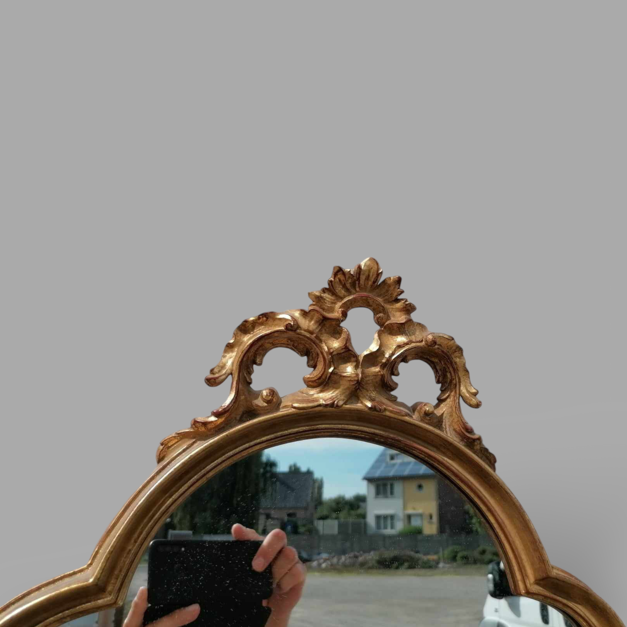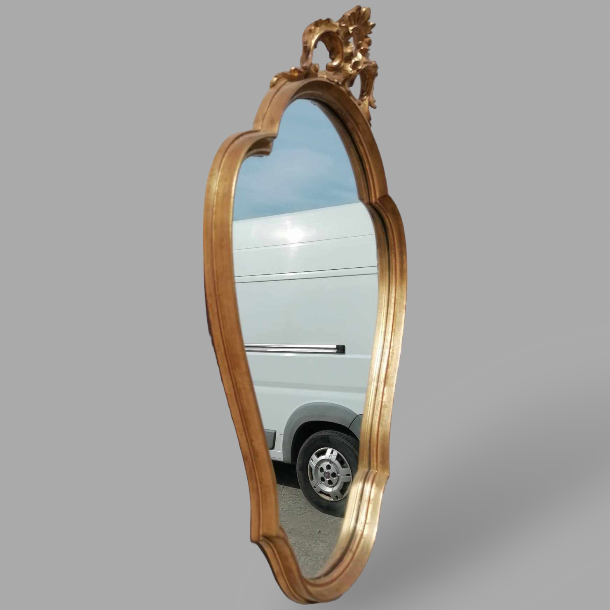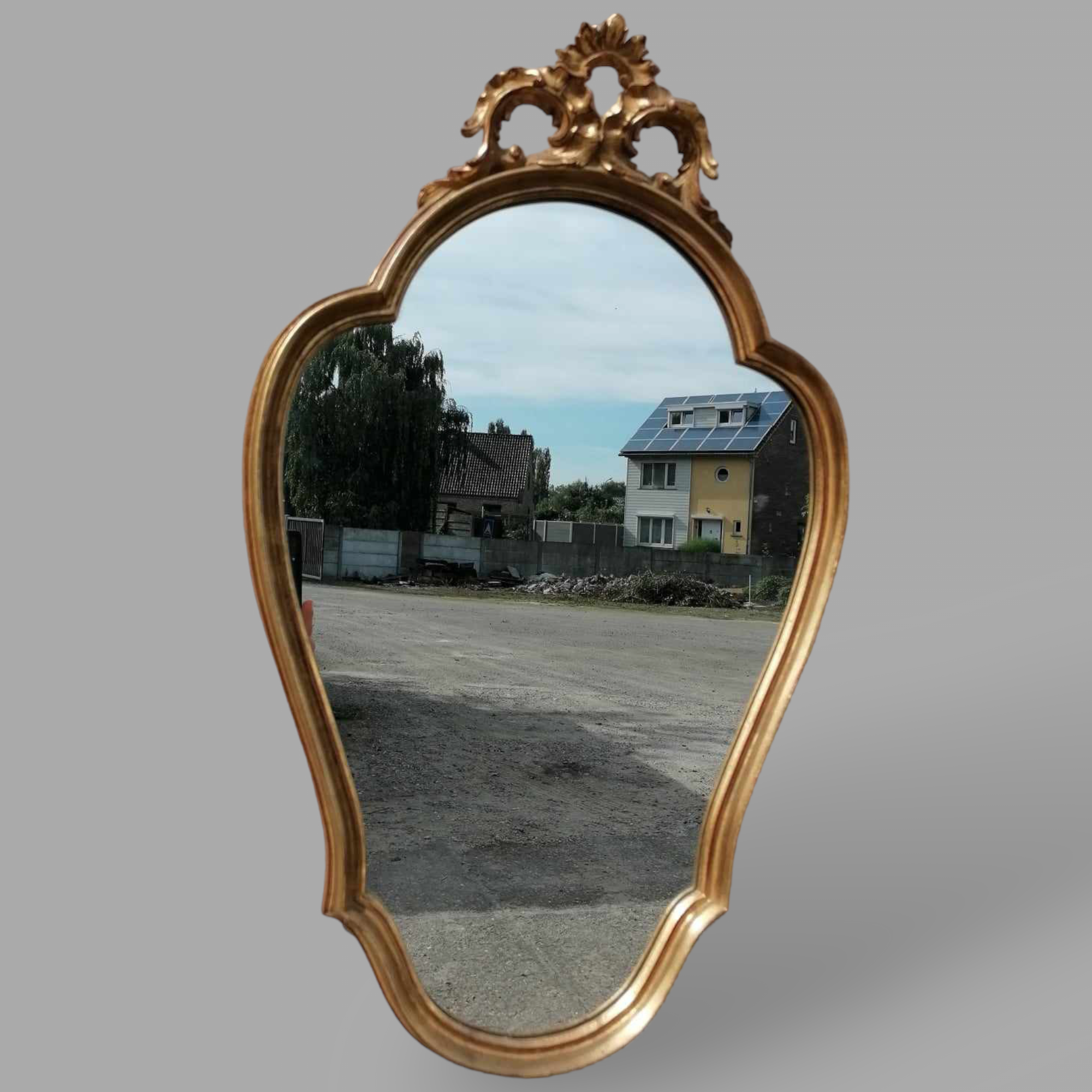 Eladó barokk tükör szép állapotban. Arany színű keskeny kerettel körben, tetején faragott csúcsdísz található. Hosszúkás alakja miatt ideális lehet mosdó fölé.