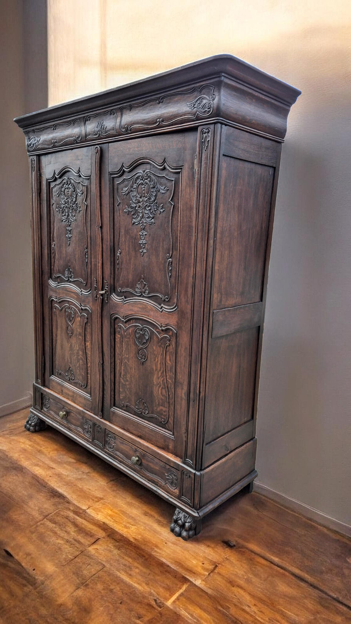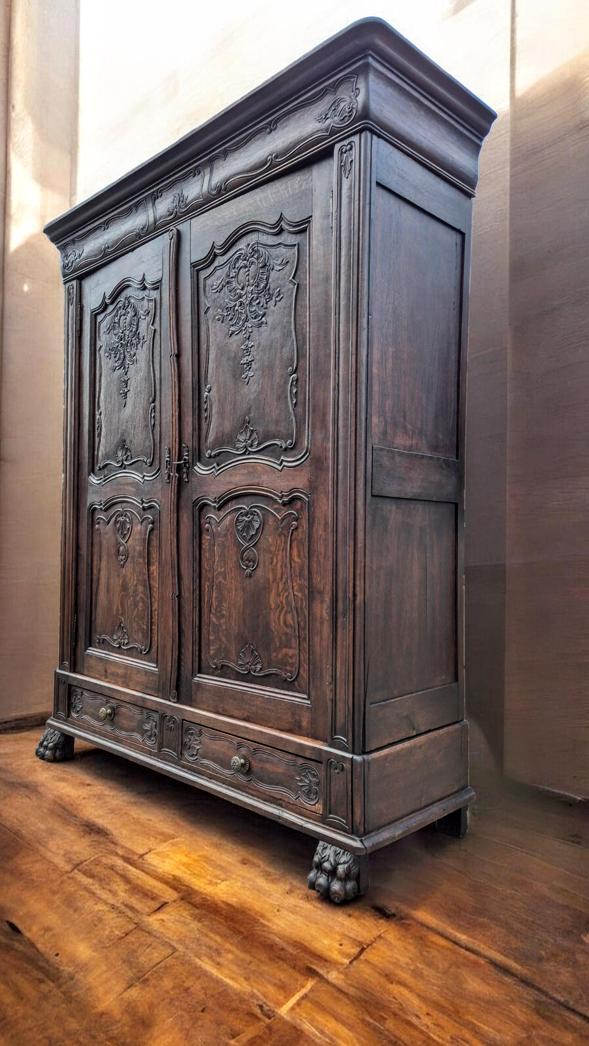 A szekrény alján látható robusztus, faragott oroszlánkörmös lábak a hatalmat és a nemességet szimbolizálják,