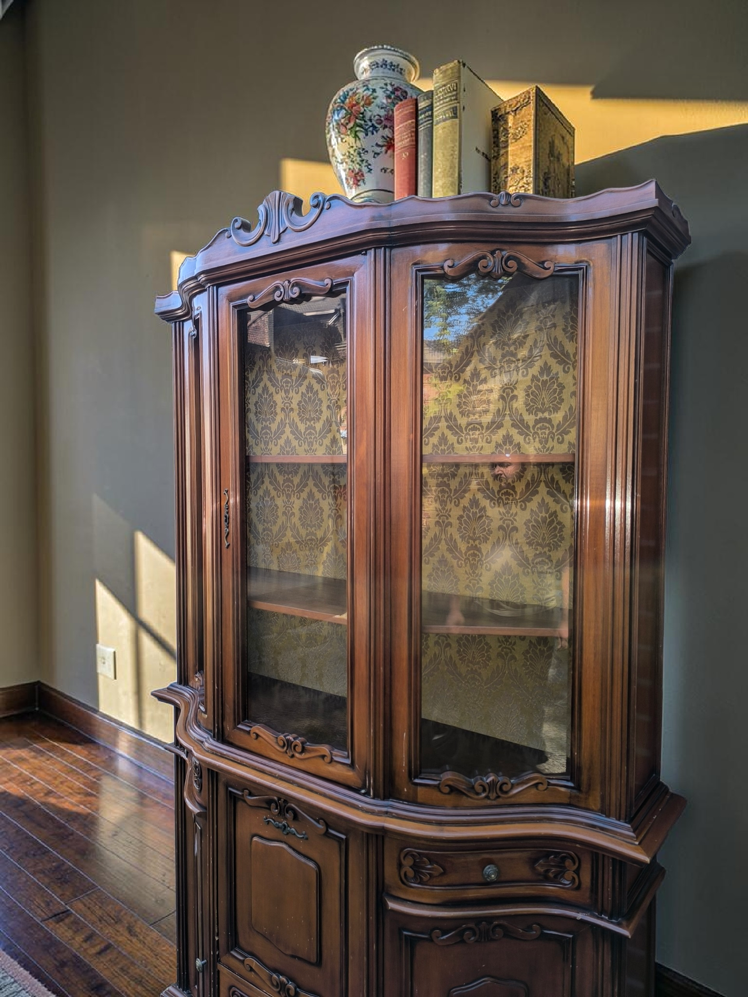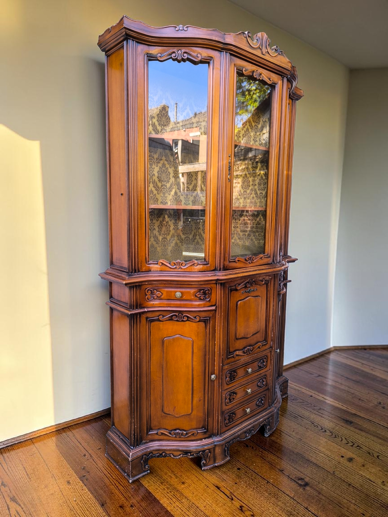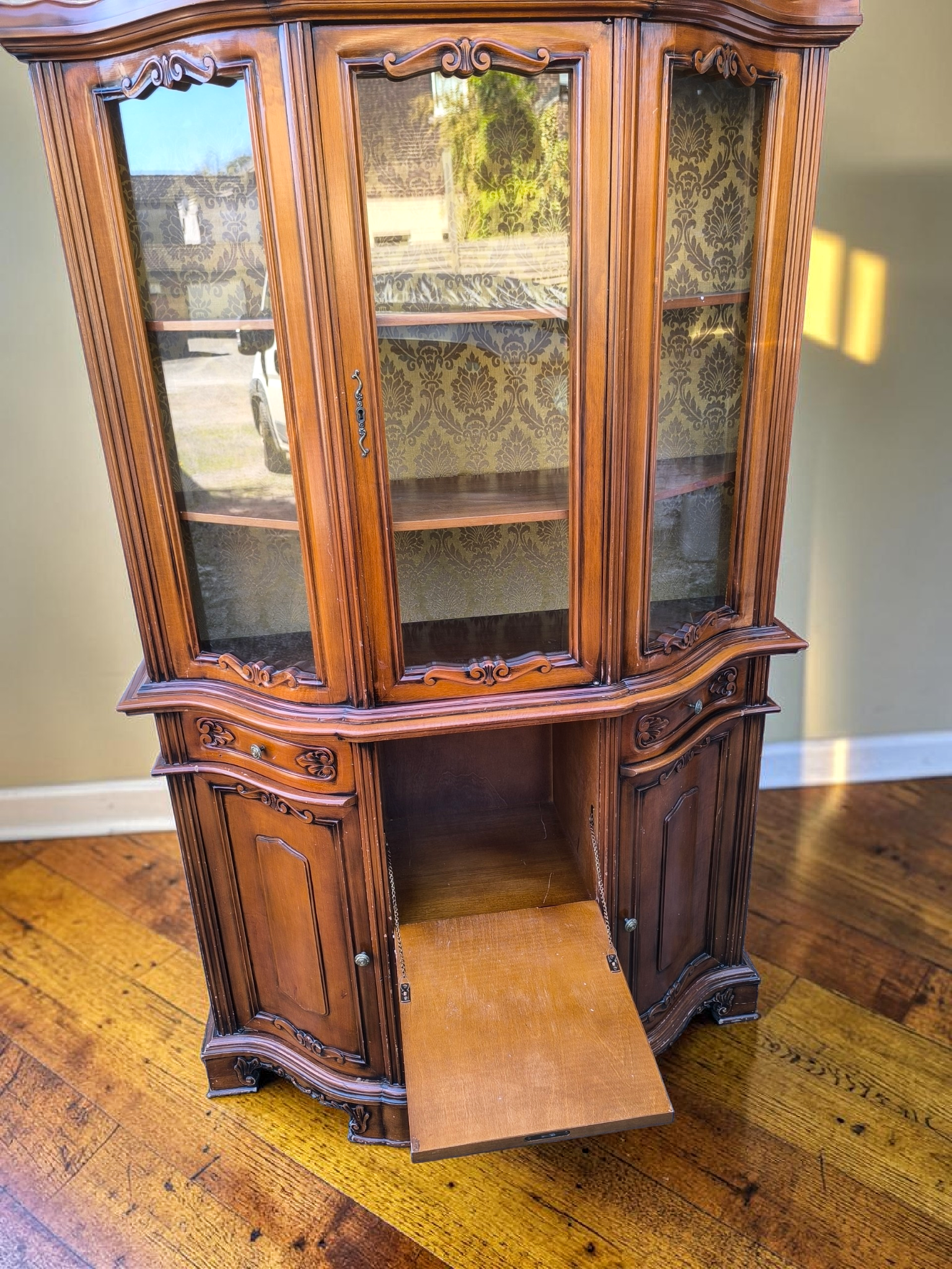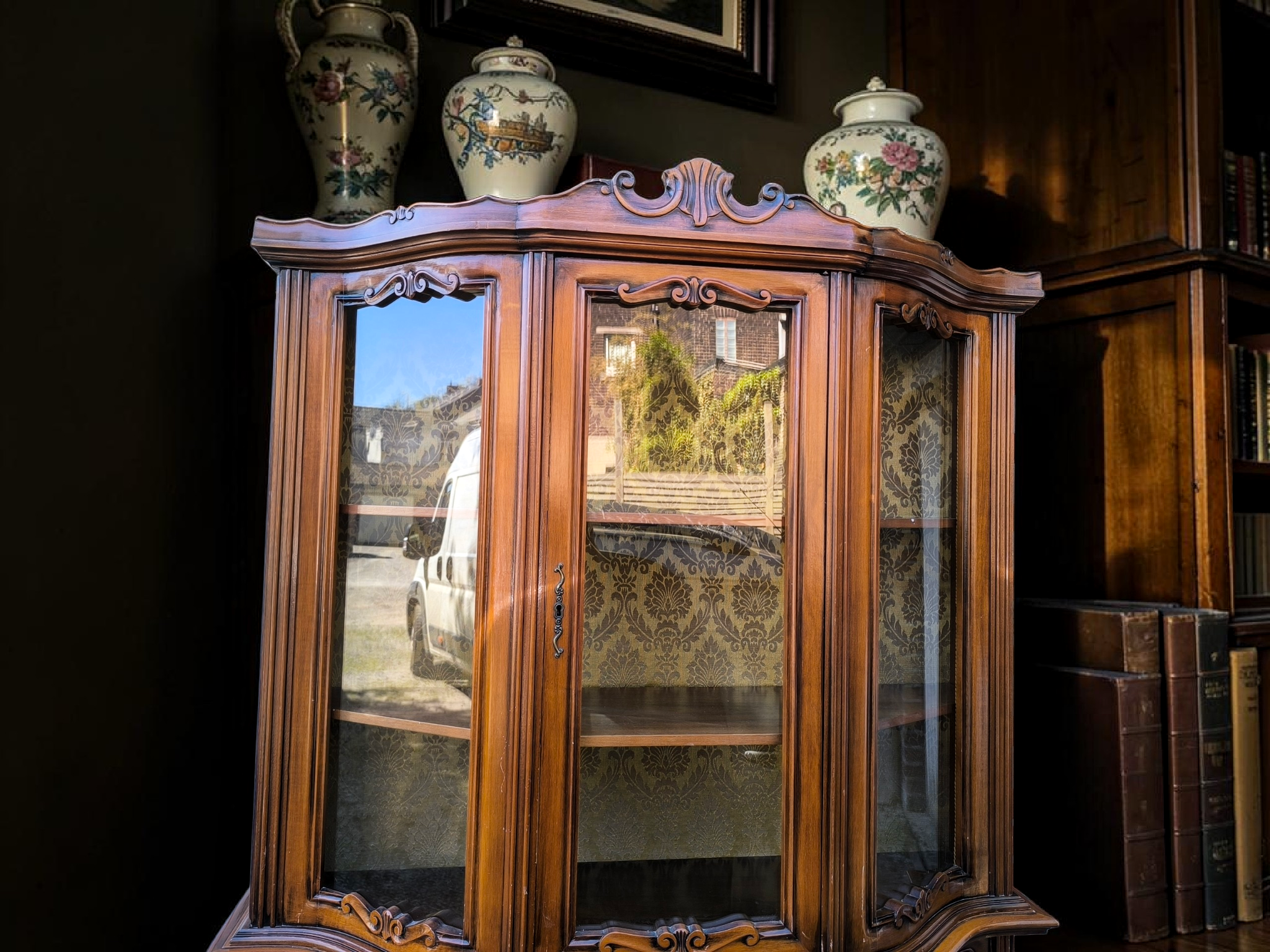 Felső része üvegezett vitrin, íves kialakítással, belső hátfala dekoratív mintás kárpittal bevont, ami kiemeli a benne elhelyezett tárgyak szépségét.