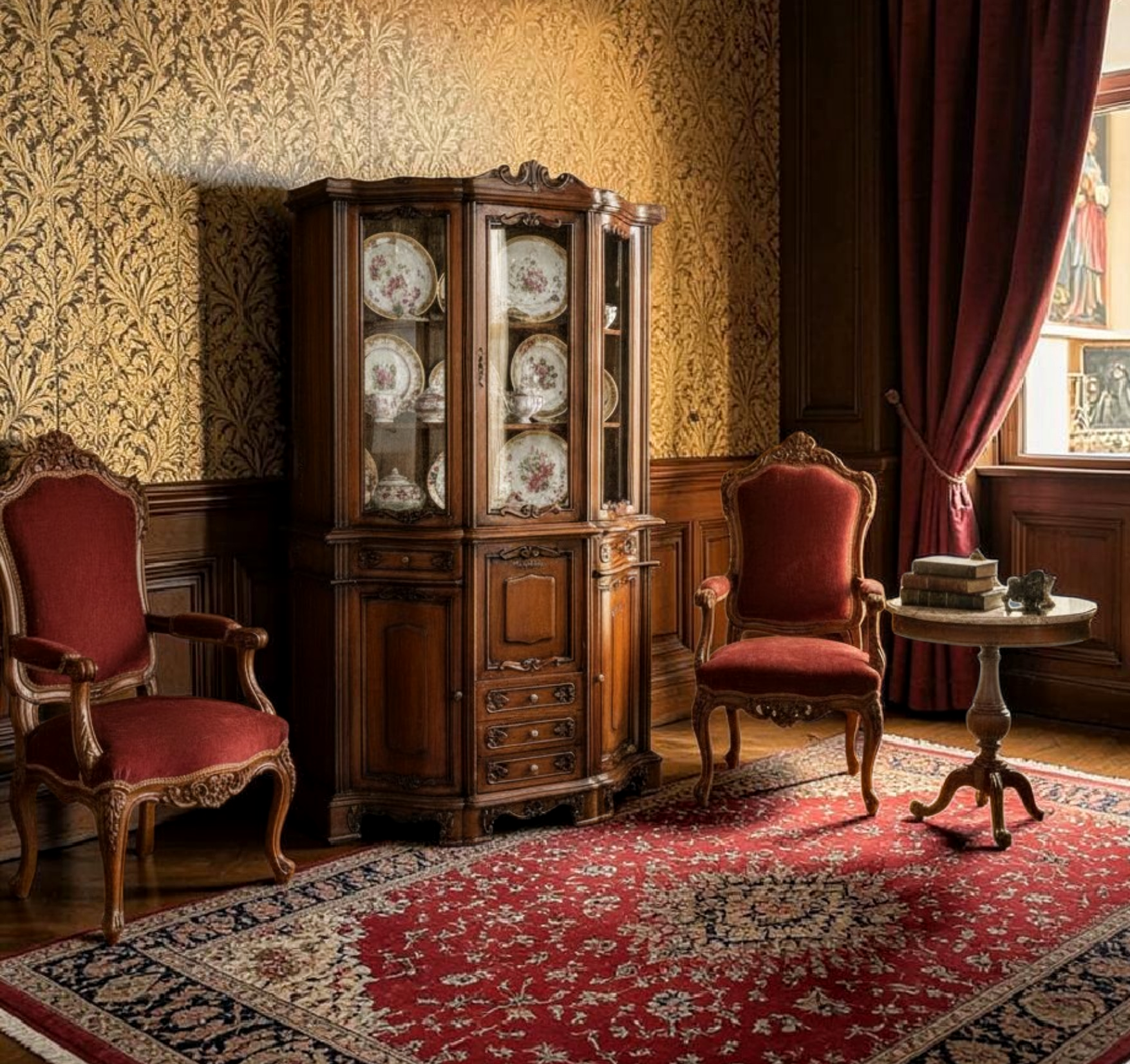 A hullámos párkányzat, az ívelt üvegezés és a hangsúlyos faragott minták az antik jellegű, elegáns enteriőrök kedvelt darabjává teszik.