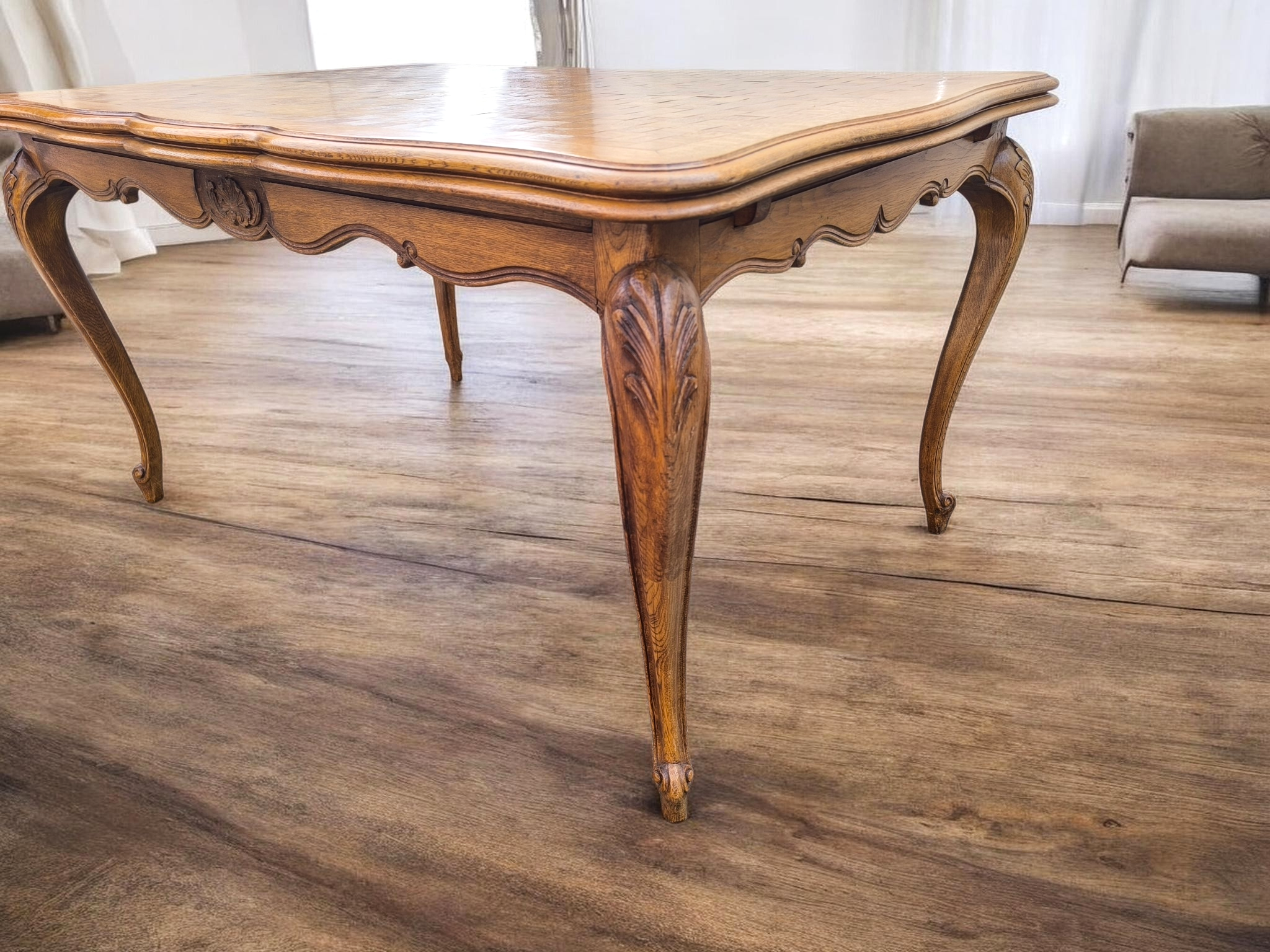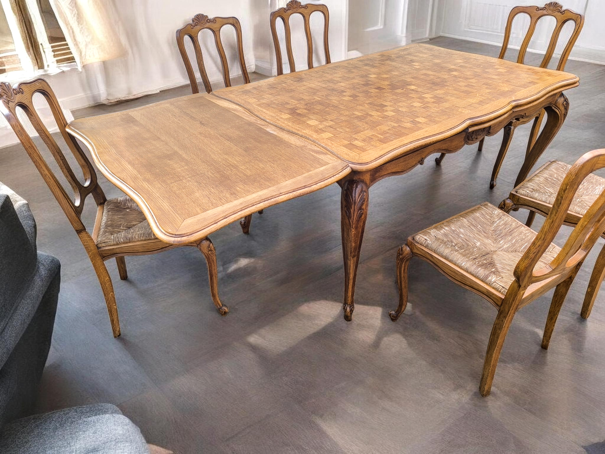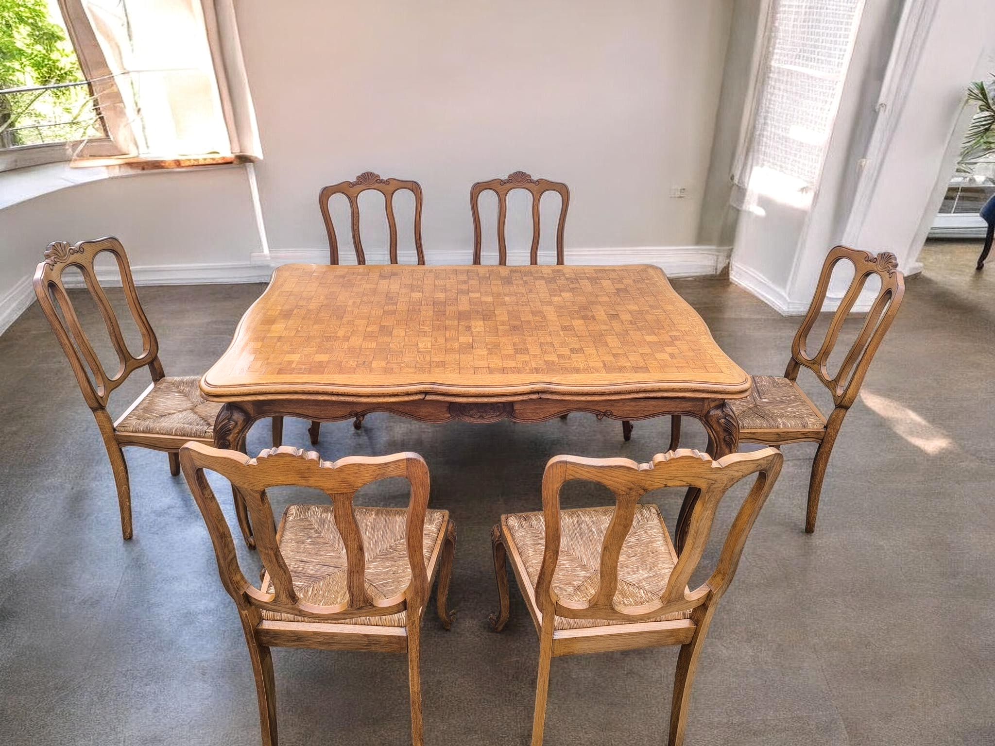Az asztalt és a székeket is ívelt, úgynevezett kabriol lábak jellemzik, amelyek a barokk és rokokó stílus eleganciáját idézik.Az asztal tetejét geometrikus, "parketta" mintázatú fa berakás díszíti.Bővíthető, így nagyobb családi eseményekhez is ideális.