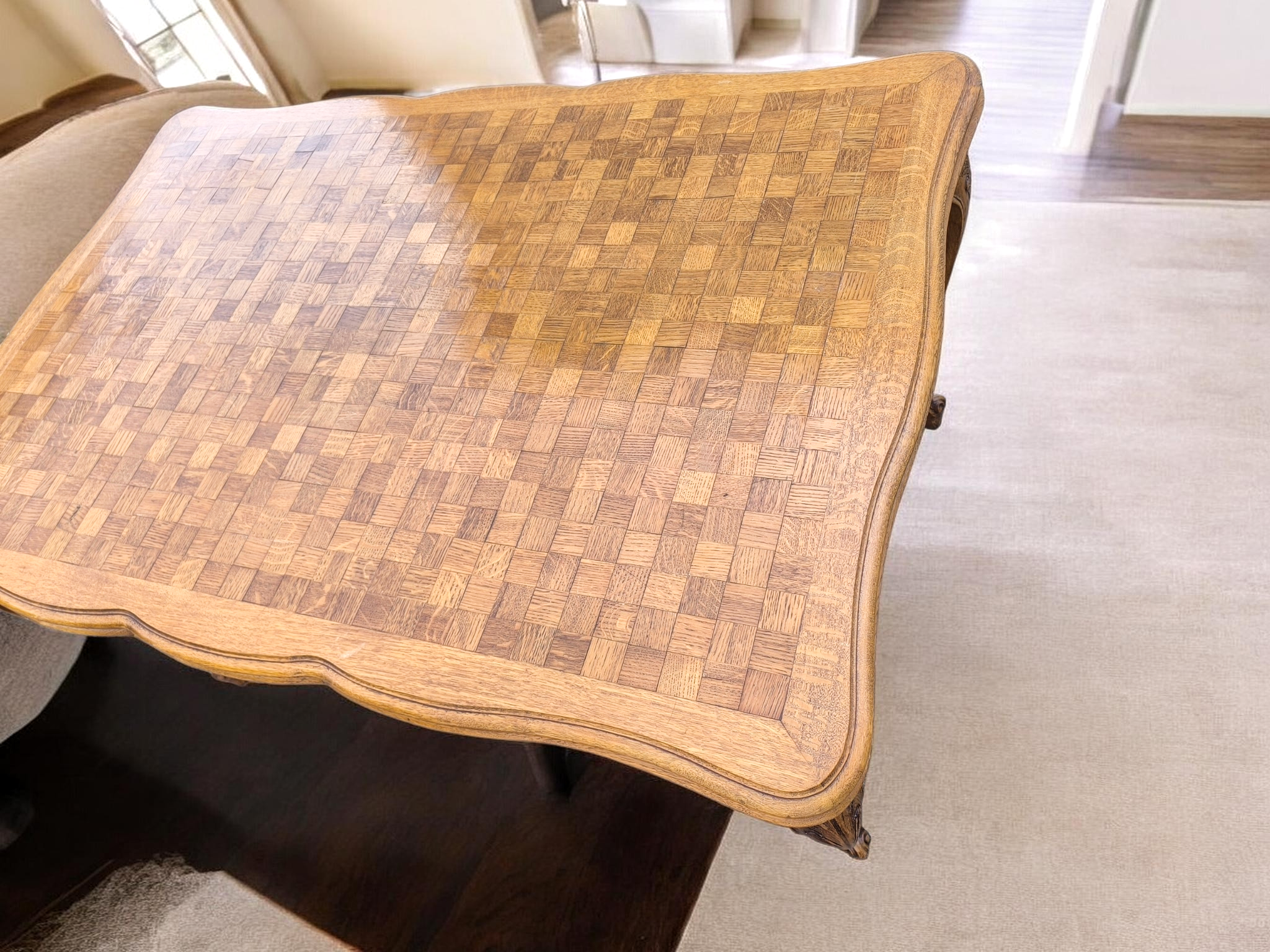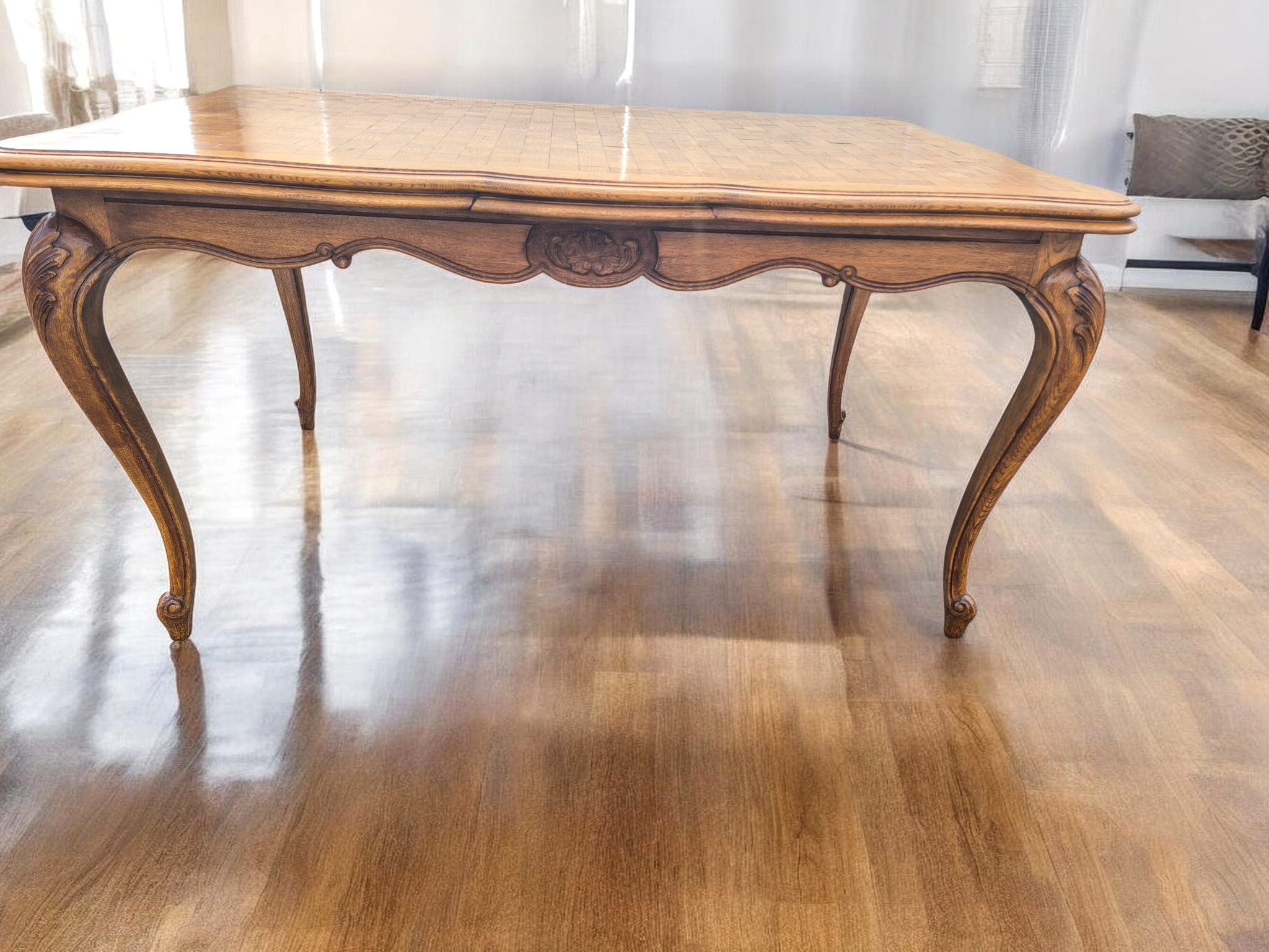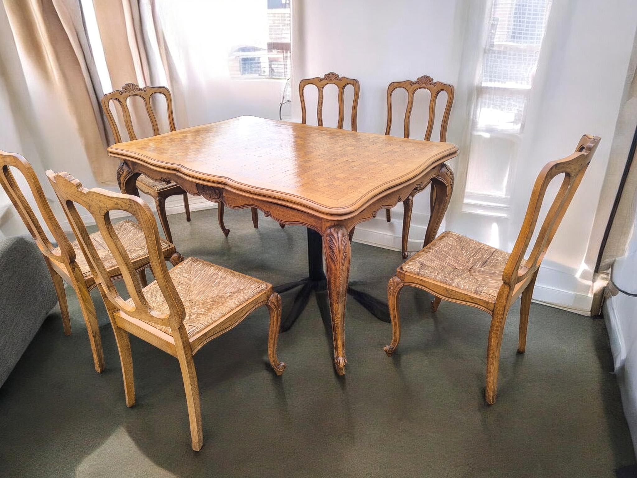 Az asztalt és a székeket is ívelt, úgynevezett kabriol lábak jellemzik, amelyek a barokk és rokokó stílus eleganciáját idézik.Az asztal tetejét geometrikus, "parketta" mintázatú fa berakás díszíti.Bővíthető, így nagyobb családi eseményekhez is ideális.