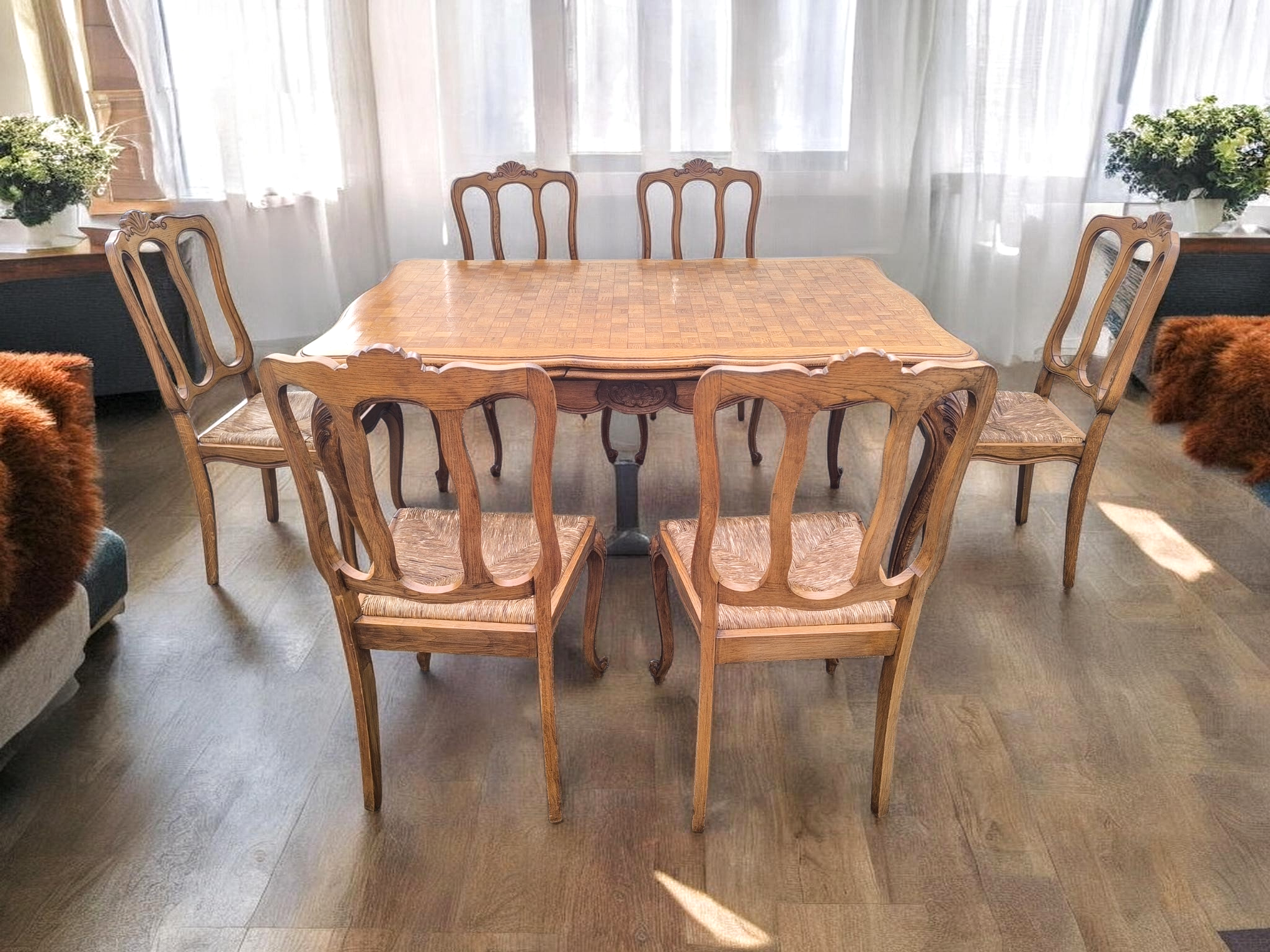 6 darab hozzáillő, masszív fa szék tartozik hozzá. Az ülőfelületek hagyományos fonott (nád/gyékény) technikával készültek, melyek kényelmesek és jó állapotúak.