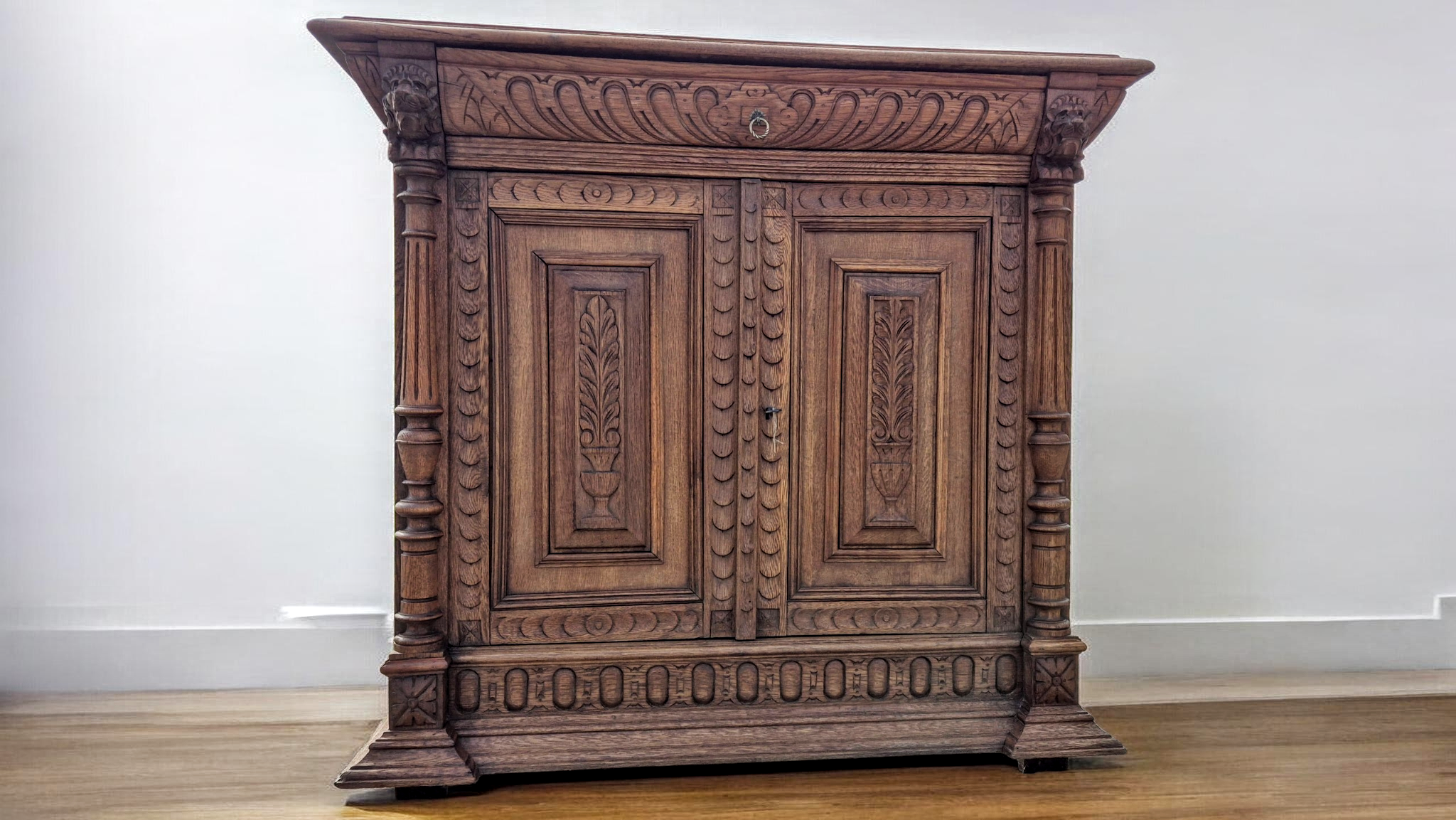 Az éleken karakteres oroszlánfejes faragások, az ajtókon geometrikus és növényi motívumok, oldalán esztergált oszlopdíszek találhatók.