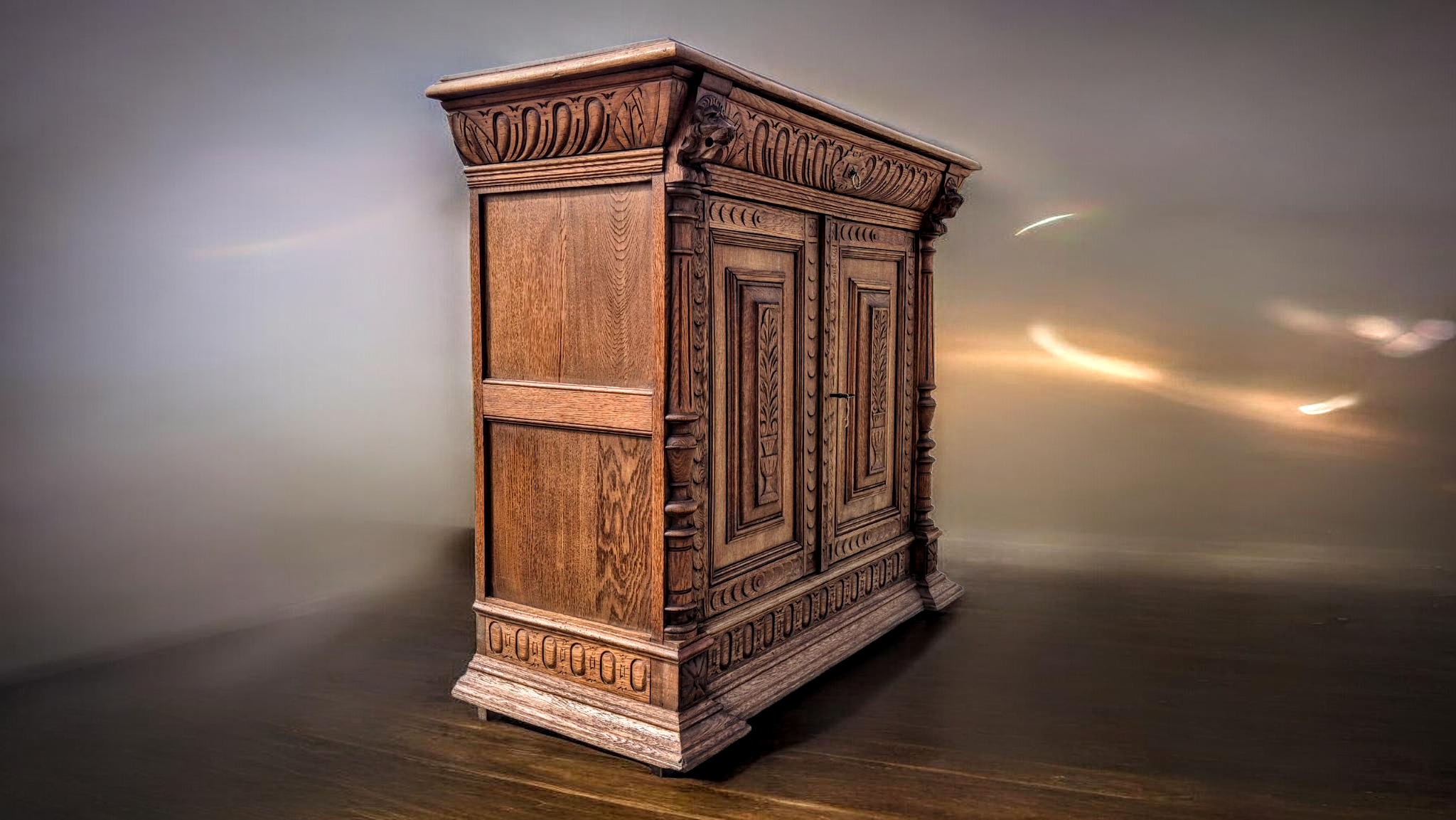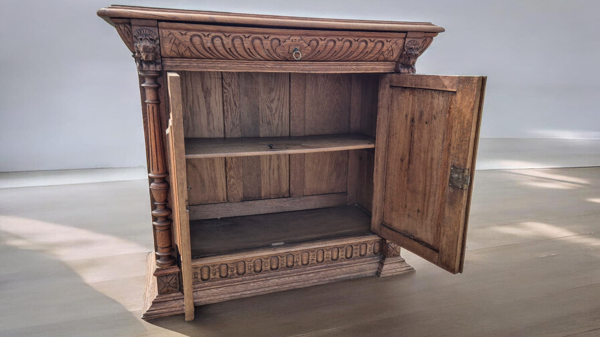 Anyaga tömör tölgyfa, melyet gazdag kézi faragások díszítenek.