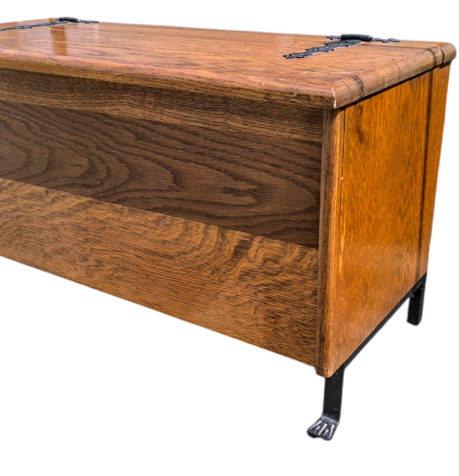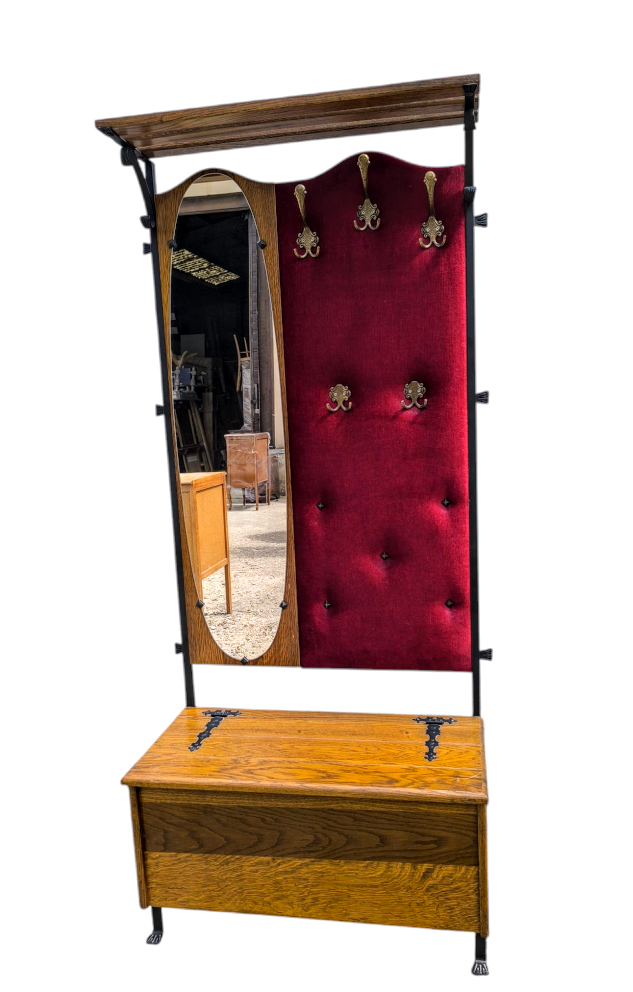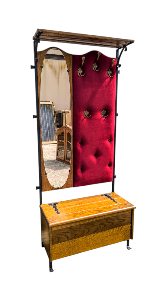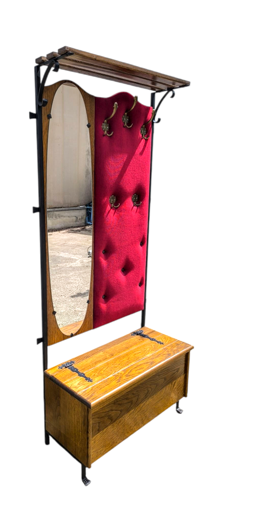 Eladásra kínálunk egy tölgyfa és kovácsolt vas kombinációból készült előszobafalat.