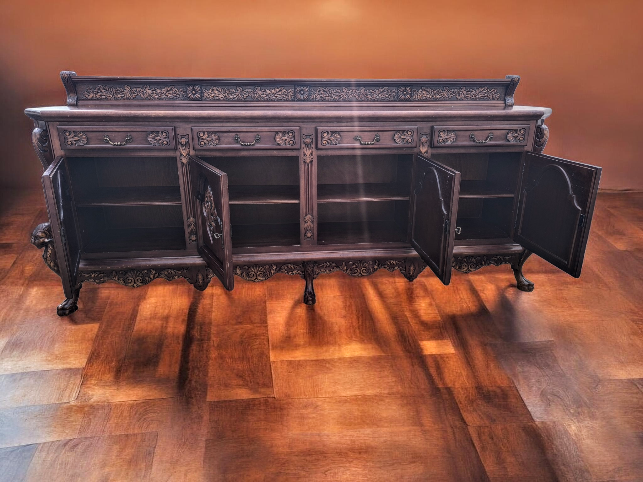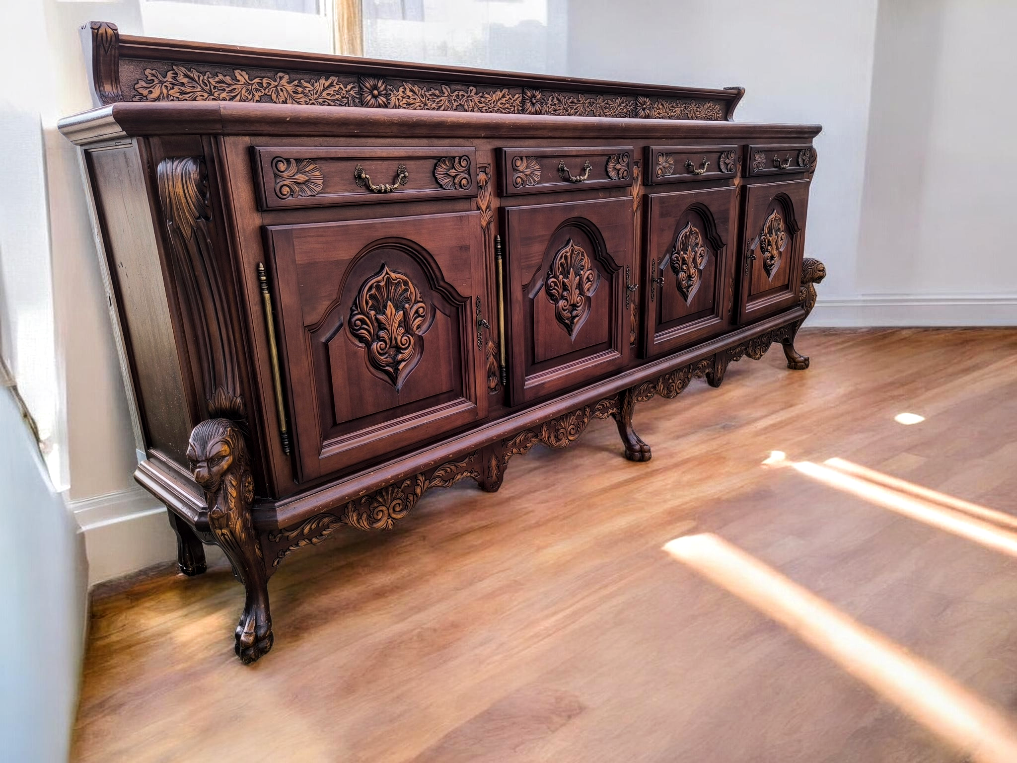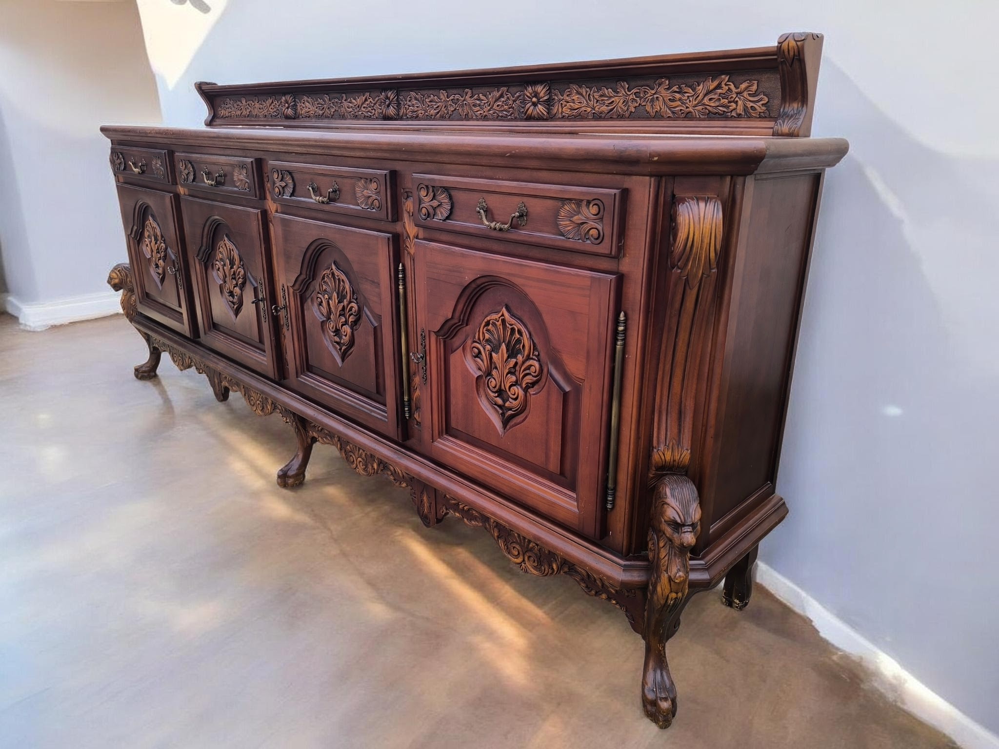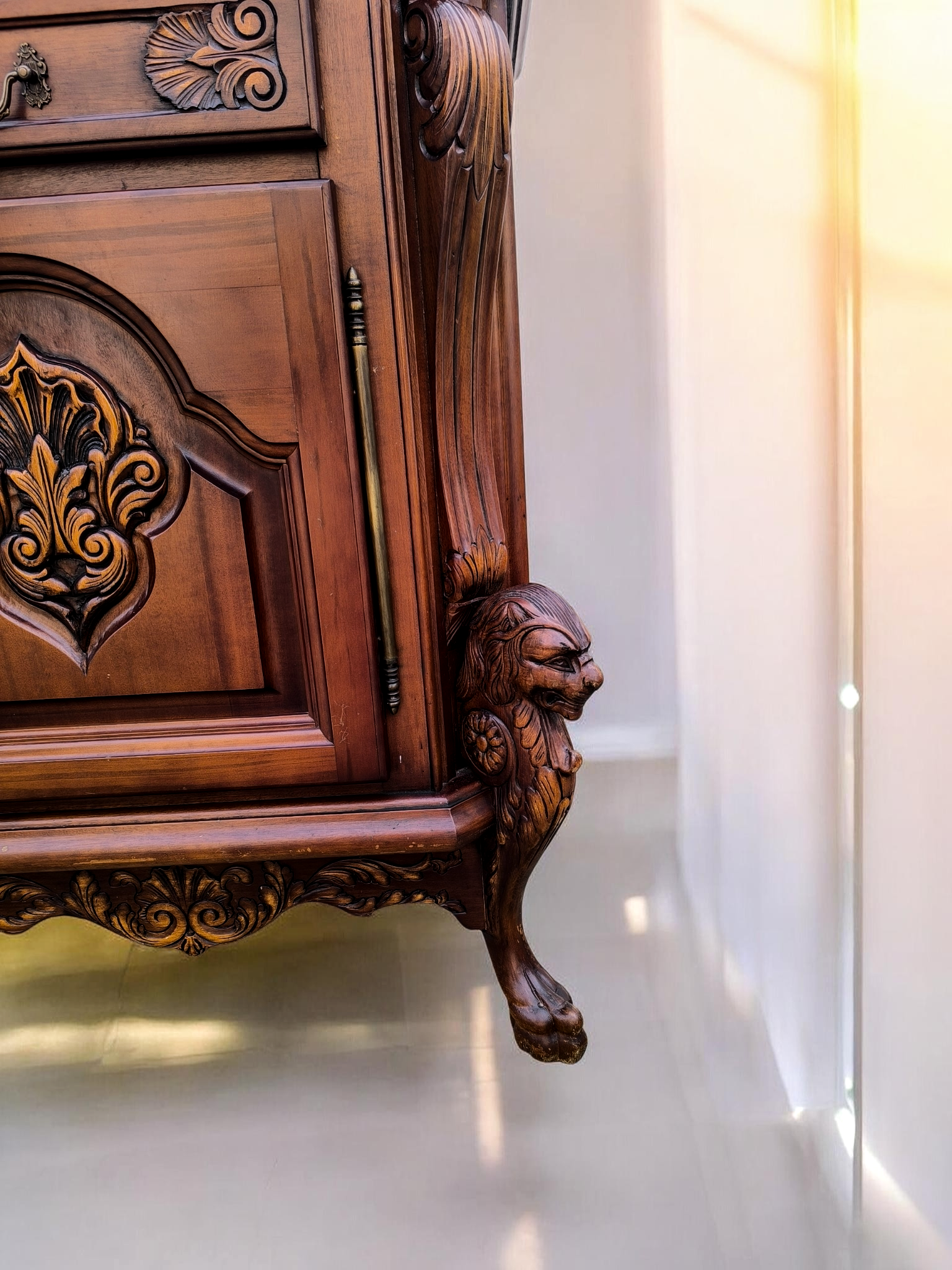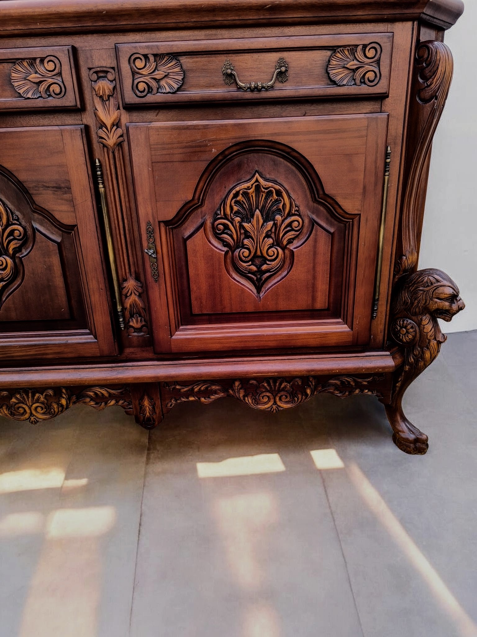 Rendkívül dús, mélyen faragott díszítések az ajtókon és a fiókokon.Különleges, faragott oroszlánmancsos lábak.