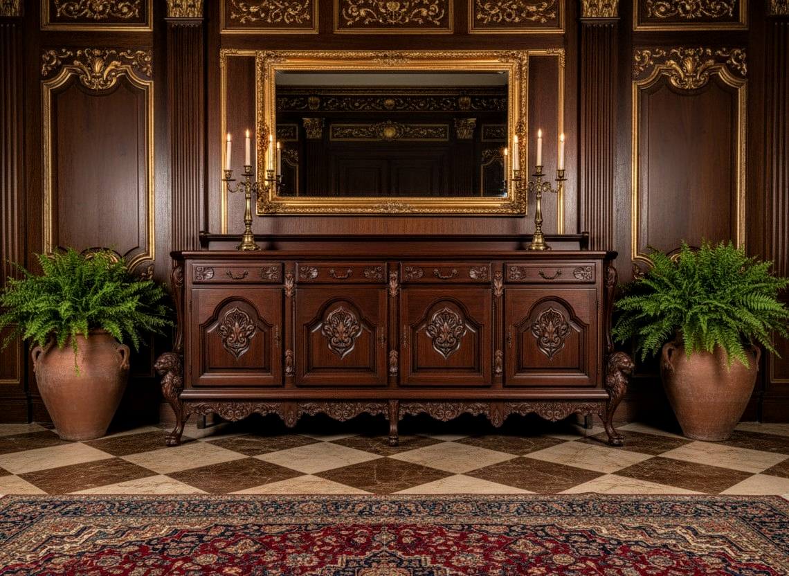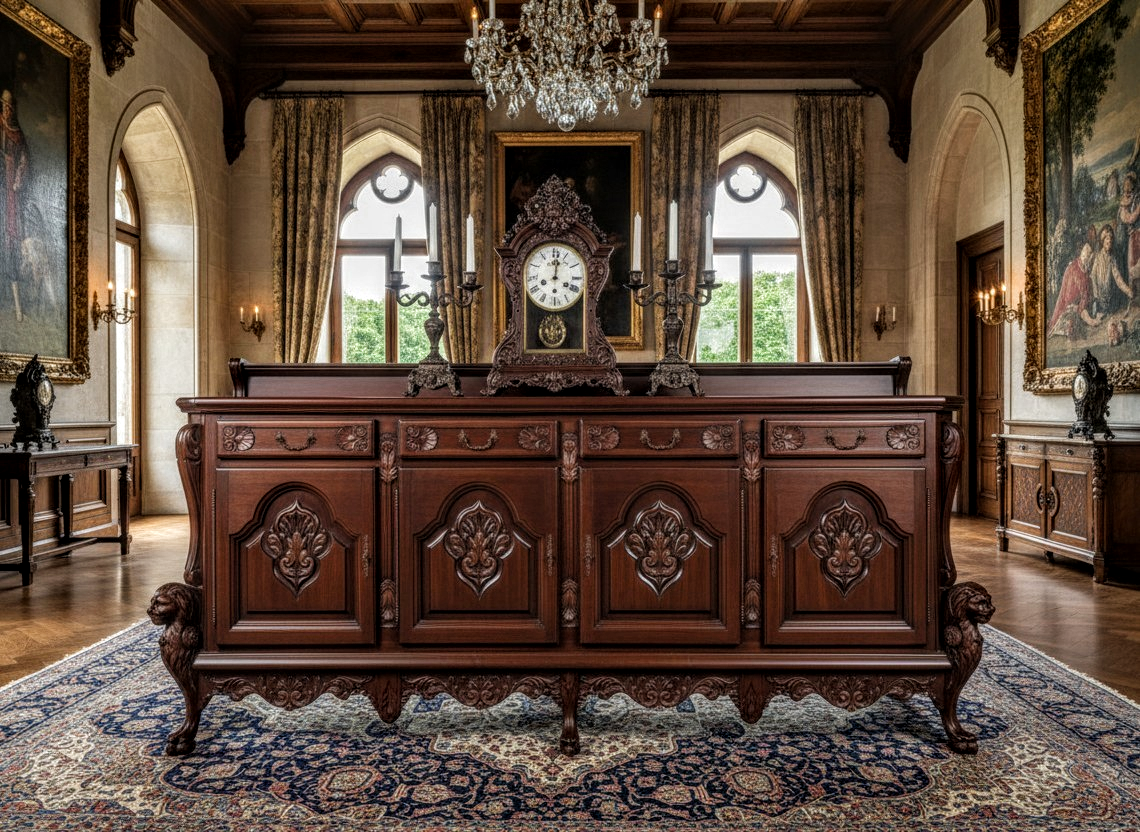 Ez a tálaló egy tekintélyes megjelenésű gazdagon faragott, klasszikus stílusú bútordarab, amelyet leggyakrabban spanyol neoreneszánsz vagy neobarokk stílusúként azonosítanak.