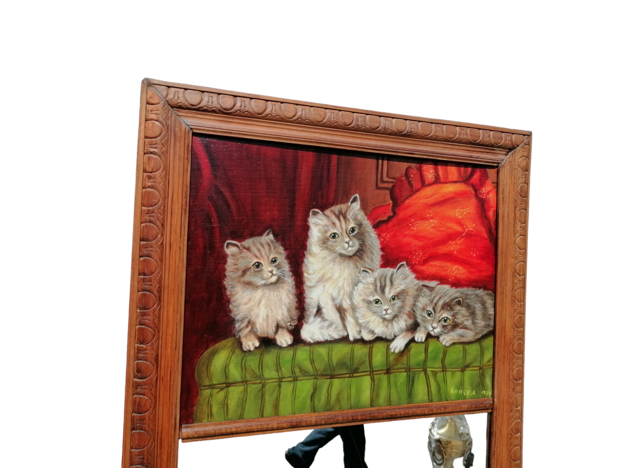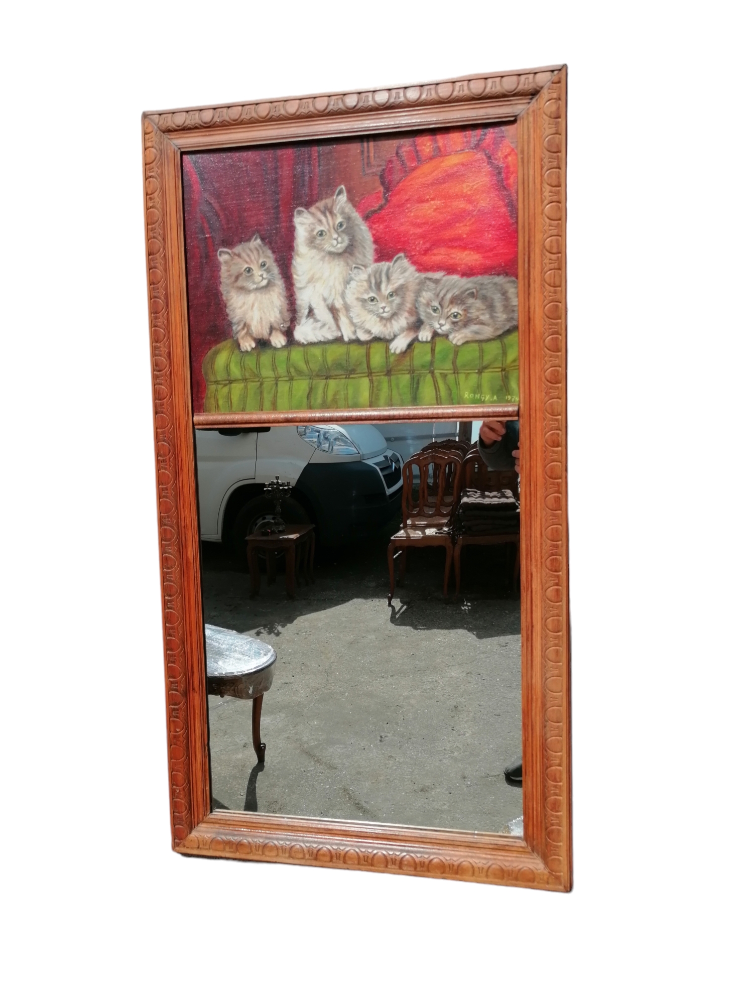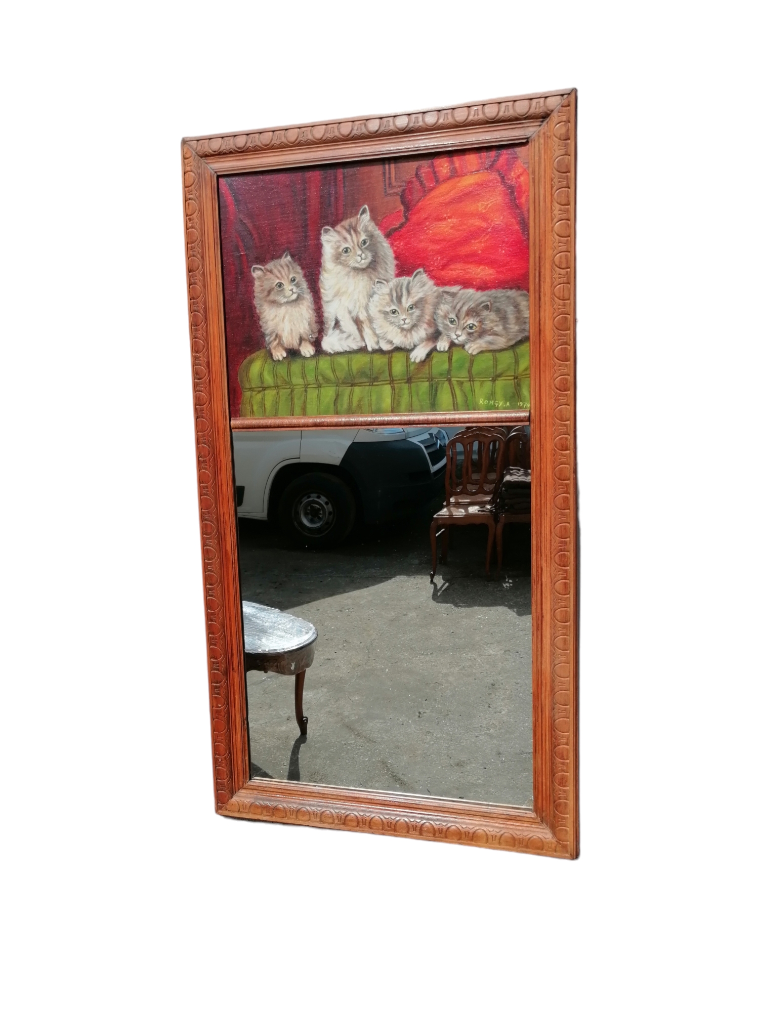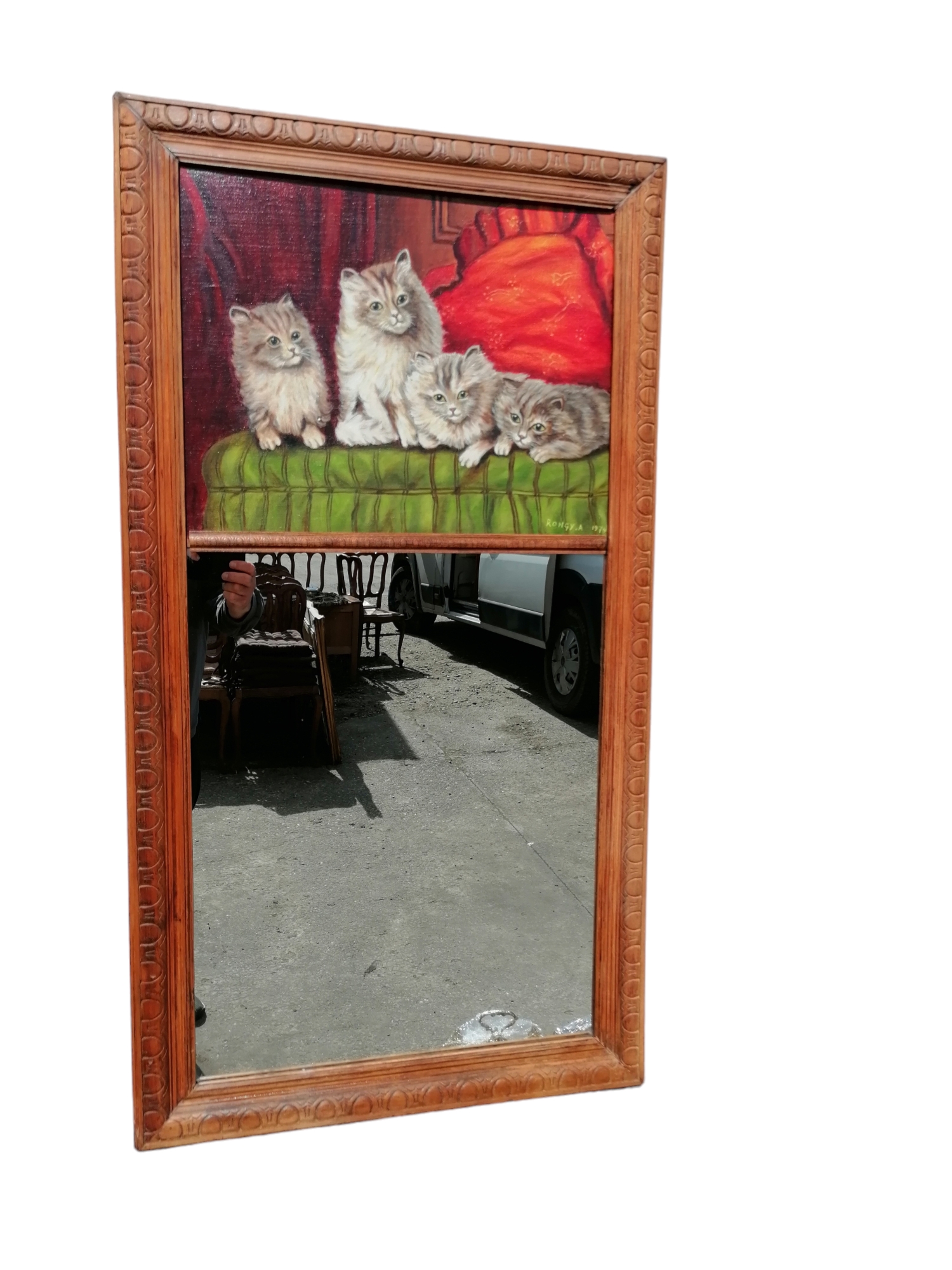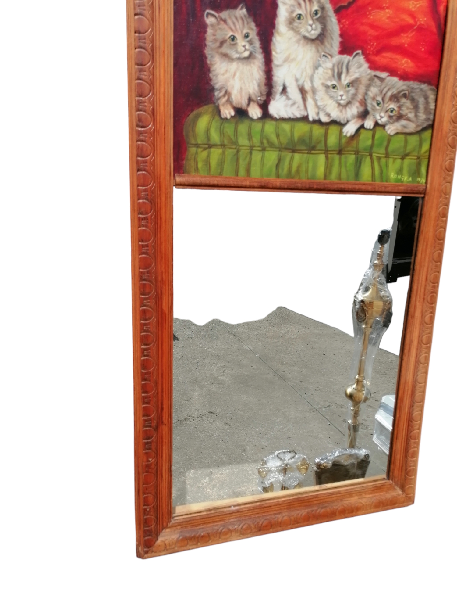 Eladó egy fakeretes tükör melyhez integráltak egy macskákat ábrázoló festményt.