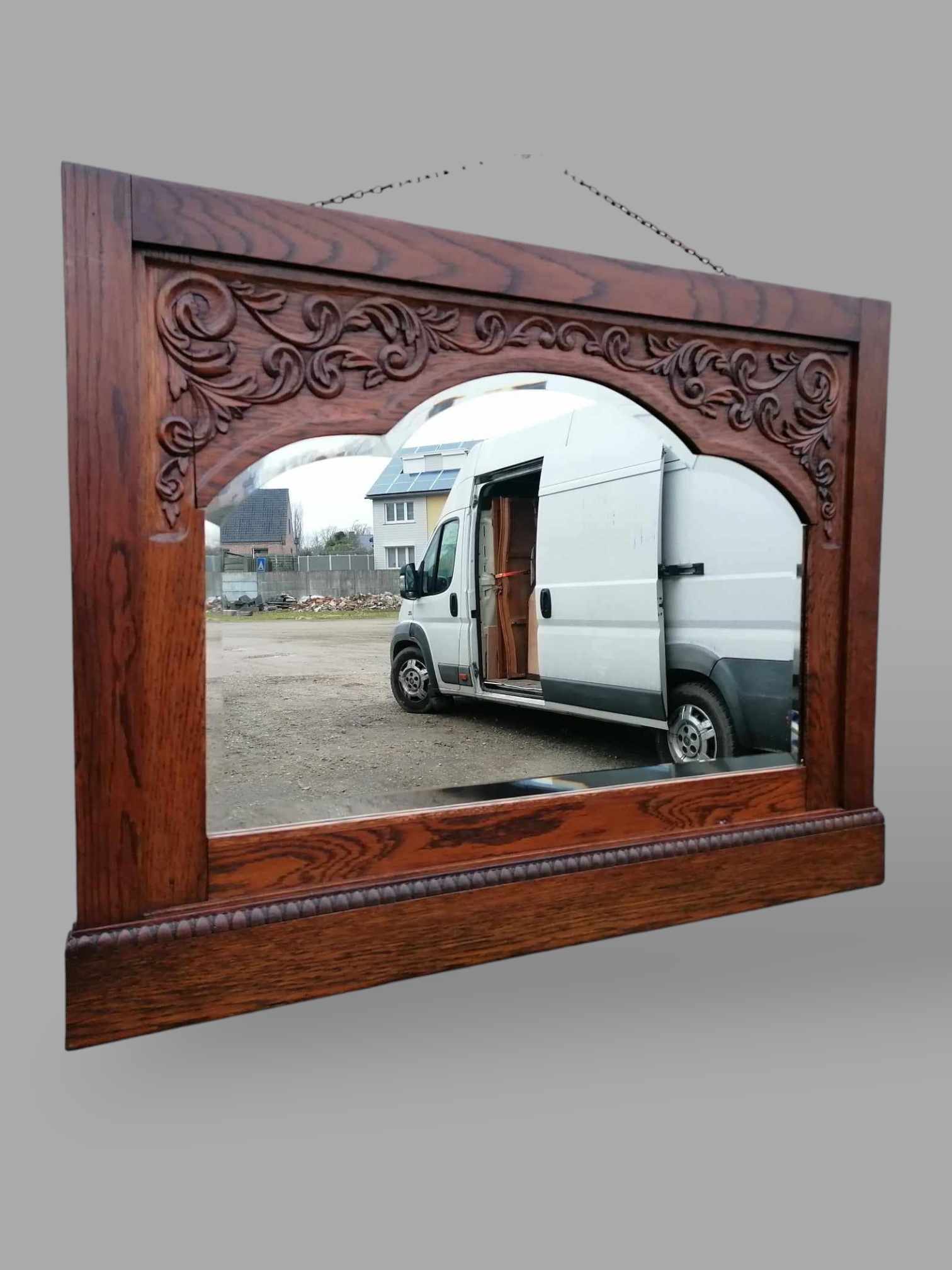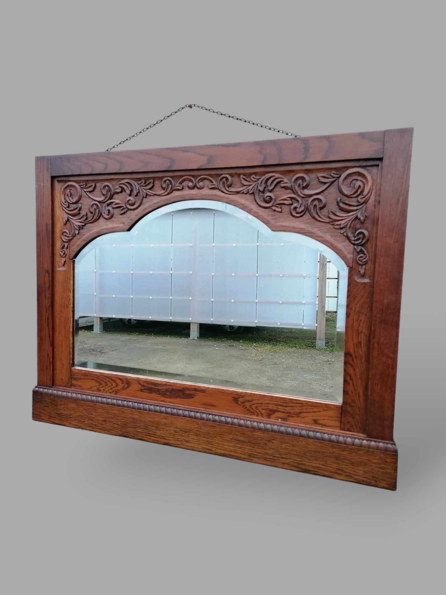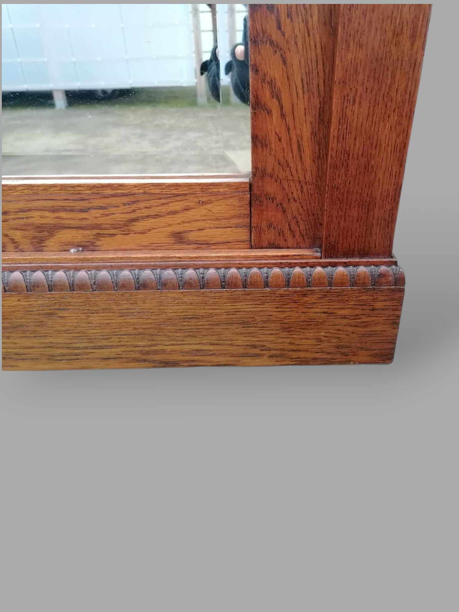 Eladó faragott fa tükör szép állapotban. A keret maga téglalap alakú, benne a tükör ívelt több oldalról a tetején. Tükör széle csiszolt, körülötte felül díszes faragások ékesítik a keretet. Kialakítása, mérete miatt ideális lehet fürdőszobába, vagy konzolasztal fölé.