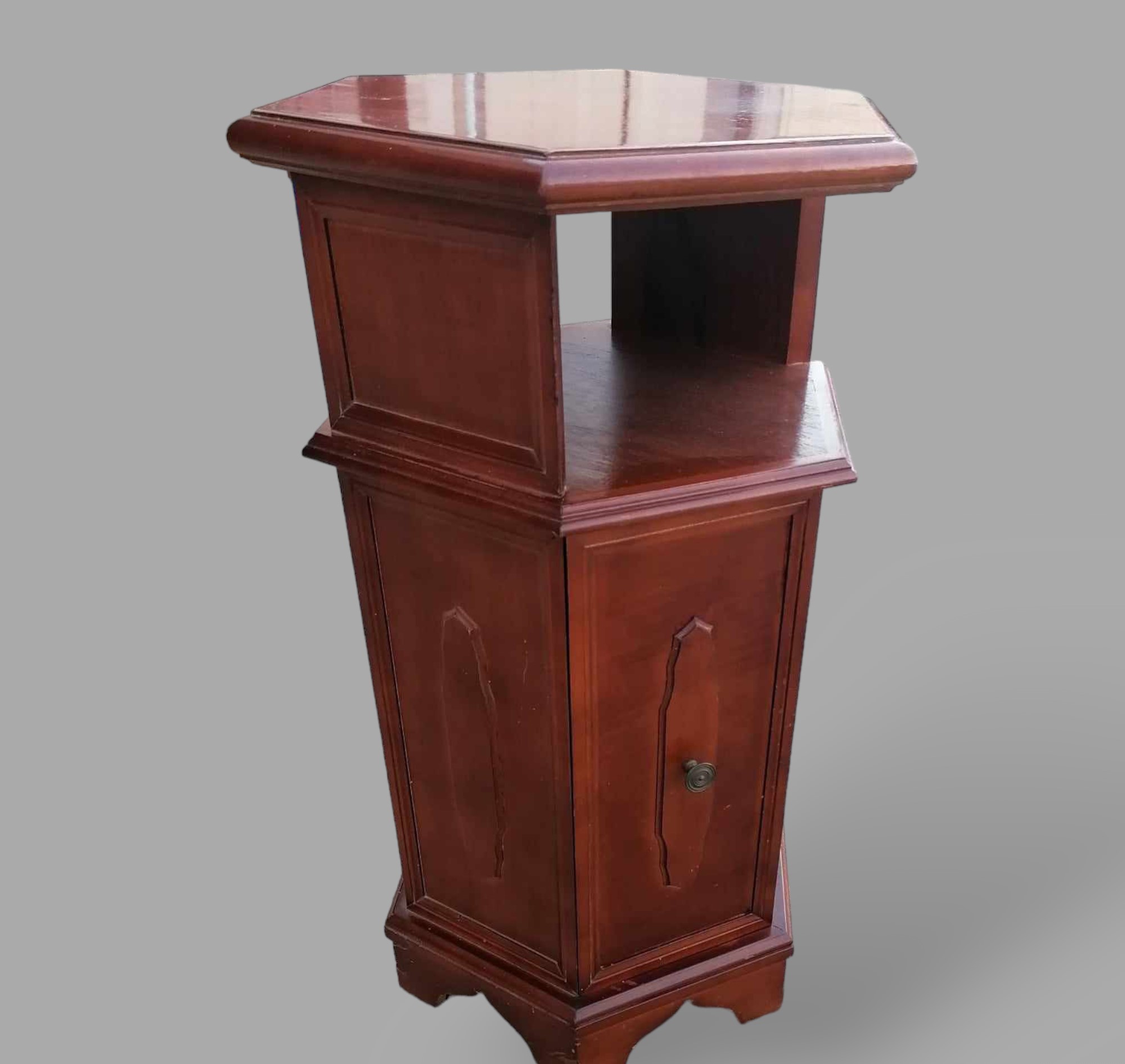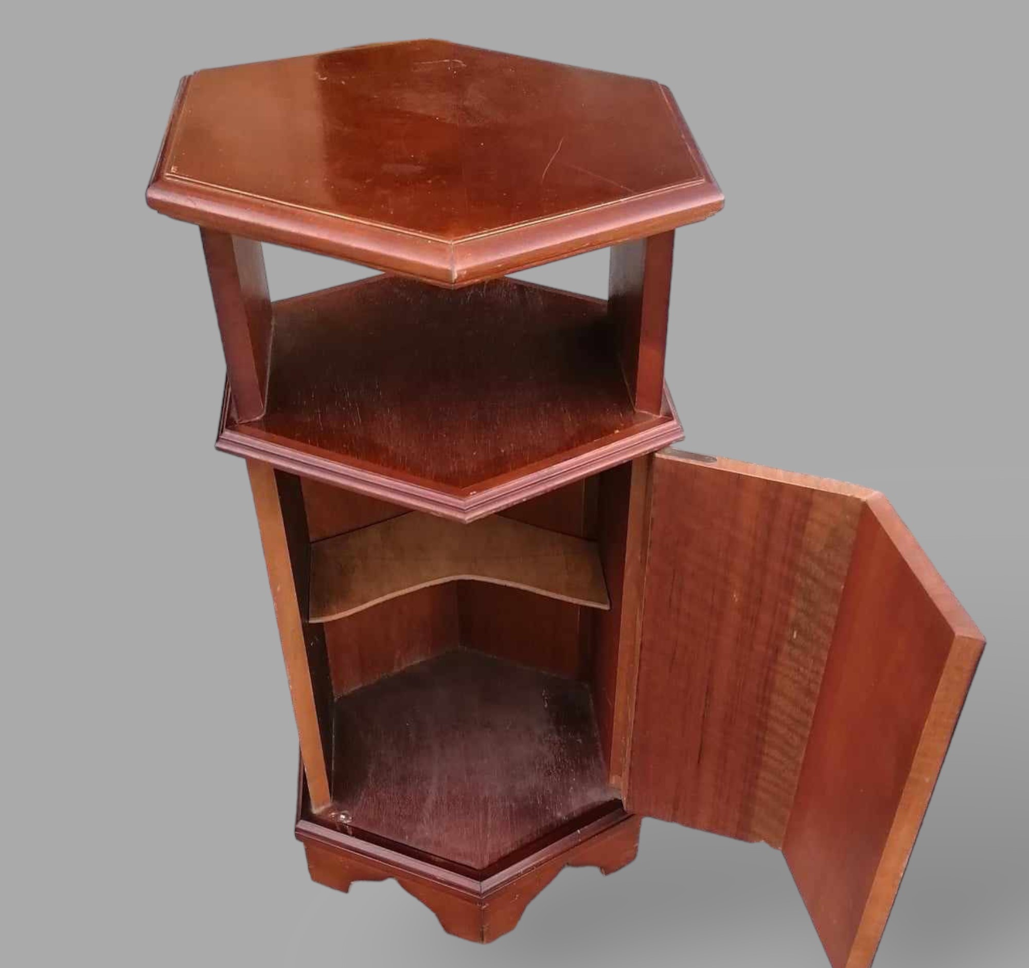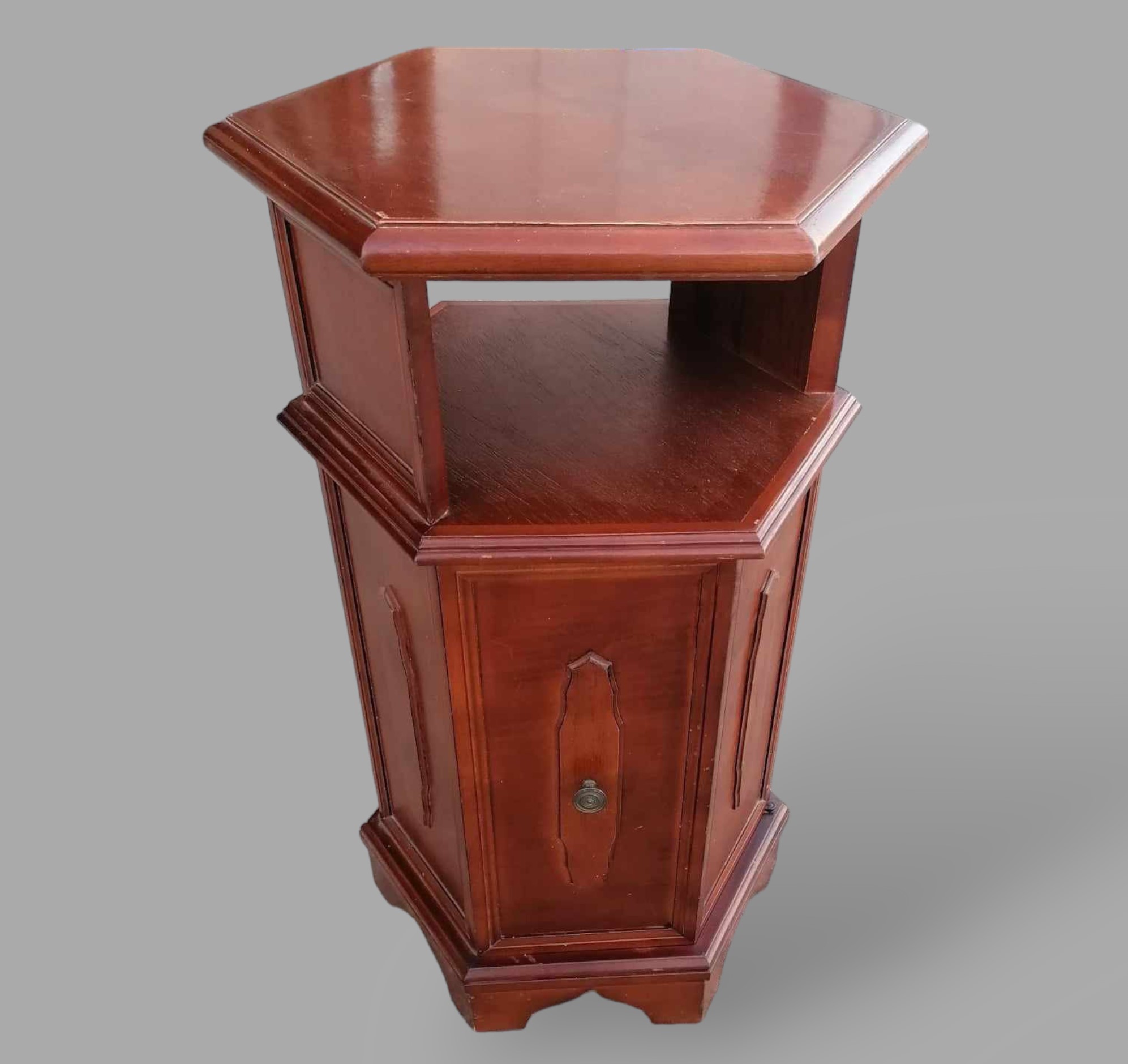 Eladó hatszögletű komód szép állapotban. Minden oldalról esztétikus, így akár térbe is helyezhető. Alul ajtós résszel ami mögött egy polc helyezkedik el, felül nyitott kialakítású.