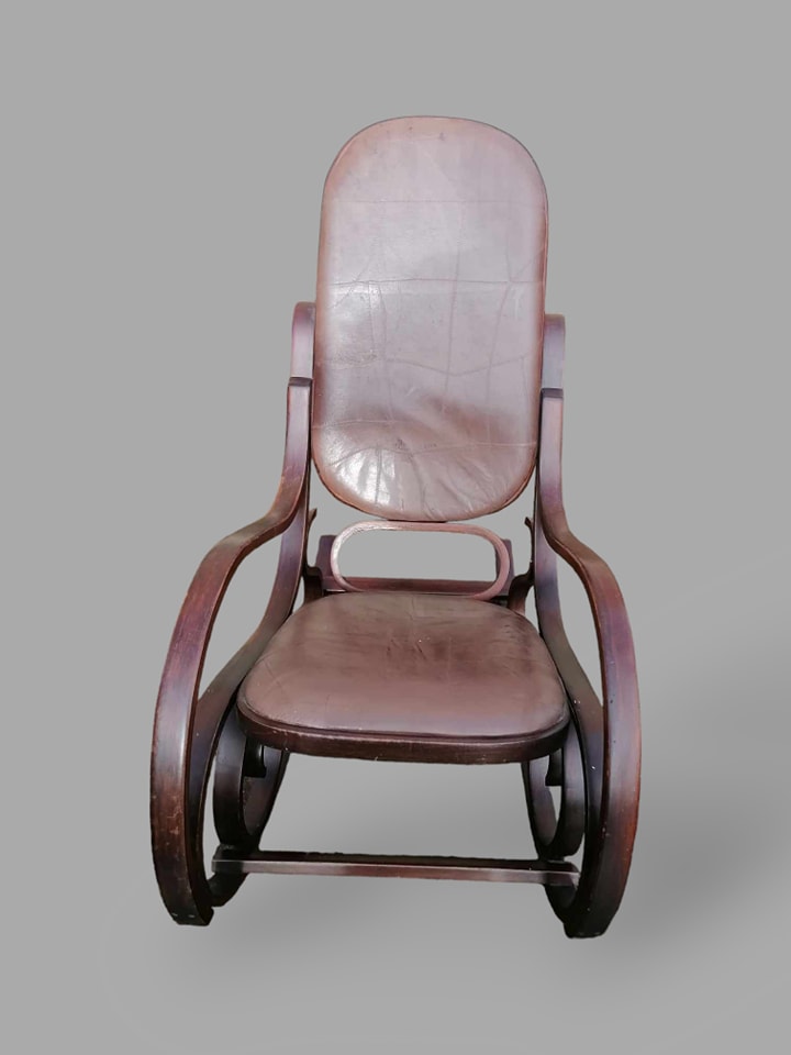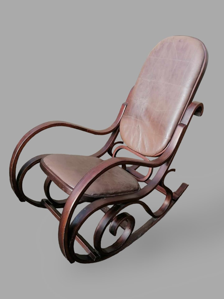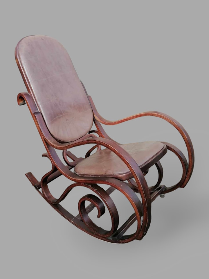 Eladó hintaszék szép állapotban. Minden eleme ívelt, kecses megjelenésű. Bőr ülőlappal és háttámlával, kényelmes kivitel. Ideális lehet nap közbeni pihenéshez, vagy olvasósarokba.