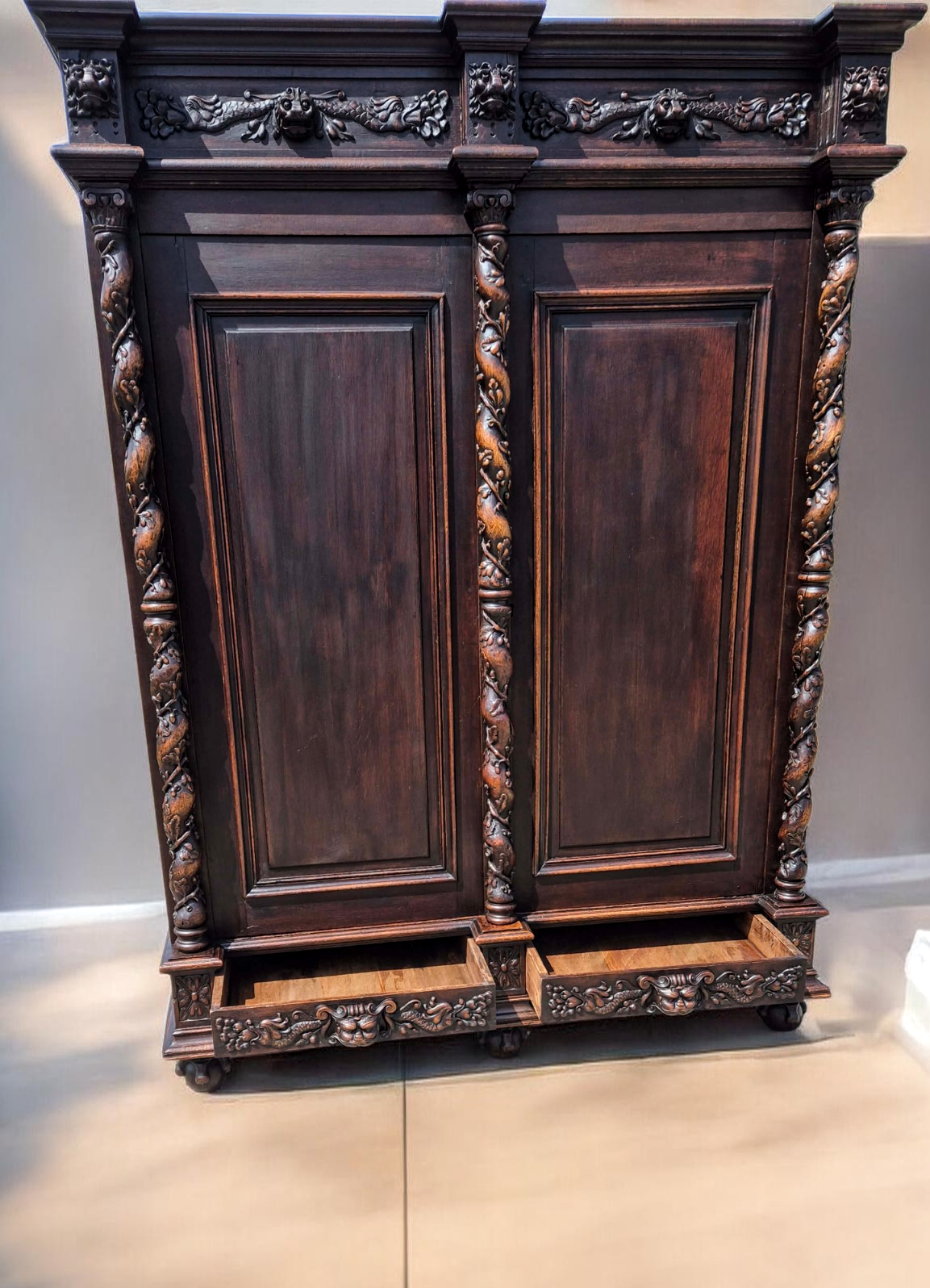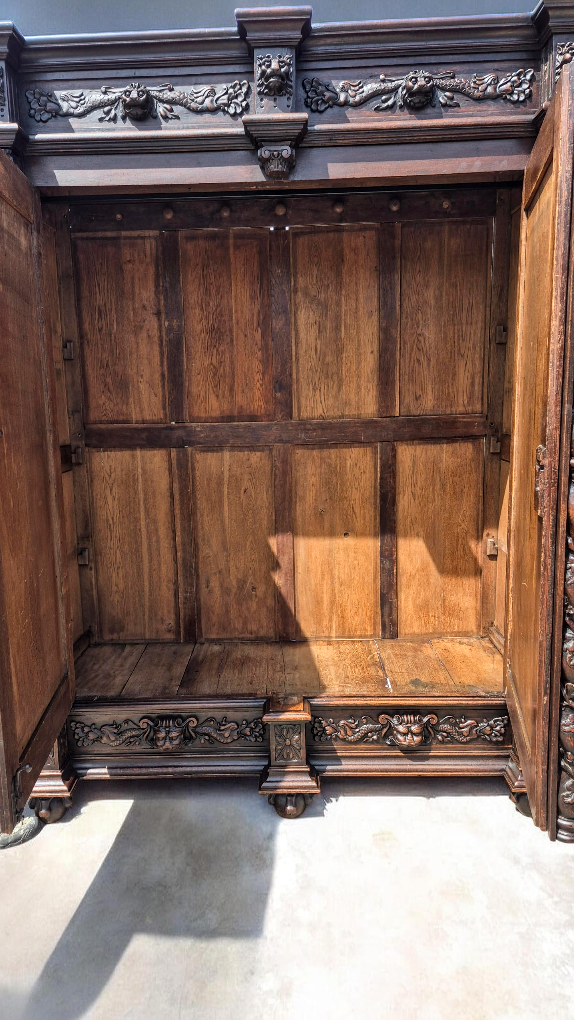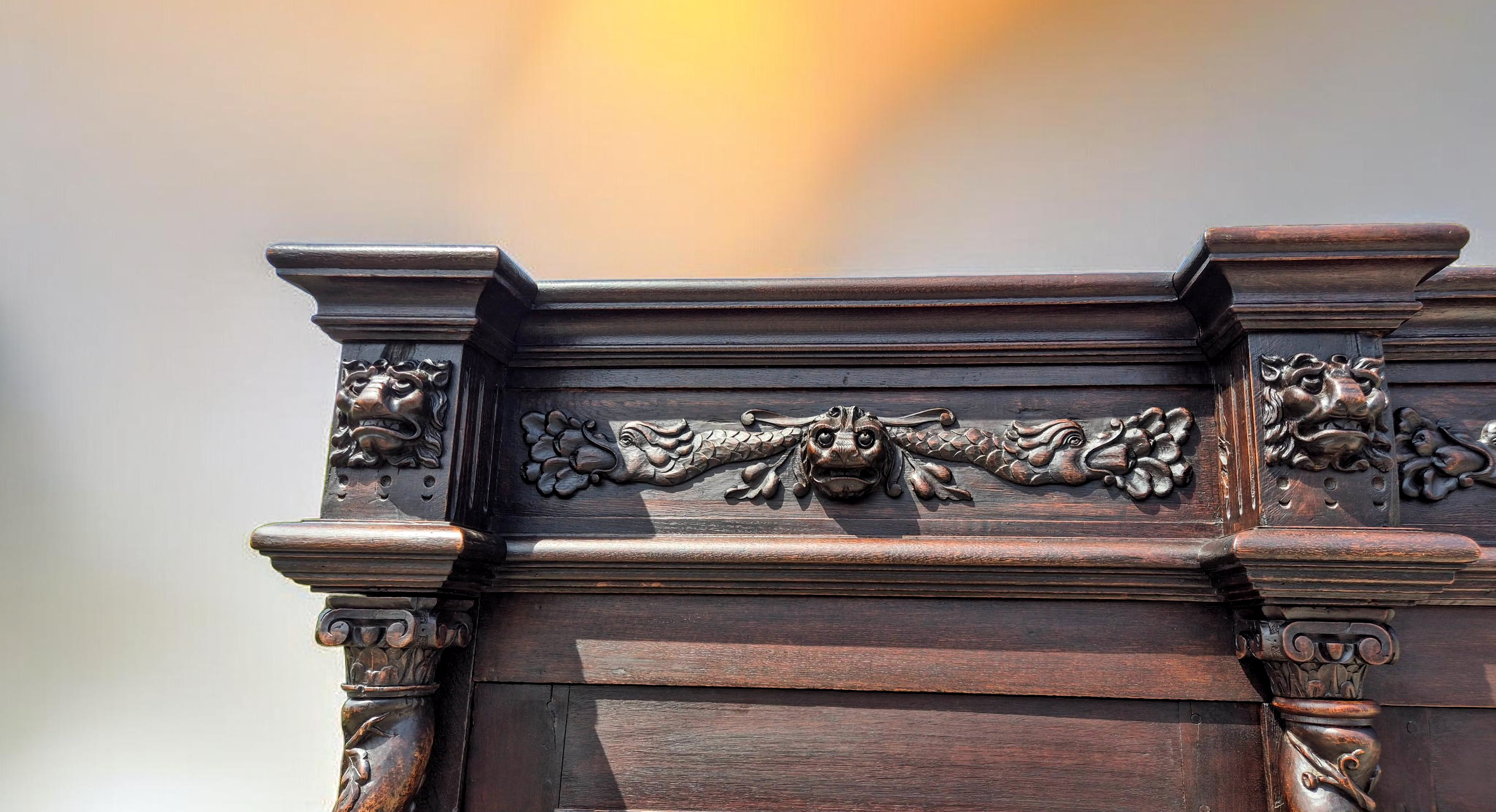A szekrény frontját dúsan faragott maszkaronok (groteszk fejek), mitológiai motívumok és akantuszlevelek díszítik.