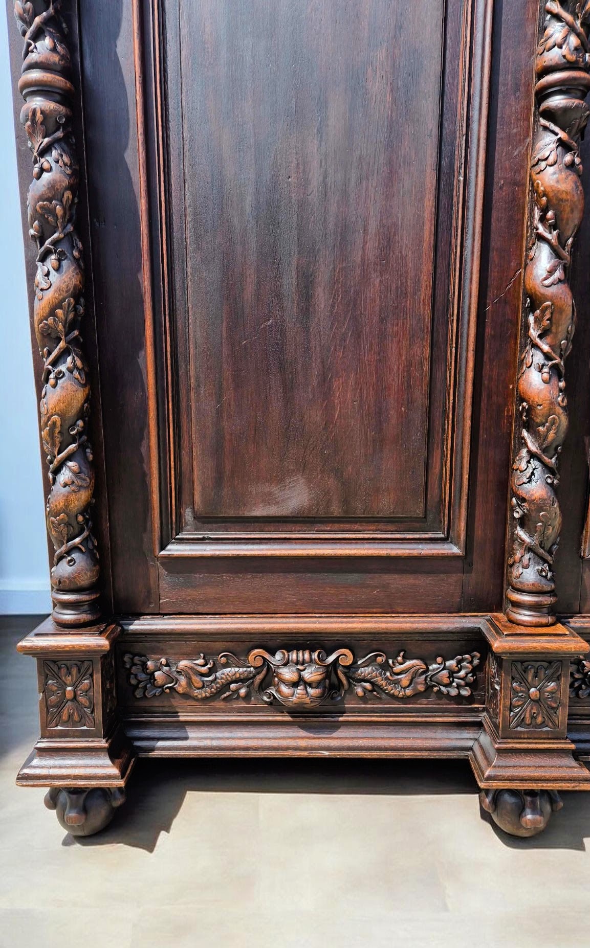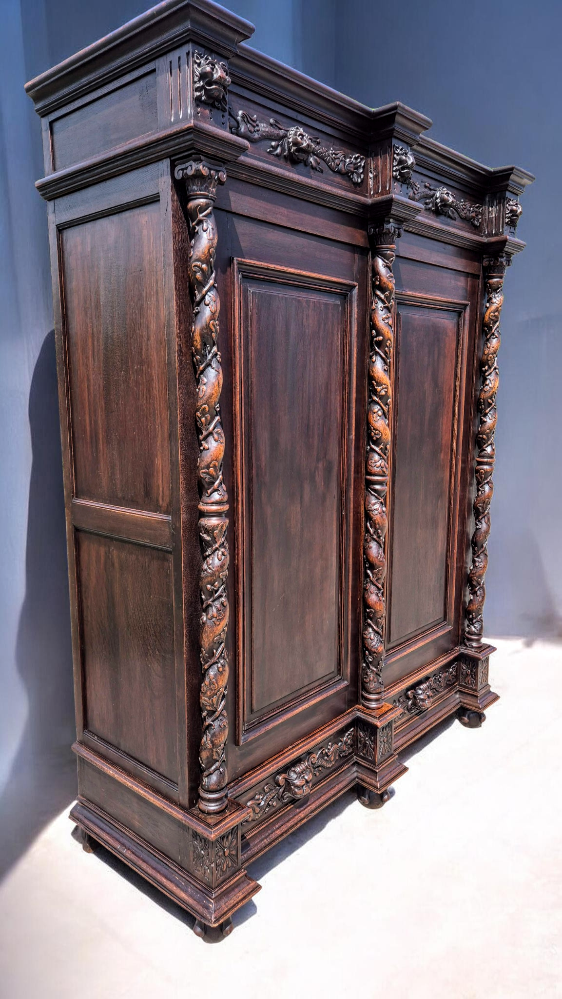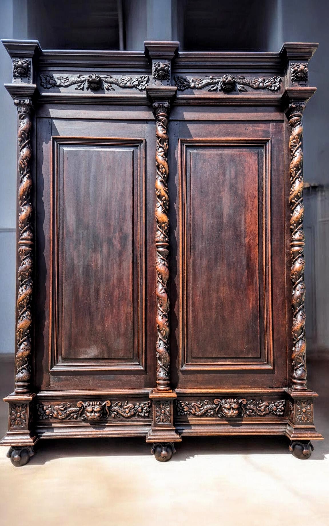 A szekrény frontját dúsan faragott maszkaronok (groteszk fejek), mitológiai motívumok és akantuszlevelek díszítik.