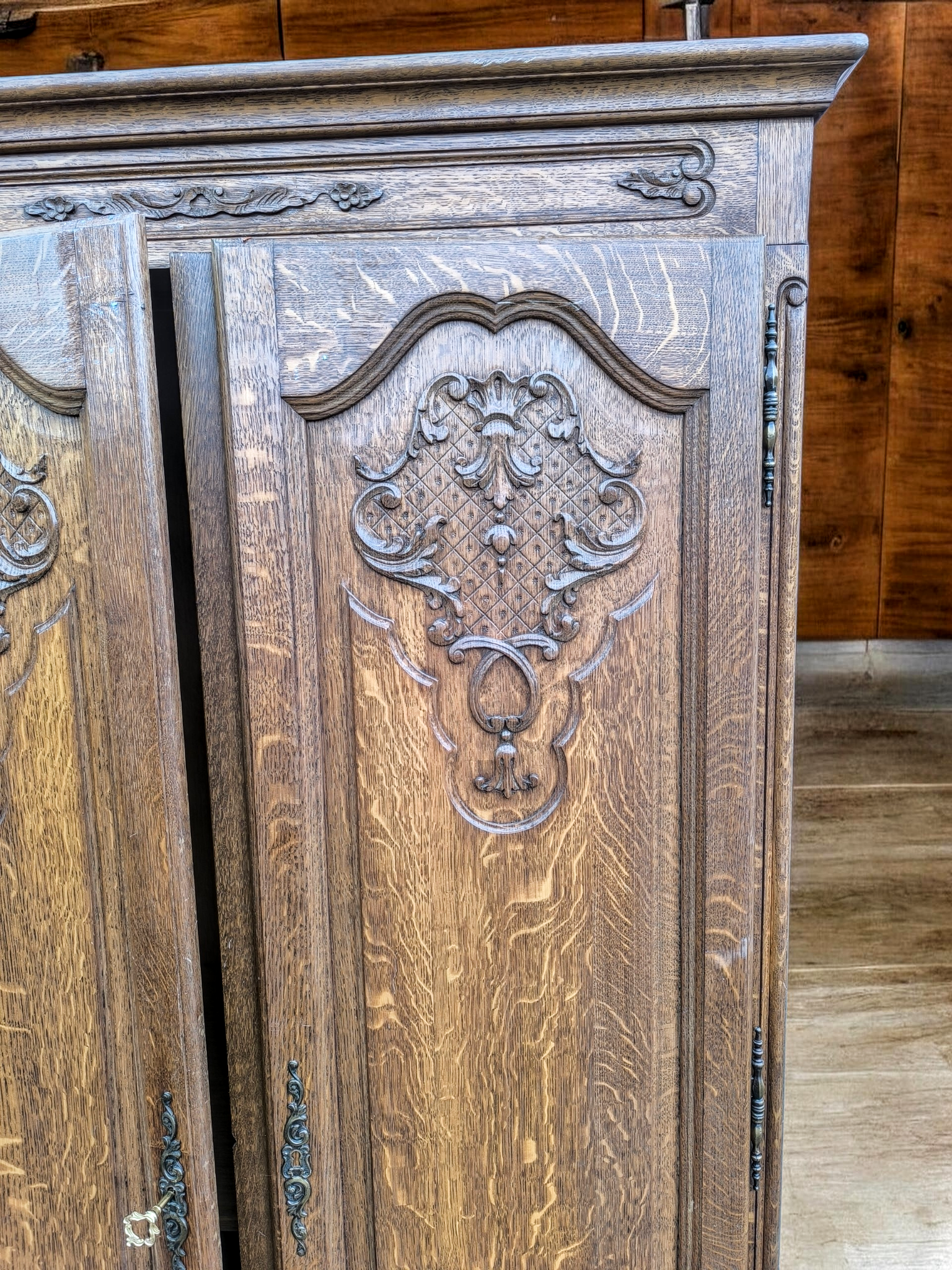 Díszítés: Kézzel faragott virágmotívumok, hullámos vonalvezetés és eredeti réz veretek/kulcsok.