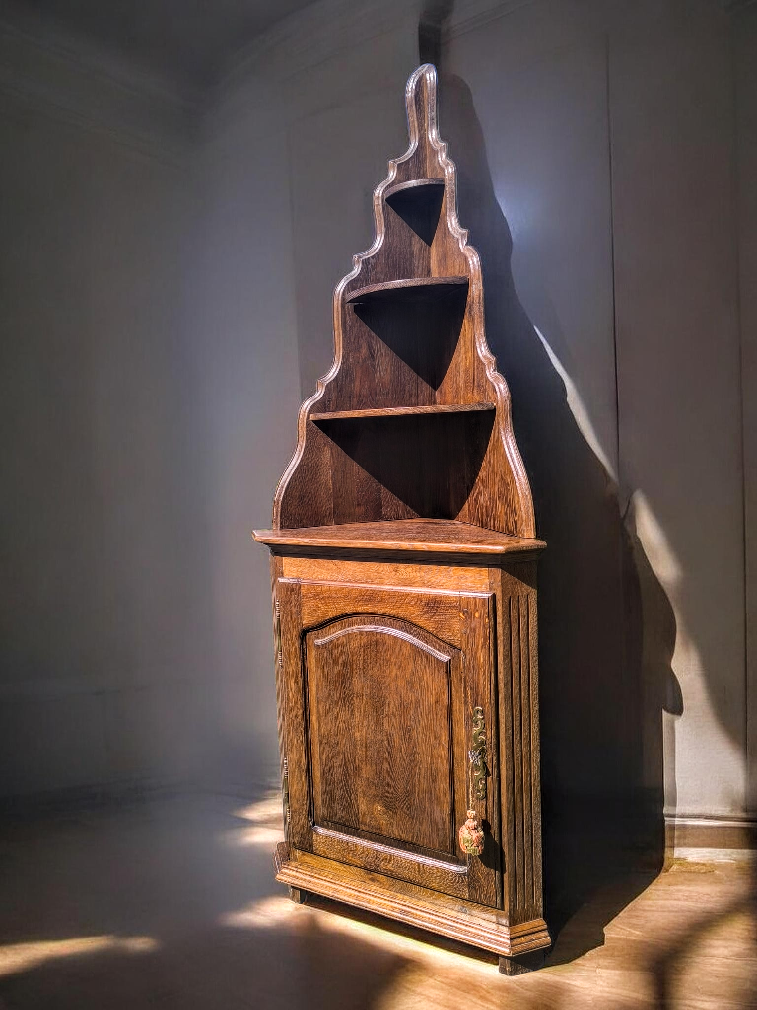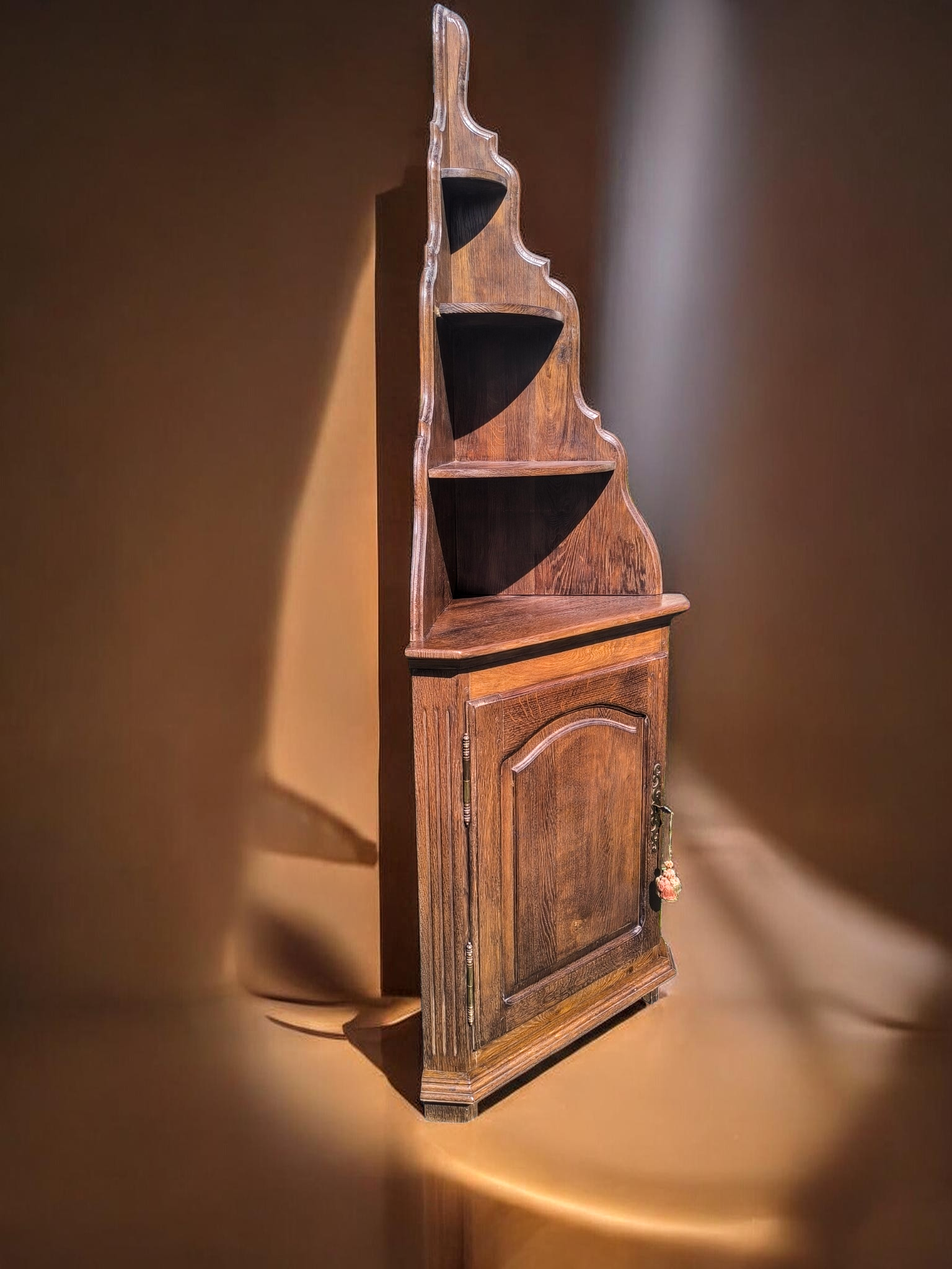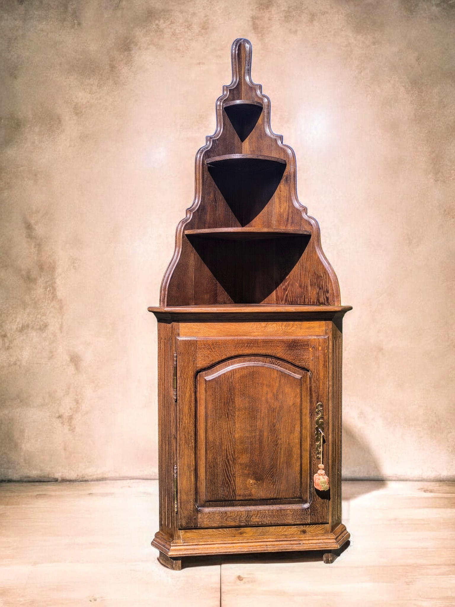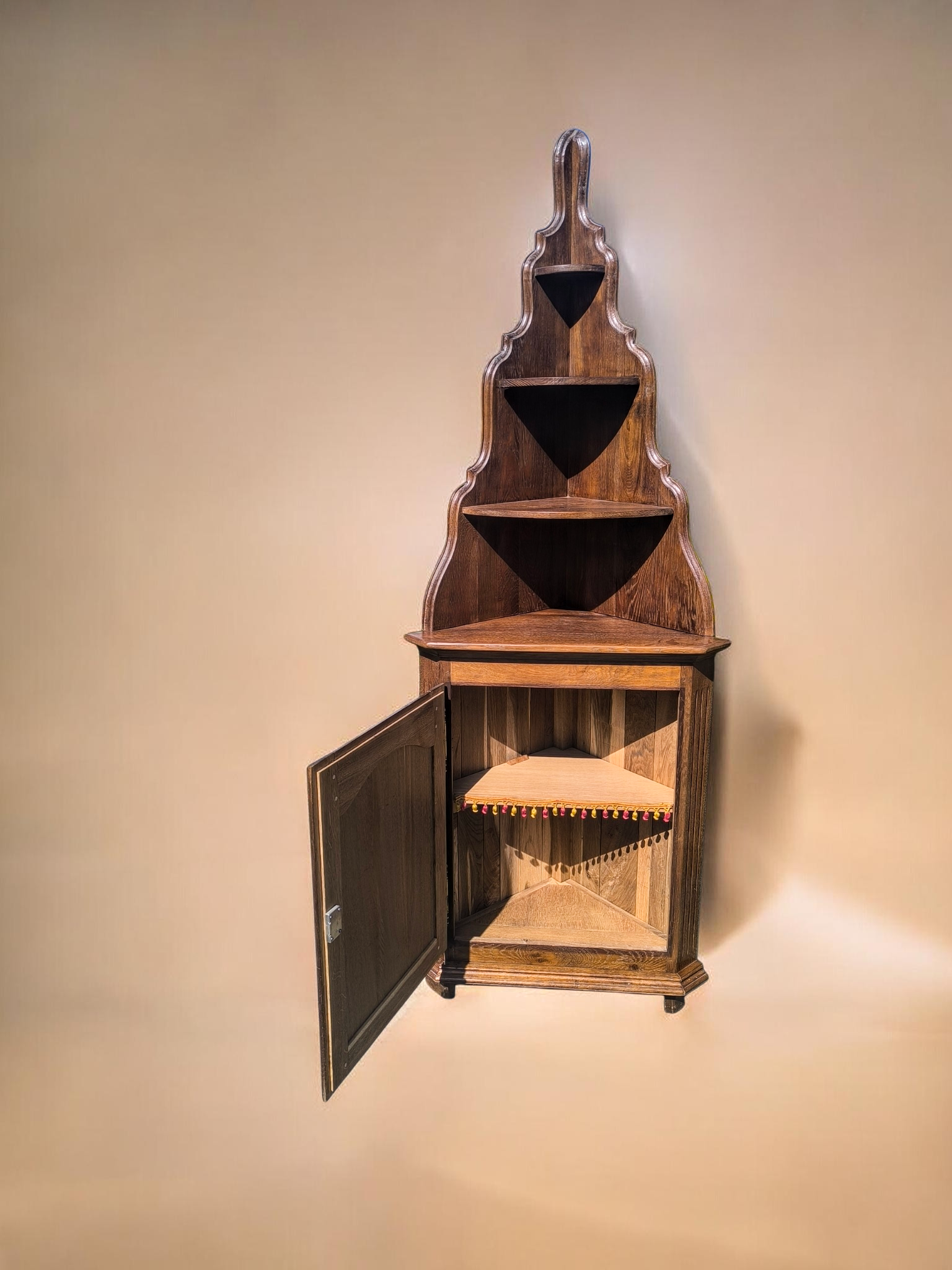 A bútor két részből áll: egy zárt, faragott ajtós alsó szekrényből és egy dekoratív, íves kialakítású, nyitott felső polcrendszerből.