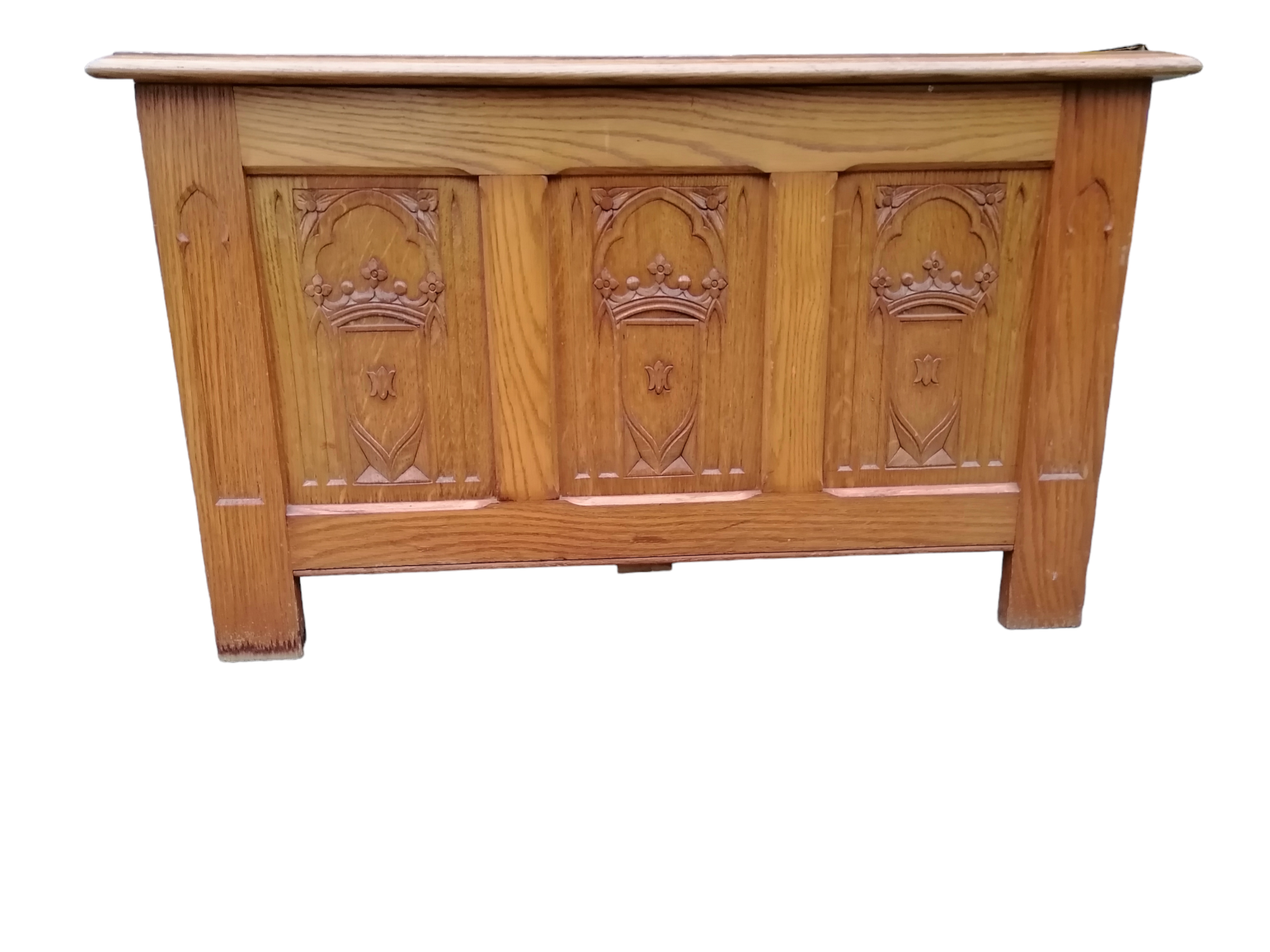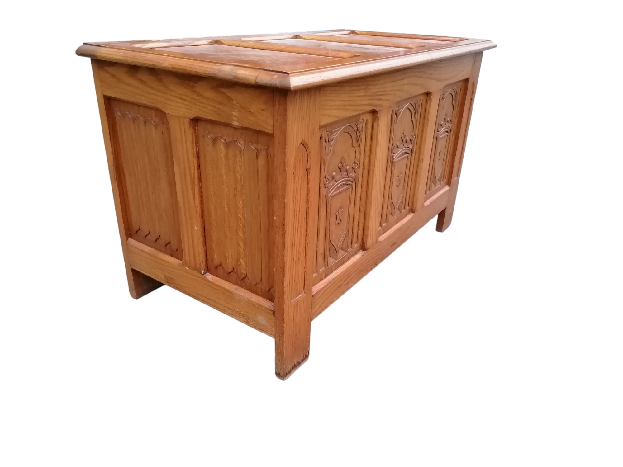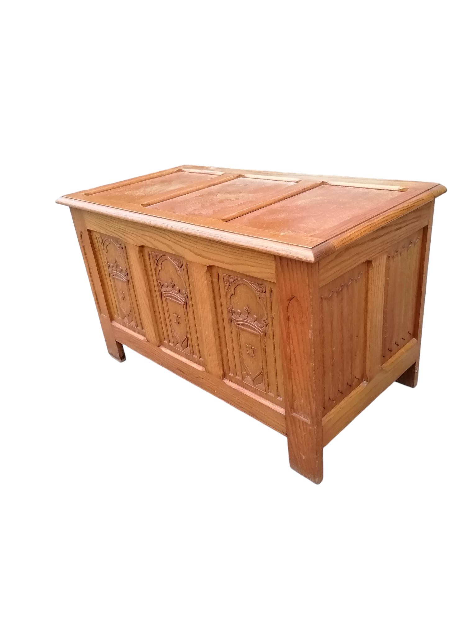 Eladó faragott fa láda szép állapotban. Elől három betét található, amelyben díszes motívumok vannak megjelenítve. A láda teteje kinyitható, belülről kulturált, így akár tárolásra is alkalmas. Méretéből adódóan ideális lehet párnával akár padnak is.