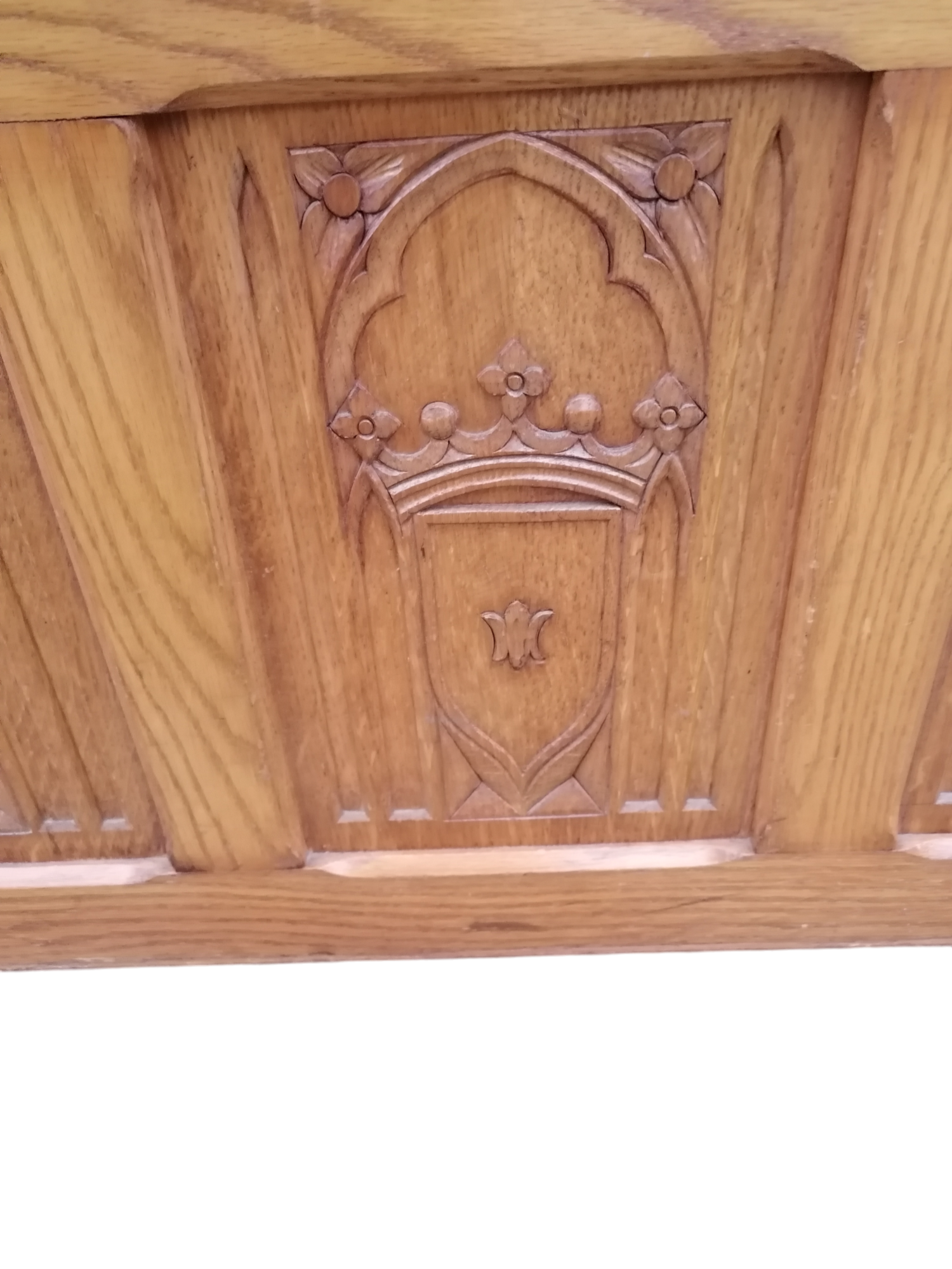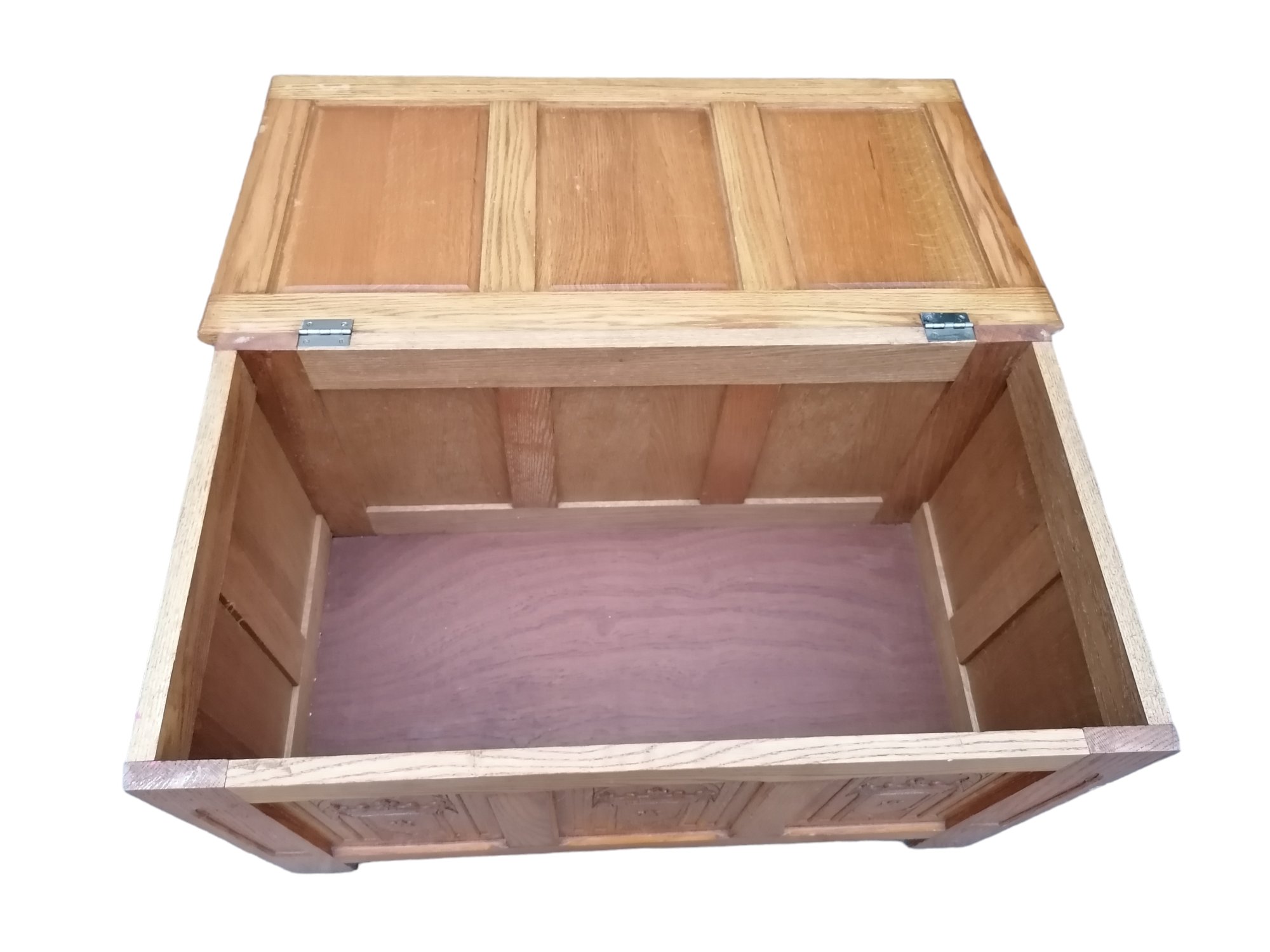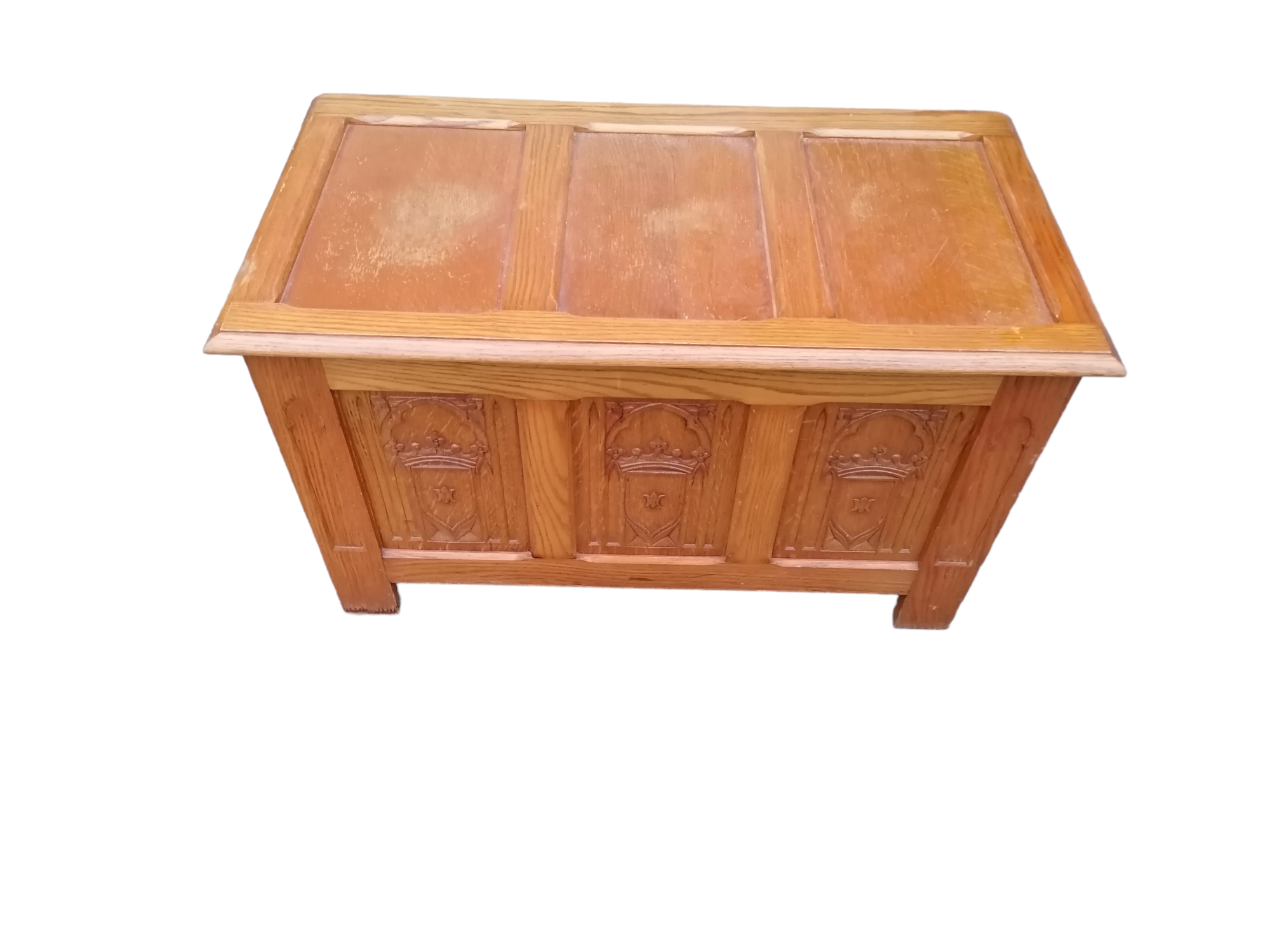 Eladó faragott fa láda szép állapotban. Elől három betét található, amelyben díszes motívumok vannak megjelenítve. A láda teteje kinyitható, belülről kulturált, így akár tárolásra is alkalmas. Méretéből adódóan ideális lehet párnával akár padnak is.