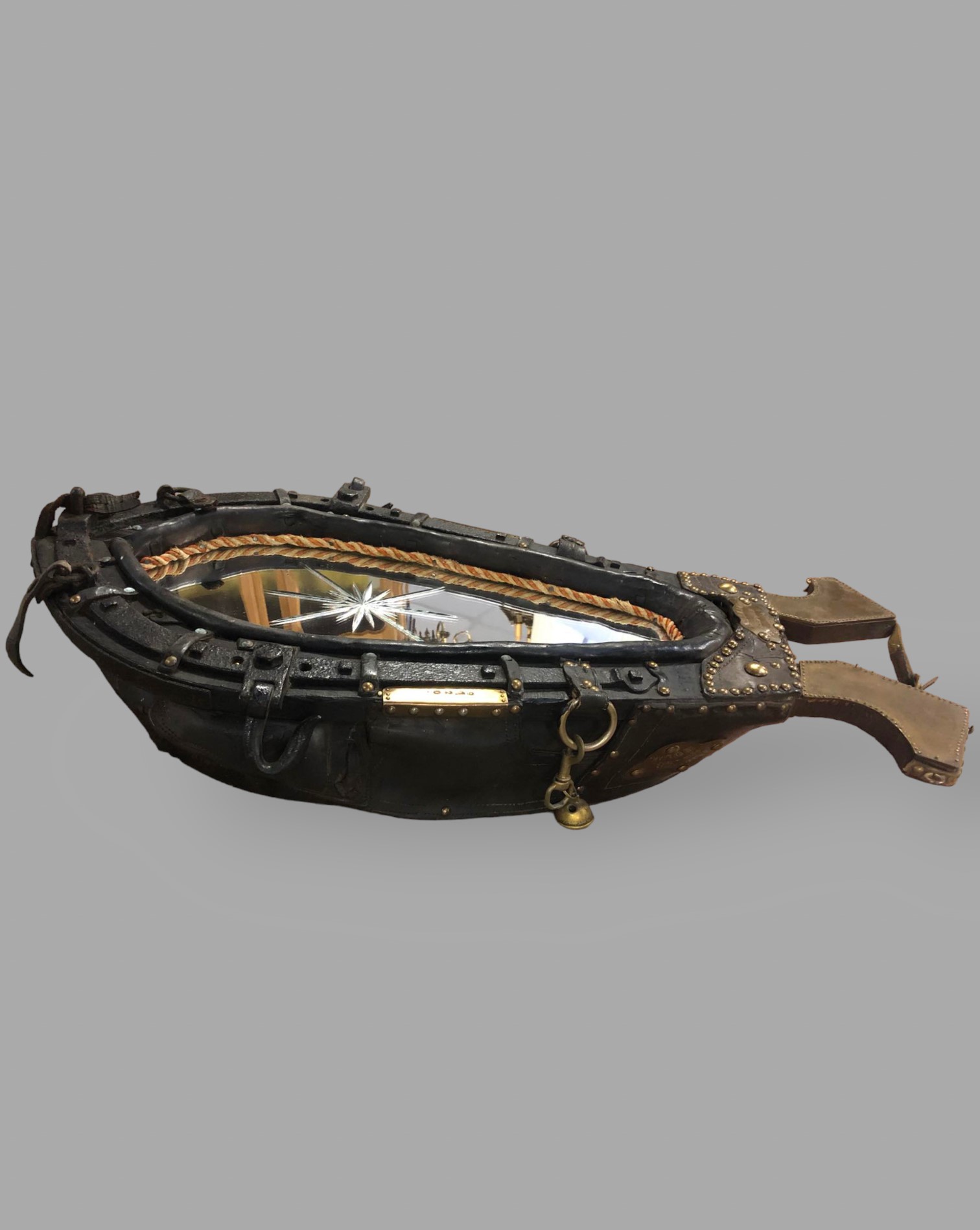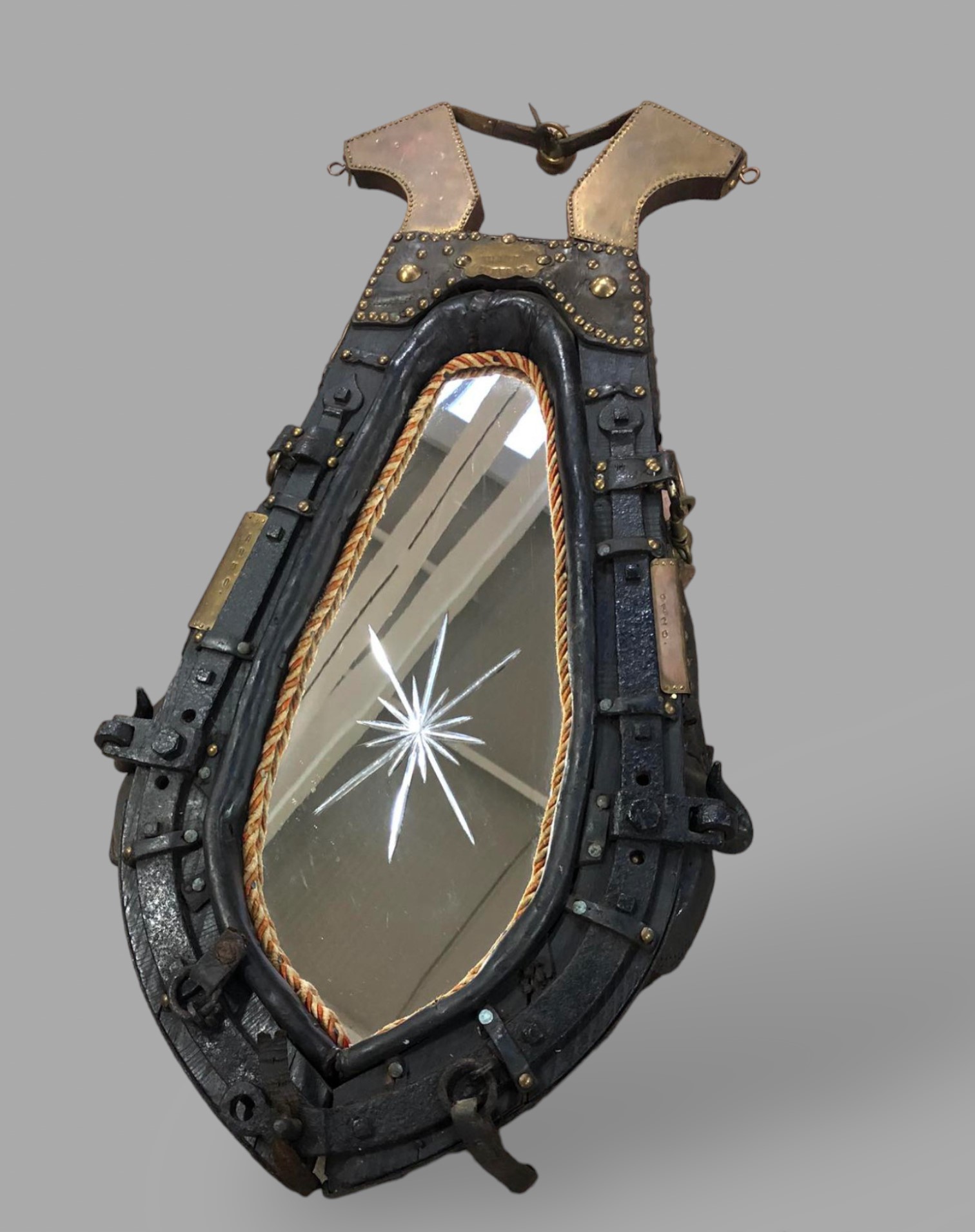 Eladó lószerszám, hám tükör betéttel szép állapotban. Különleges elgondolás a keretnek ilyen formában. Középen a tükörben plusz csiszolás található. Ajánljuk a lovak szerelmeseinek, egyedi dekorációs darab lehet.